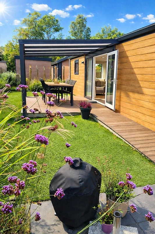 Der sonnige Garten mit Südlage verfügt über eine überdachte und beleuchtete Terrasse, Liegestühle und einen Kamado-Grill. Dank grüner Bepflanzung genießt man Privatsphäre, das Chalet liegt ruhig am Ende einer Sackgasse und ist kindersicher. Zwei Fahrräder stehen zur Verfügung, schöne Radwege führen durch die Umgebung. Ein Bollerwagen mit Strandstühlen, Sonnenschirm und Spielzeug sorgt für Freizeitspaß. Schnelles WLAN und ein eigener Parkplatz in kurzer Entfernung sind vorhanden. Der Strand ist fußläufig erreichbar, perfekt für Spaziergänge, Radtouren oder entspannte Strandtage.