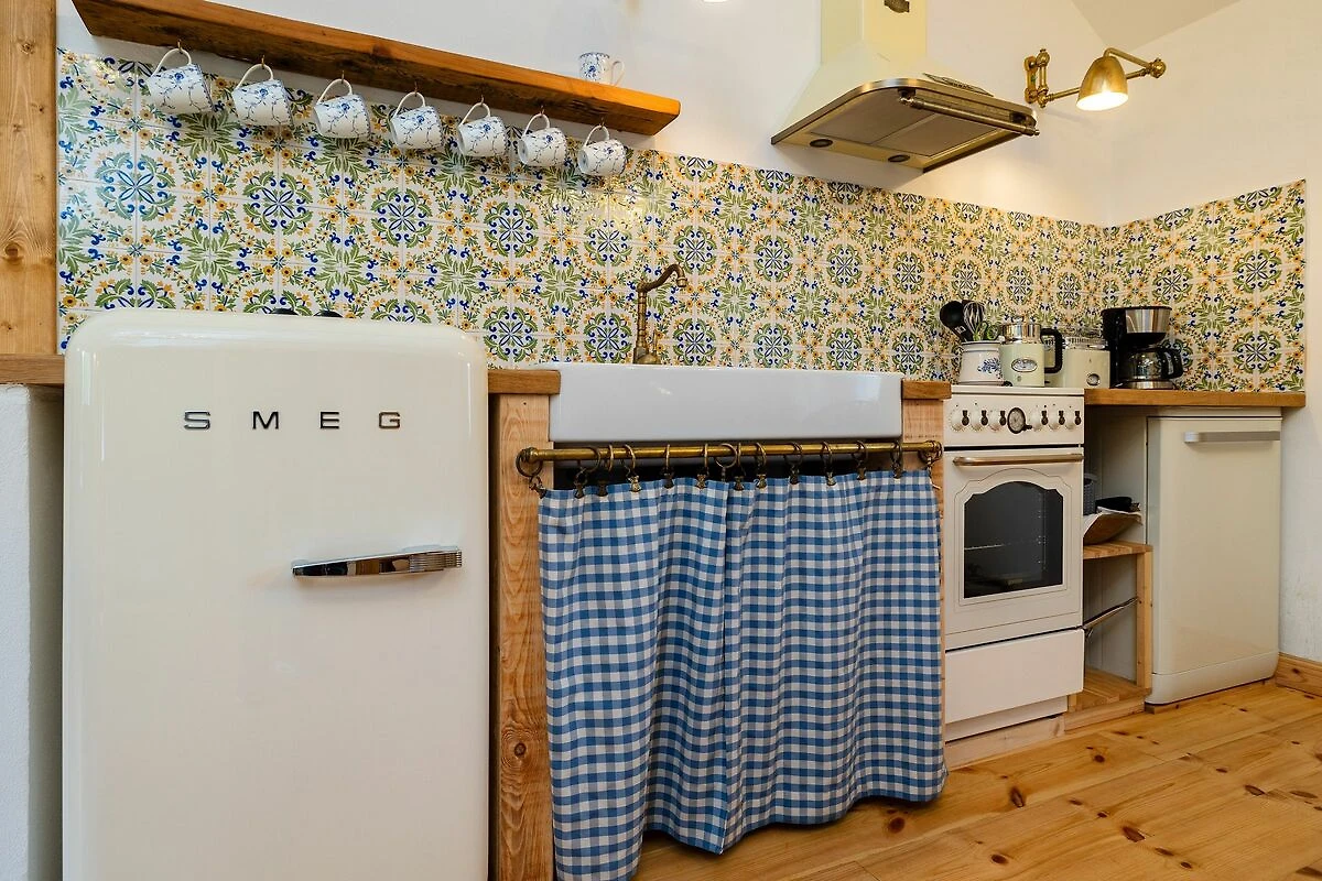 KÜCHE // offene Küchenzeile im Wohnzimmer, Ceranfeld, Kühlschrank, Spülmaschine, Backofen, Toaster, Wasserkocher, Kaffeemaschine, reichlich Besteck, Geschirr und Küchenutensilien ++