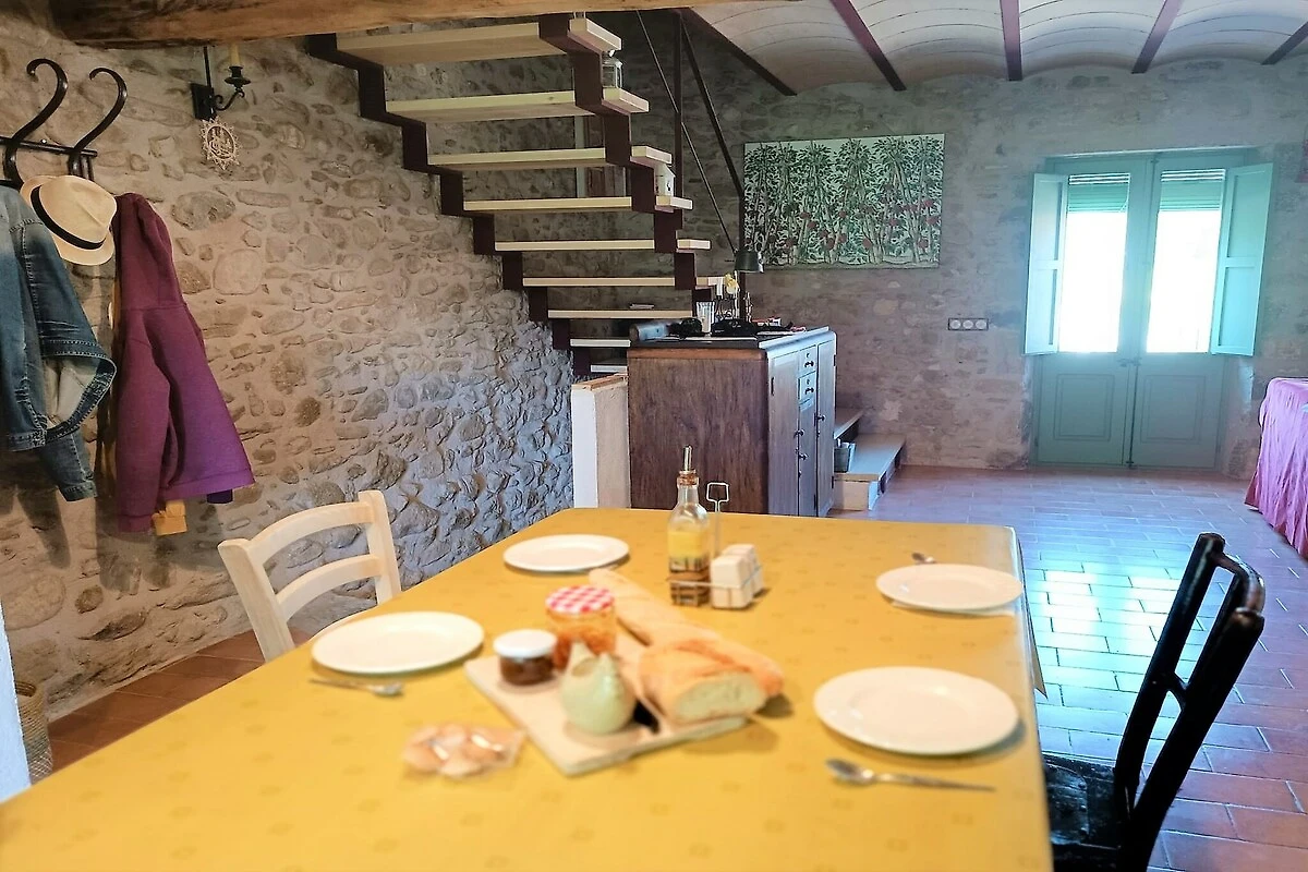 Das Haus erstreckt sich über zwei Etagen und bietet eine voll ausgestattete Küche, einen geräumigen Wohn- und Essbereich mit gemütlichem Kamin, zwei Badezimmer und komfortable Schlafzimmer. Die durch Vorhänge getrennten Zimmer unterstreichen den ländlichen Charme. Ein tragbarer Grill und Fahrräder stehen Ihnen zur Verfügung, ideal für die Erkundung der malerischen Wanderwege in der Umgebung. Nur 20 km entfernt liegt der wunderschöne See von Banyoles, ideal zum Schwimmen oder für eine entspannte Bootsfahrt in den wärmeren Monaten.