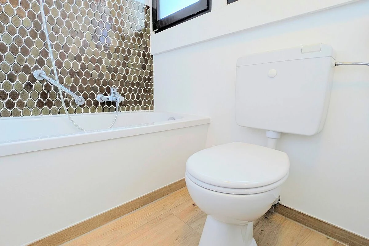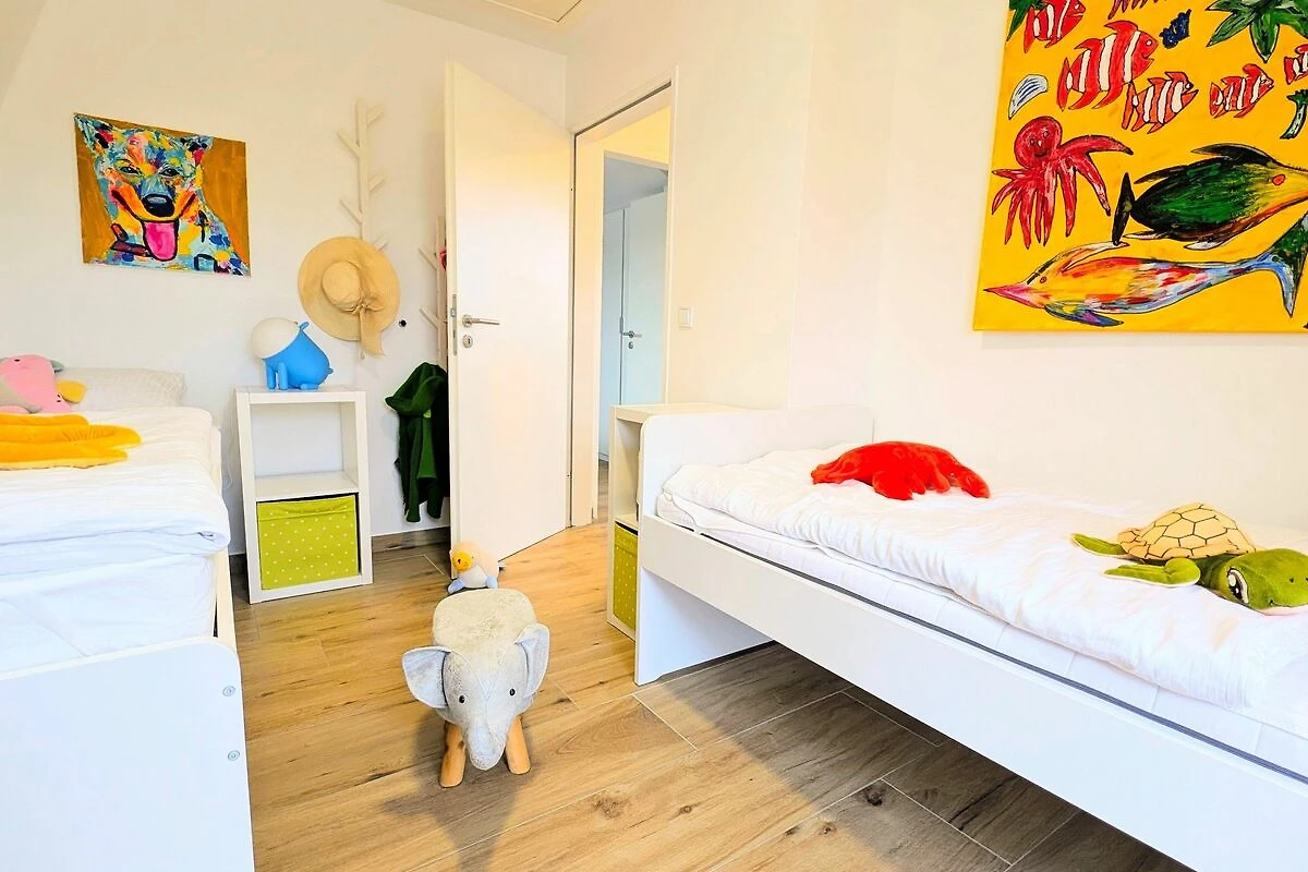 Im Obergeschoss empfangen Sie zwei Schlafzimmer. Das Eltern-Schlafzimmer mit Doppelbett (180 x 200 cm) und kappbarem Babybett sowie dem Kinder-Schlafzimmer mit zwei Einzelbetten (90 x 200cm und 90 x 190cm). Ein Badezimmer mit Badewanne, Toilette und Waschmaschine.