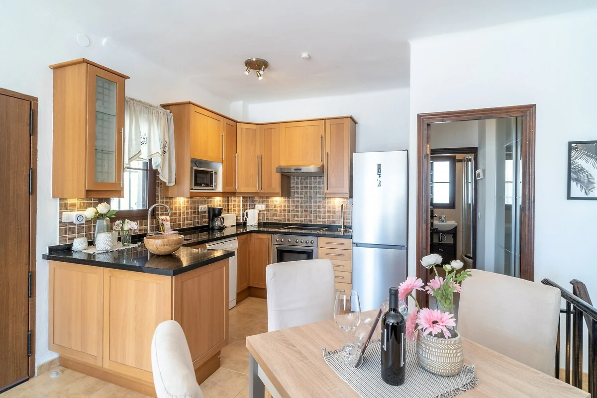 Die Wohnung verfügt über eine voll ausgestattete Küche mit modernen Geräten wie Kühlschrank, Backofen und Geschirrspüler, ideal zum Zubereiten von Mahlzeiten. Das Badezimmer im Erdgeschoss ist an das Schlafzimmer angeschlossen, während sich im Untergeschoss auch ein Badezimmer für das zweite Schlafzimmer befindet. Neben dem privaten Pool können die Gäste die große Terrasse zum Essen im Freien oder Entspannen in der Sonne nutzen.