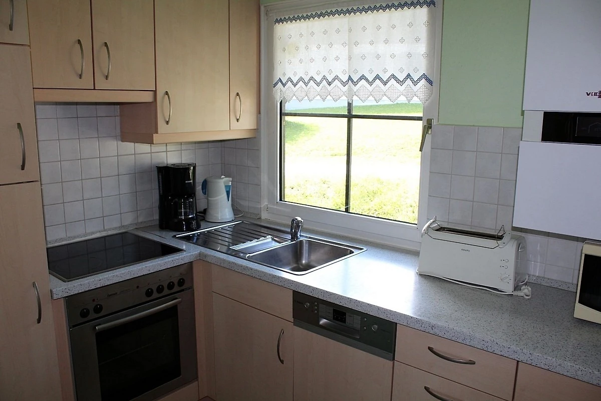 - komplett ausgestattete Küche mit Spülmaschine, Cerankochfeld, Backofen, Kühlschrank, Mikrowelle, Kaffeemaschine, Wasserkocher und Toaster
