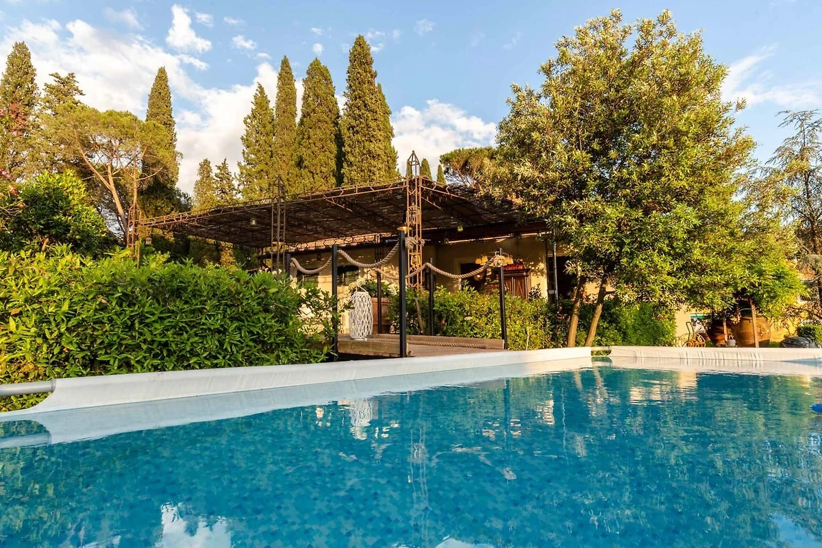 Der Außenbereich ist ebenso bezaubernd: Die geräumige Veranda, die sowohl von der Küche als auch vom Wohnzimmer aus zugänglich ist, eignet sich perfekt zum Essen und Entspannen im Freien. Eine Holzbrücke führt zu einem erfrischenden Swimmingpool, eingebettet in üppiges Grün und duftende Blumen – eine idyllische Kulisse, um die toskanische Sonne zu genießen. Für alle, die ein kulinarisches Abenteuer suchen, organisiert die charmante Gräfin Letizia, die auf dem Anwesen einer antiken Villa residiert, gerne köstliche Kochkurse und kulinarische Erlebnisse bei Ihnen zu Hause.