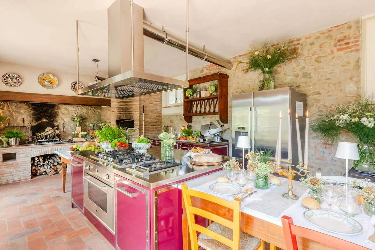 Ein wahres Highlight ist die große, überdachte Terrasse, die von der Küche im Erdgeschoss aus zugänglich ist und einen großzügigen Essbereich im Freien mit 20 Sitzplätzen bietet – ideal für großzügige Mahlzeiten mit Familie und Freunden. Ausgestattet mit einem Grill lädt sie dazu ein, im Freien zu speisen und dabei die ruhige Schönheit der toskanischen Landschaft zu genießen. Im Inneren verbindet die Villa harmonisch historische Eleganz mit modernem Luxus; jedes Zimmer besticht durch originale Möbel, brandneue Kingsize-Betten und modernste Klimaanlage. Erleben Sie den Charme eines historischen Weinkellers, in dem Weinfässer die Bühne für private Verkostungen bilden, und genießen Sie gemütliche Abende am Kaminfeuer in traditionellen Küchen.