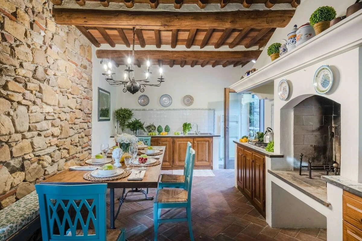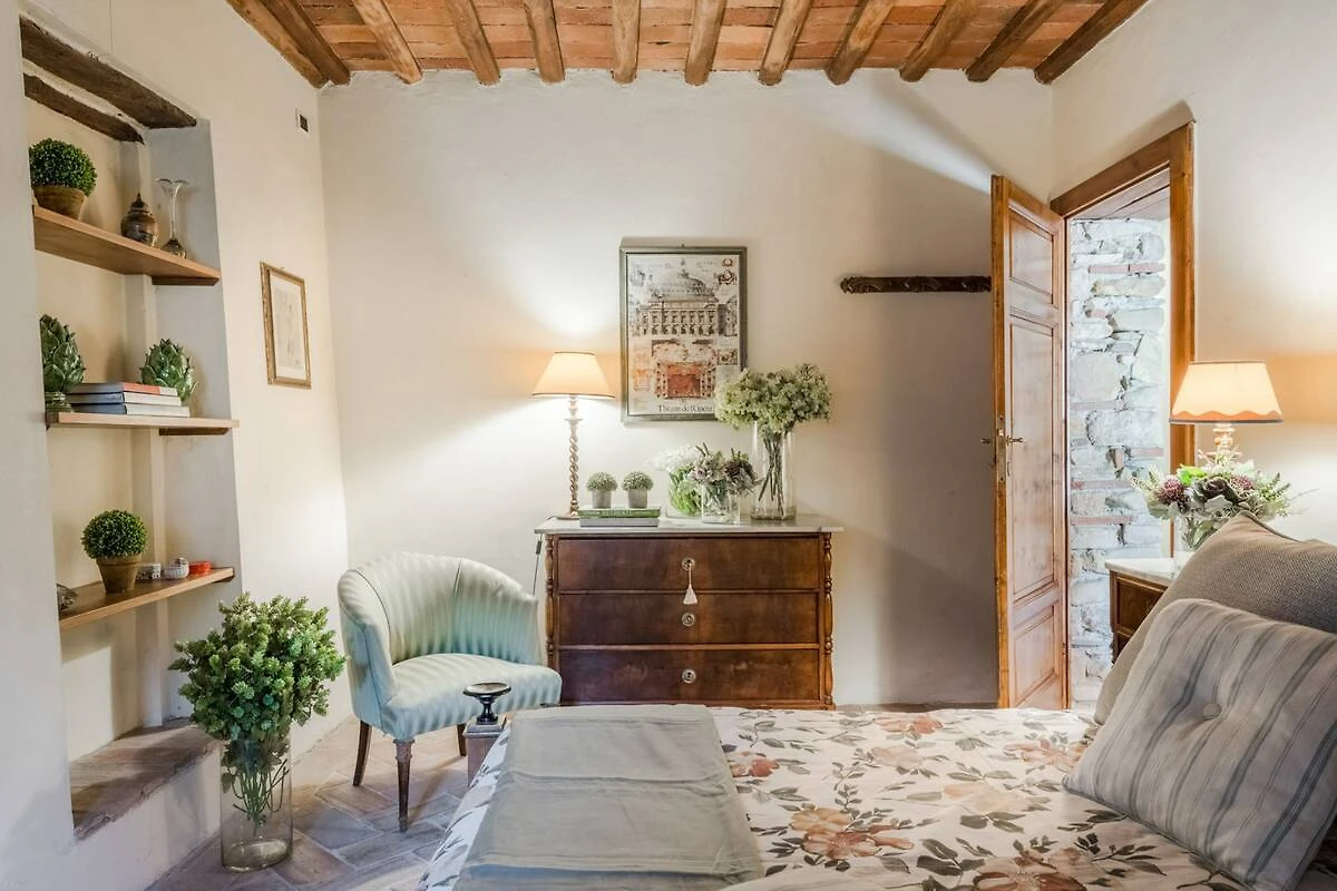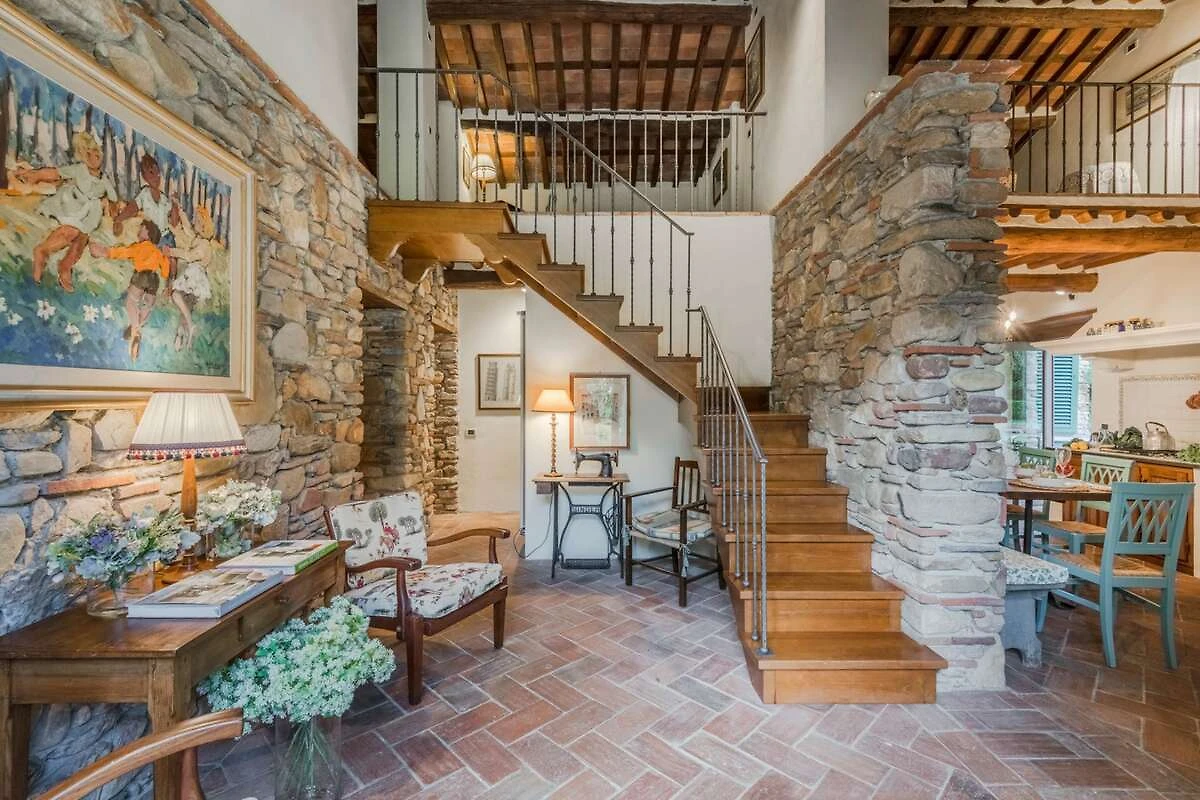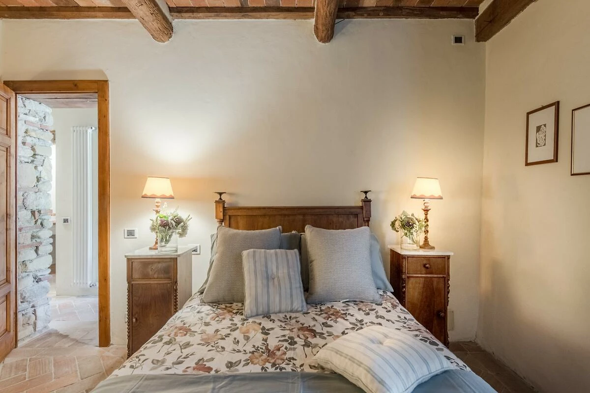 Eingebettet in die malerischen Hügel der Toskana bietet diese bezaubernde Ferienvilla ihren Gästen einen ruhigen Rückzugsort inmitten der Schönheit der Natur. Umgeben von üppigen Zitronenbäumen und blühenden Gärten empfängt die Villa ihre Gäste mit ihrer charmanten, mit Efeu und leuchtenden Pflanzen geschmückten Fassade. Schon beim Eintreten spüren die Gäste die herzliche Einladung eines märchenhaften Rückzugsortes, der darauf wartet, erkundet zu werden, wo jeder Winkel rustikale Eleganz und zeitlosen Charme ausstrahlt.