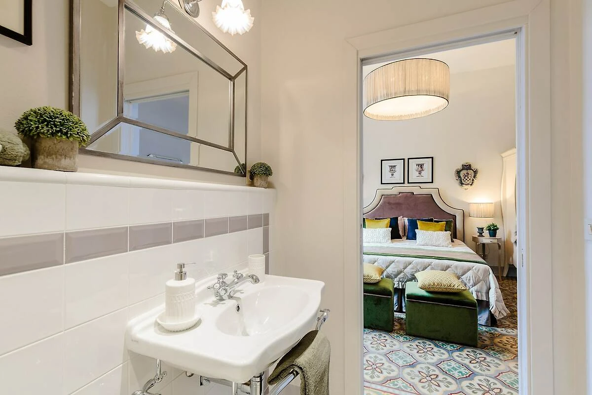 Im Inneren trifft zeitloser Charme auf modernen Luxus. Hohe Decken, französische Türen und originale antike Fliesen verschmelzen nahtlos mit Samtmöbeln und sanften Smaragd- und Anthrazittönen. Der offene Wohn- und Essbereich lädt zu gemütlichen Gesprächen ein, während die voll ausgestattete Küche für kulinarische Abenteuer bereitsteht. Entspannen Sie nach einem erlebnisreichen Tag bei einem Dampfbad im Spa-ähnlichen Badezimmer oder genießen Sie einen Wein unter dem Sternenhimmel auf der überdachten Dachterrasse.