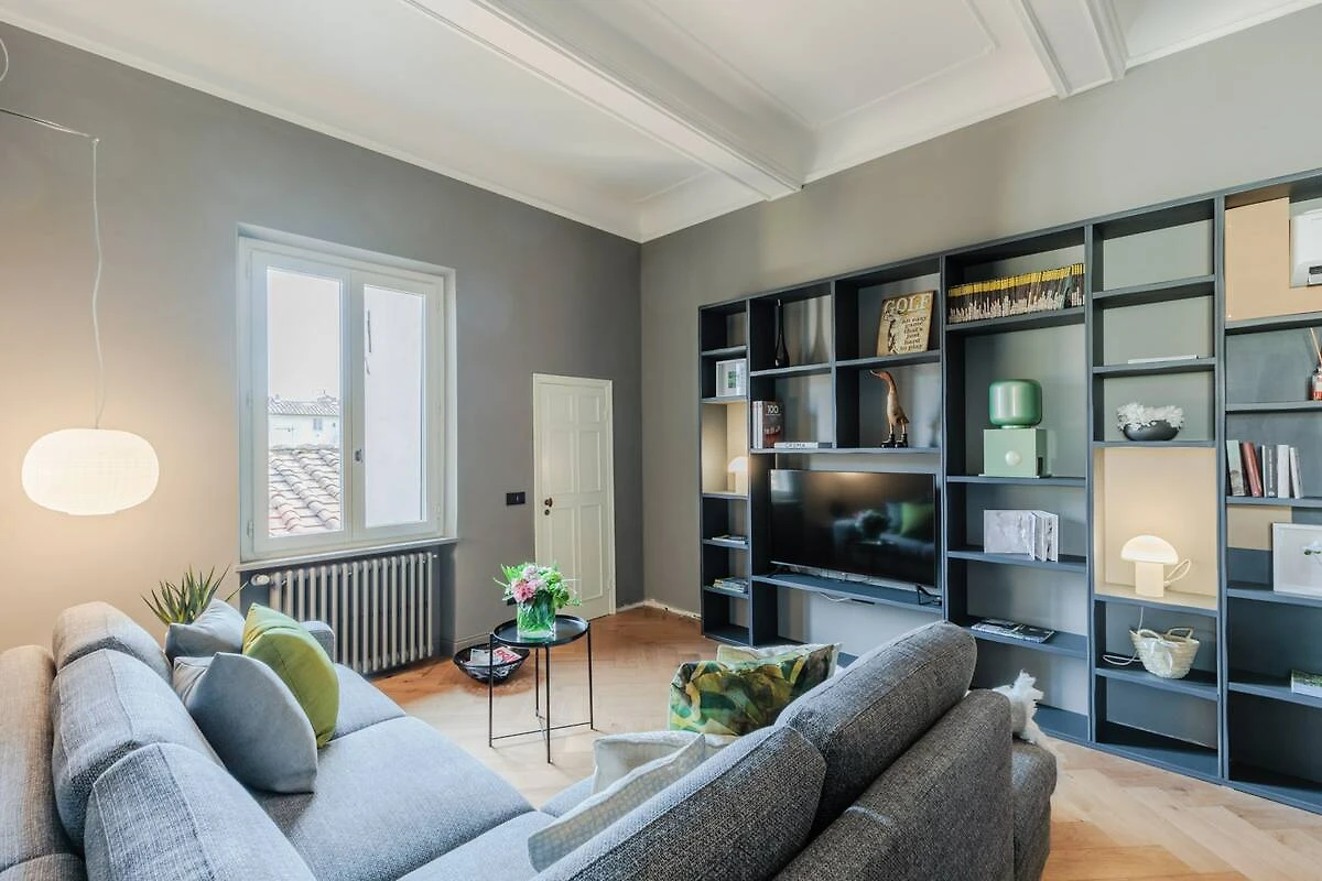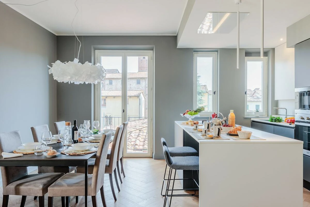 Die geschwungene Steinkrone des Guinigi-Turms scheint von den französischen Fenstern dieser Dachgeschosswohnung in einem mittelalterlichen Gebäude innerhalb der historischen Stadtmauern von Lucca fast zum Greifen nah. Das lichtdurchflutete und von einem atemberaubenden Blick über die Dächer umgebene Interieur verbindet traditionelle Architektur mit modernem Design. Eine hochwertige Küche mit Kochinsel erleichtert die Zubereitung von Mahlzeiten, während der angrenzende Essbereich und die elegante Lounge Platz zum Beisammensein, Entspannen und Genießen der Landschaft bieten.