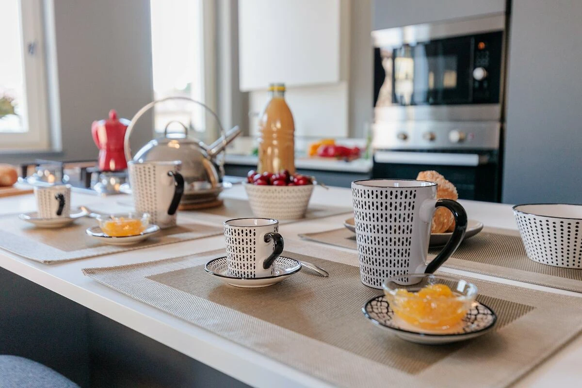 In der 3. Etage: (Eingang, offene Küche(Wasserkocher, Toaster, Kaffeemaschine, Backofen, Mikrowelle, Spülmaschine, Kühl-/Gefrierkombination, ), Wohn/Esszimmer(TV, Esstisch, Sitzecke), Schlafzimmer(Doppelbett), Schlafzimmer(Doppelbett), Badezimmer(Dusche), Badezimmer(Dusche))