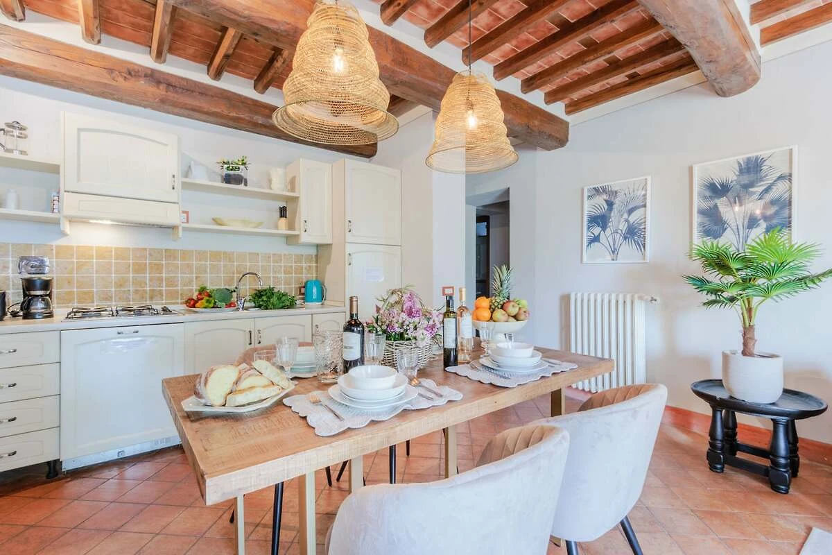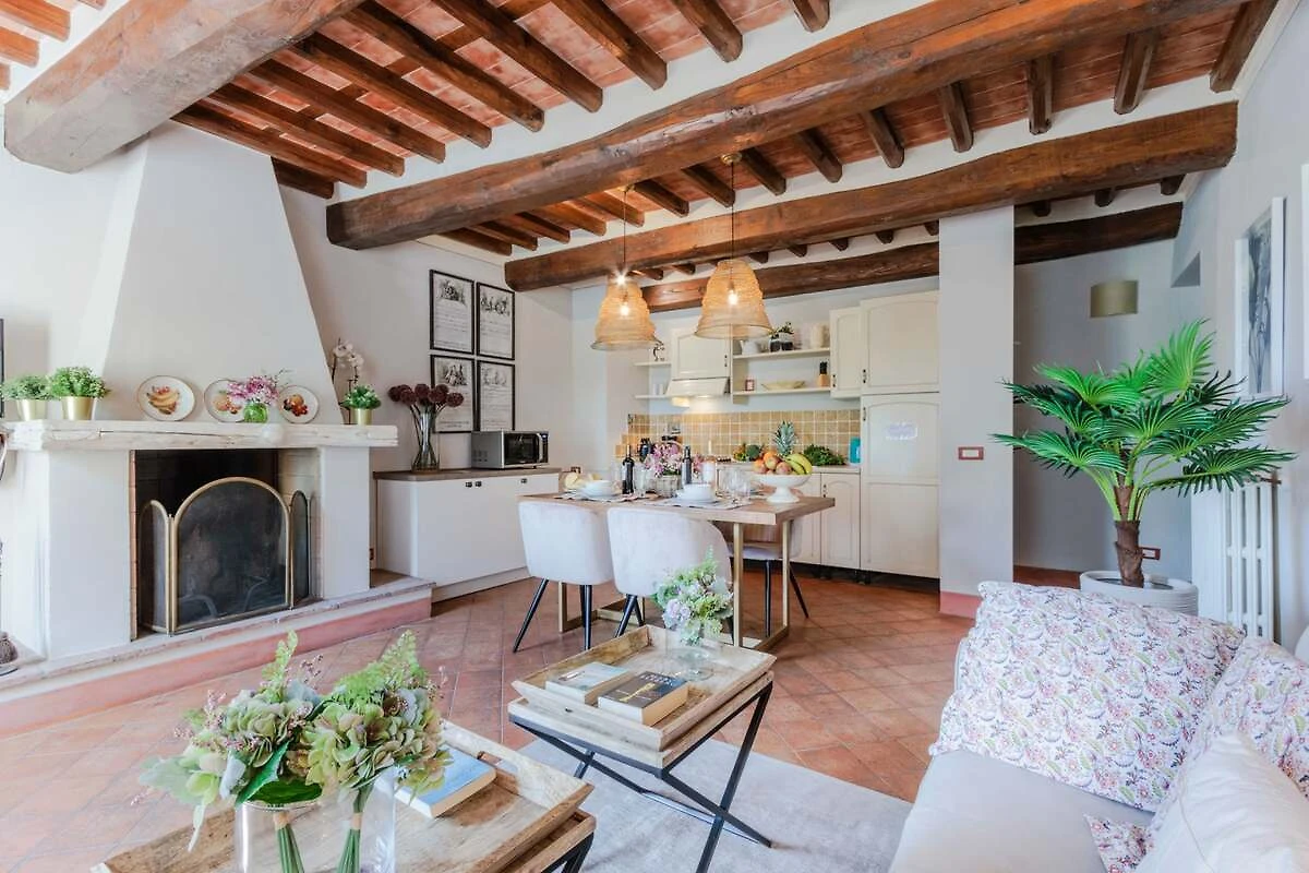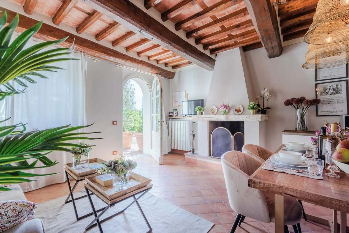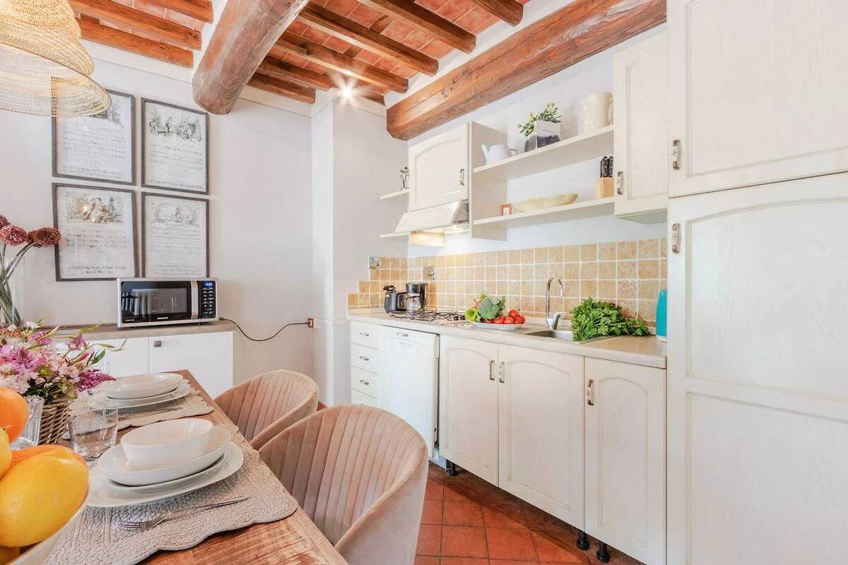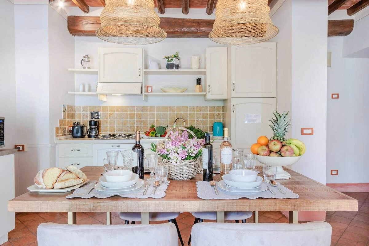 Dieses Apartment im Erdgeschoss ist ein wunderschön renoviertes Refugium mit eigenem Garten. Im Inneren finden Sie einen hellen Wohnbereich, eine voll ausgestattete Küche mit Essbereich, zwei einladende Doppelzimmer und zwei elegante Badezimmer mit ebenerdigen Duschen. Die Einrichtung bleibt der toskanischen Tradition treu – Holz, Stein und sanfte Erdtöne – und wirkt dennoch frisch und stilvoll. Gehen Sie hinaus und genießen Sie Ihren Garten bei einem Glas Gutswein oder schlendern Sie zum Gemeinschaftspool, umgeben von Weinbergen und sonnendurchfluteten Landschaften.