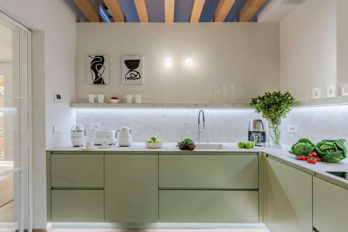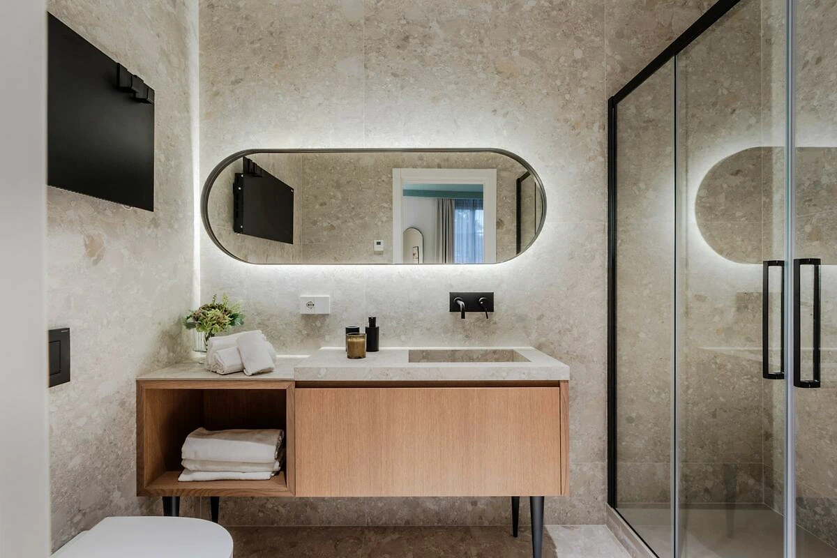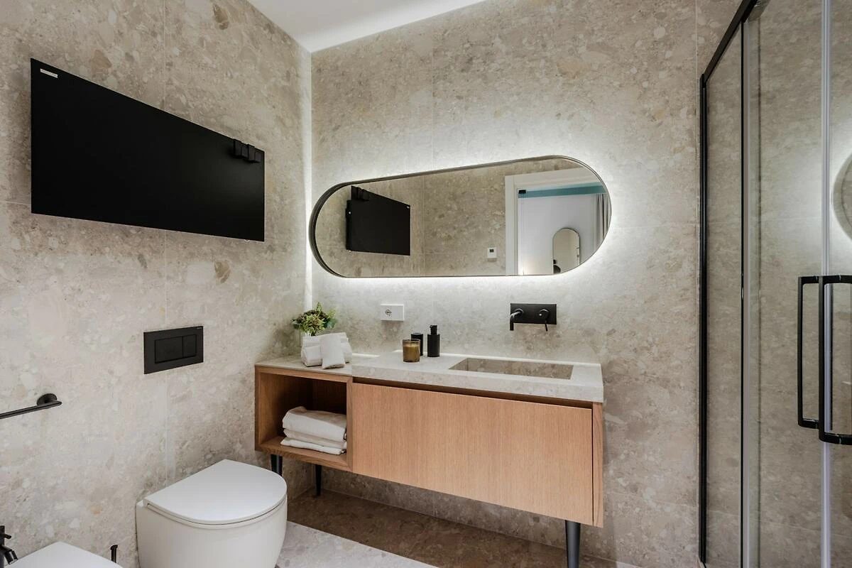 Das Apartment wurde für anspruchsvolle Reisende konzipiert und verfügt über drei großzügige Schlafzimmer mit Kingsize-Betten, jedes mit eigenem Bad. Zwei Badezimmer sind mit handgefertigten Steinduschen ausgestattet, das dritte bietet eine elegante Badewanne und einen privaten Balkon. Die hochmoderne Küche ist komplett mit hochwertigen Geräten ausgestattet und eignet sich perfekt für die Zubereitung von Mahlzeiten, die Sie im eleganten Esszimmer genießen können. Ein geräumiger Wohnbereich, ein Gäste-WC und ein Hauswirtschaftsraum mit Waschmaschine und Trockner runden das Angebot ab. Klimaanlage und Highspeed-WLAN sind im gesamten Apartment verfügbar.