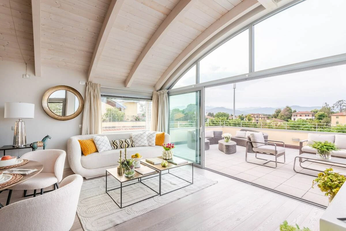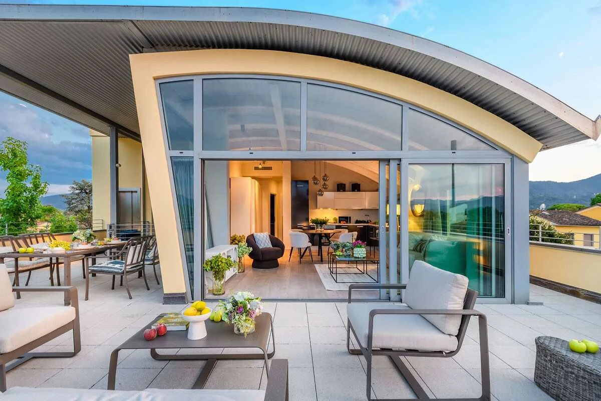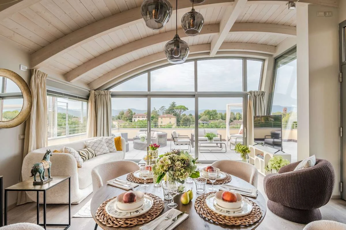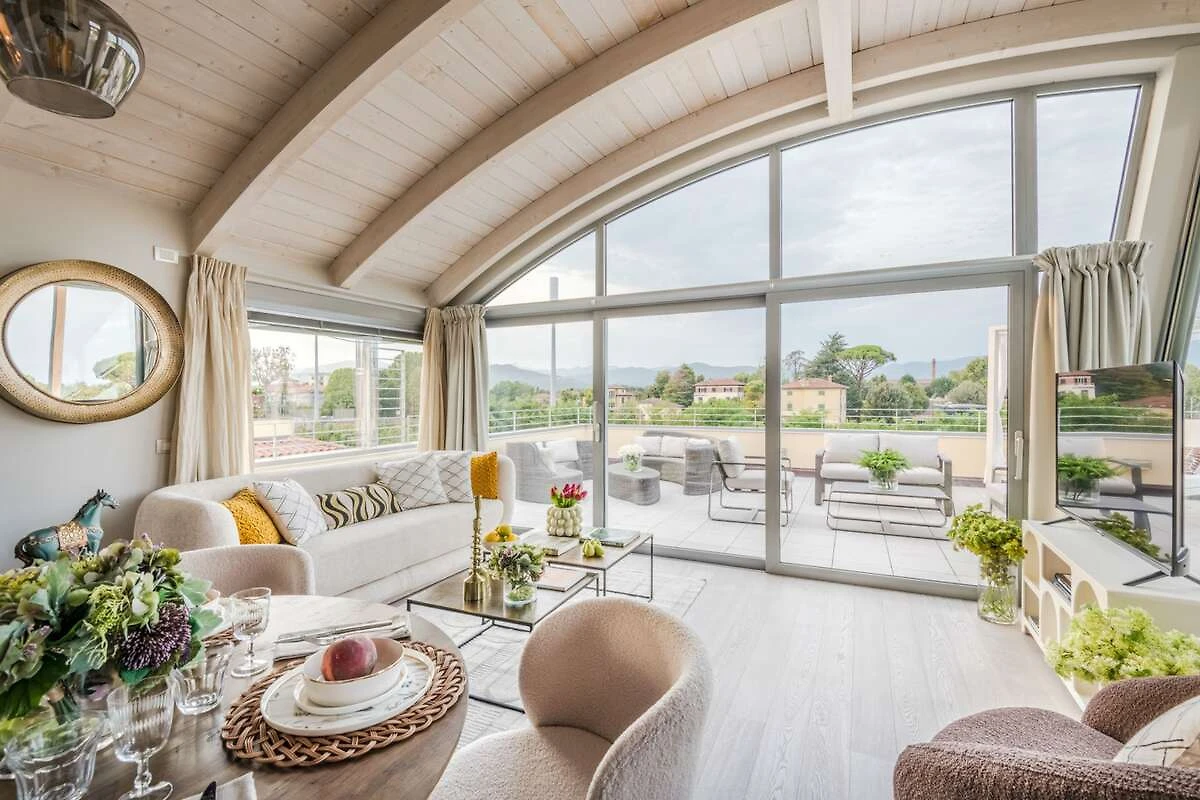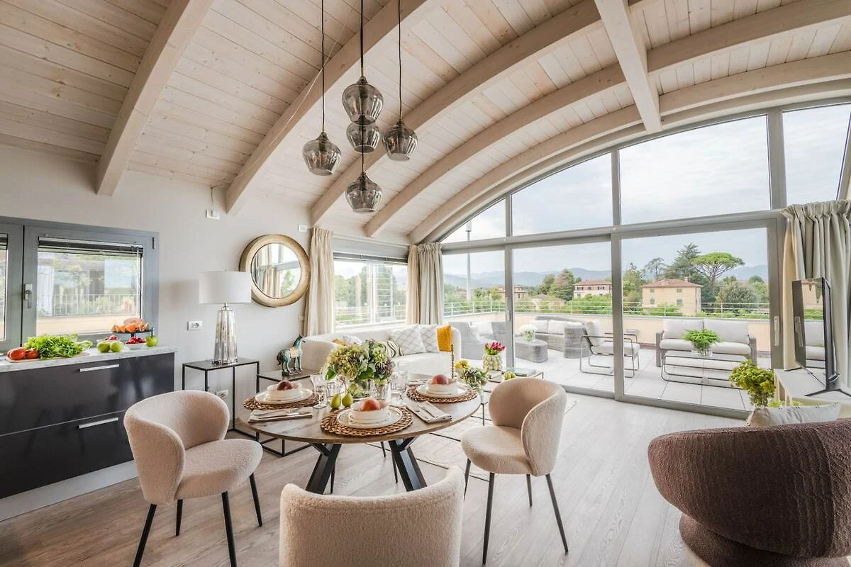 Stellen Sie sich vor, Sie wachen in einem sonnendurchfluteten Refugium über Luccas historischen Mauern auf, getaucht in goldenes Licht durch raumhohe Glasfenster. Dieses moderne Penthouse im ruhigen San Concordio bietet unvergleichlichen Luxus und verbindet zeitgenössisches Design mit der zeitlosen Schönheit der Toskana. Betreten Sie einen großzügigen, offenen Wohnraum, in dem elegante Möbel auf natürliches Licht treffen. Glaswände rahmen einen atemberaubenden Panoramablick auf Luccas alte Befestigungsanlagen ein und verbinden so harmonisch die Eleganz des Innenbereichs mit der Pracht des Außenbereichs.