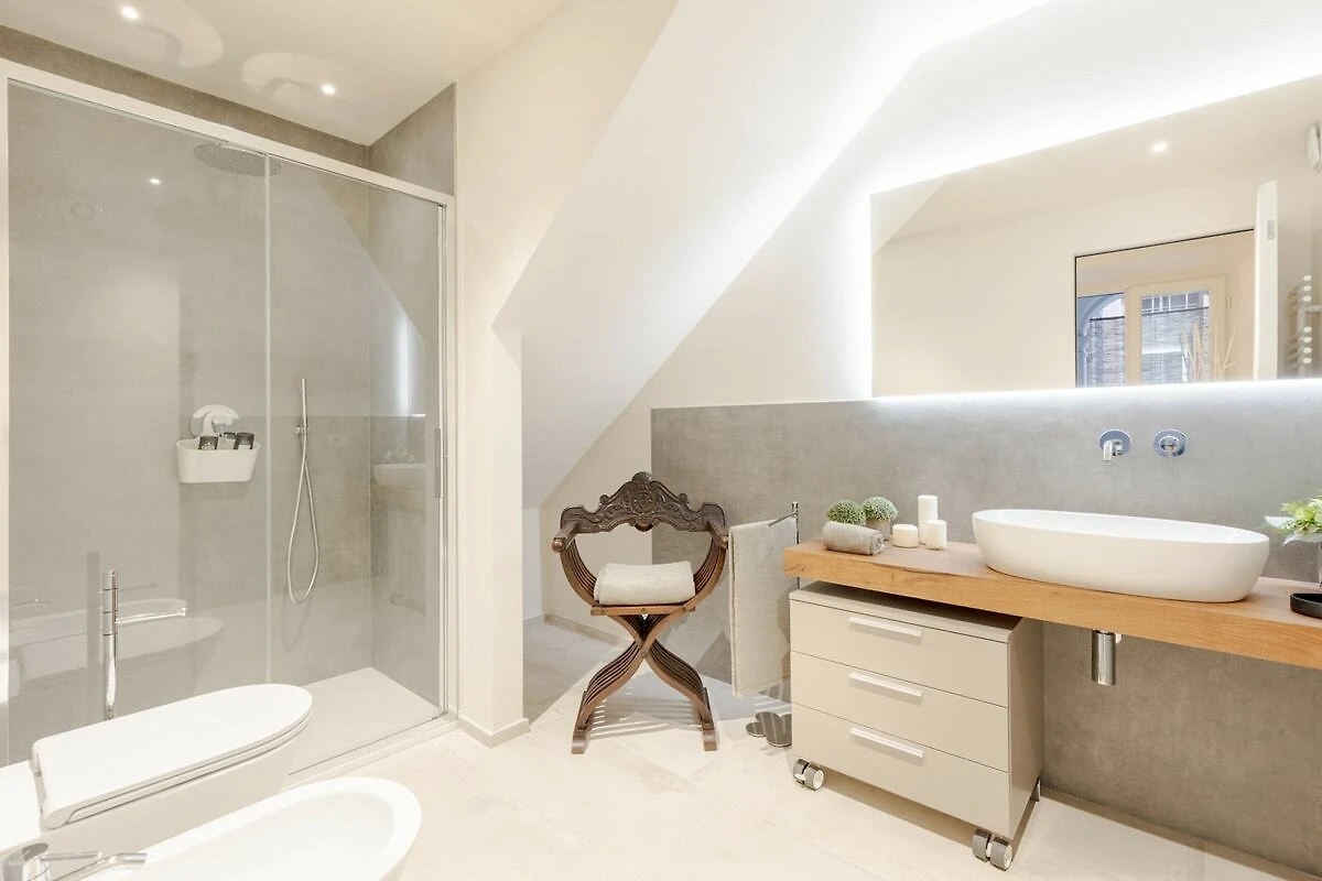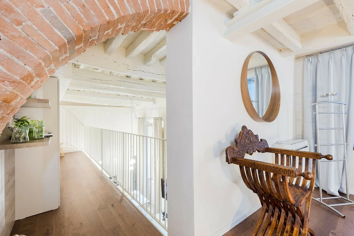 Das Erdgeschoss verfügt über ein großzügiges Wohnzimmer mit Schlafsofa, eine Küche, einen Hauswirtschaftsraum und ein Badezimmer mit Dusche. Im Obergeschoss dient ein offener Dachboden als Schlafzimmer mit Kleiderschrank und Büroecke. Erleben Sie das reiche Erbe Luccas und genießen Sie gleichzeitig modernen Komfort in diesem exquisiten und barrierefreien Refugium – ideal für Kurz- und Langzeitaufenthalte.
