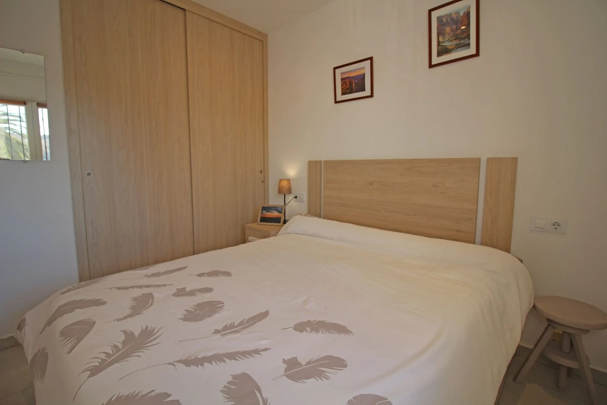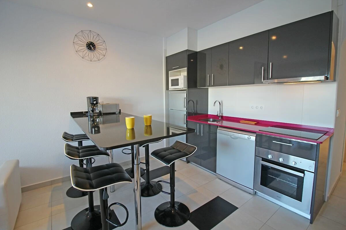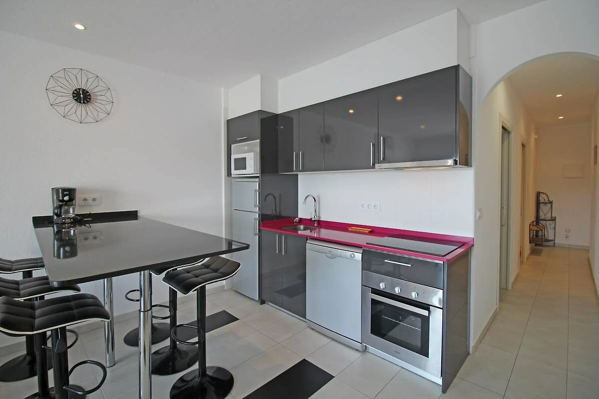 Die offene Küche ist komplett ausgestattet mit Cerankochfeld, Kühlschrank, Mikrowelle, Backofen, Geschirrspüler, Kaffeemaschine und Toaster – ideal für die Zubereitung Ihrer Mahlzeiten zu Hause. Zur weiteren Ausstattung gehören eine Klimaanlage im Wohnzimmer, WLAN (optional), Sat-TV, eine Waschmaschine sowie Zugang zu einem Gemeinschaftspool und einem Kinderbecken. Die Wohnung befindet sich in einer ruhigen, familienfreundlichen Wohngegend.