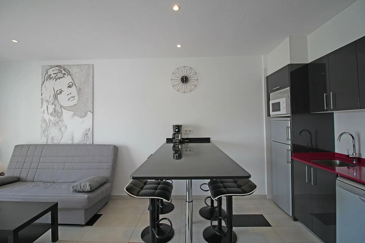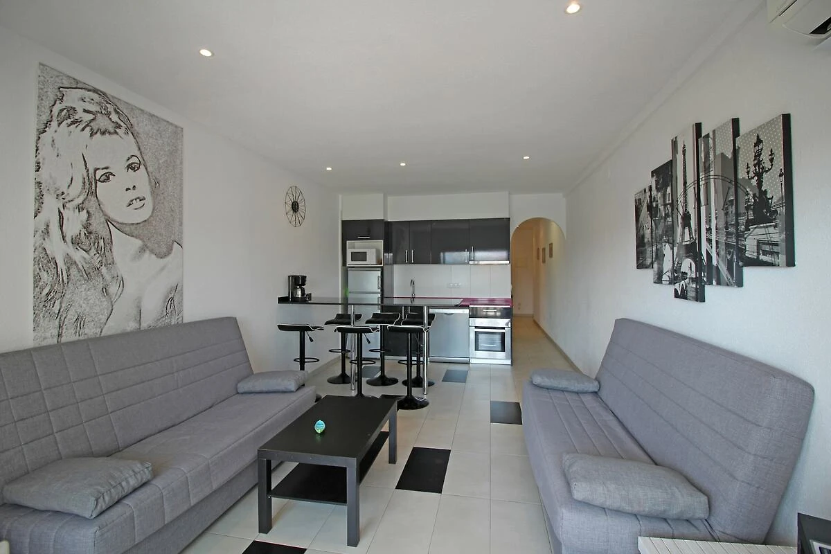Dieses charmante, 45 m² große Apartment in Empuriabrava ist ideal für Paare oder kleine Familien und bietet Platz für bis zu vier Personen. Es befindet sich im ersten Stock und verfügt über ein Schlafzimmer mit Doppelbett und zwei Einzelschlafsofas im Wohnbereich. Die 7 m² große Terrasse bietet einen herrlichen Blick auf den Kanal und die umliegende grüne Umgebung – ideal, um einen ruhigen Morgen oder Abend im Freien zu genießen.