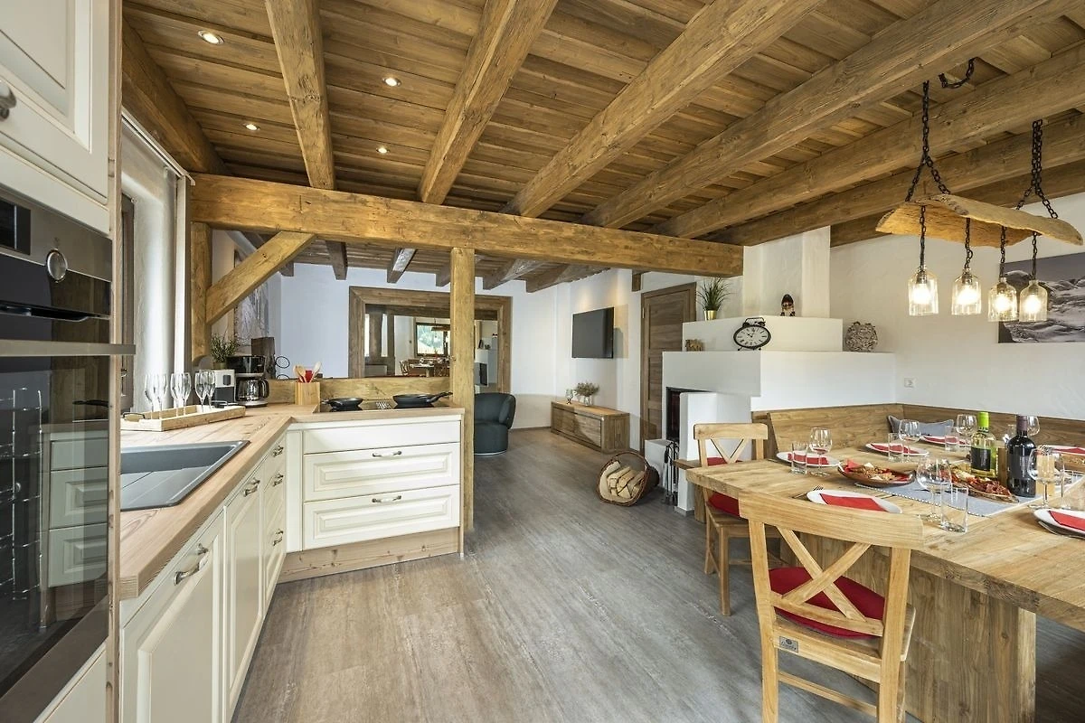 Die moderne Küchenzeile lässt auch bei Profi-Köchen keine Wünsche offen. Neben einem Induktions-Kochfeld gibt es einen Backofen, einen Kühl- und Gefrierschrank sowie allerhand Elektrogeräte. Der grosse Esstisch bietet allen Gästen ausreichend Platz. Aus dem Wohnbereich gelangt man auf die möblierte Terrasse, welche einen traumhaften Ausblick auf die umliegende Bergwelt bietet.
