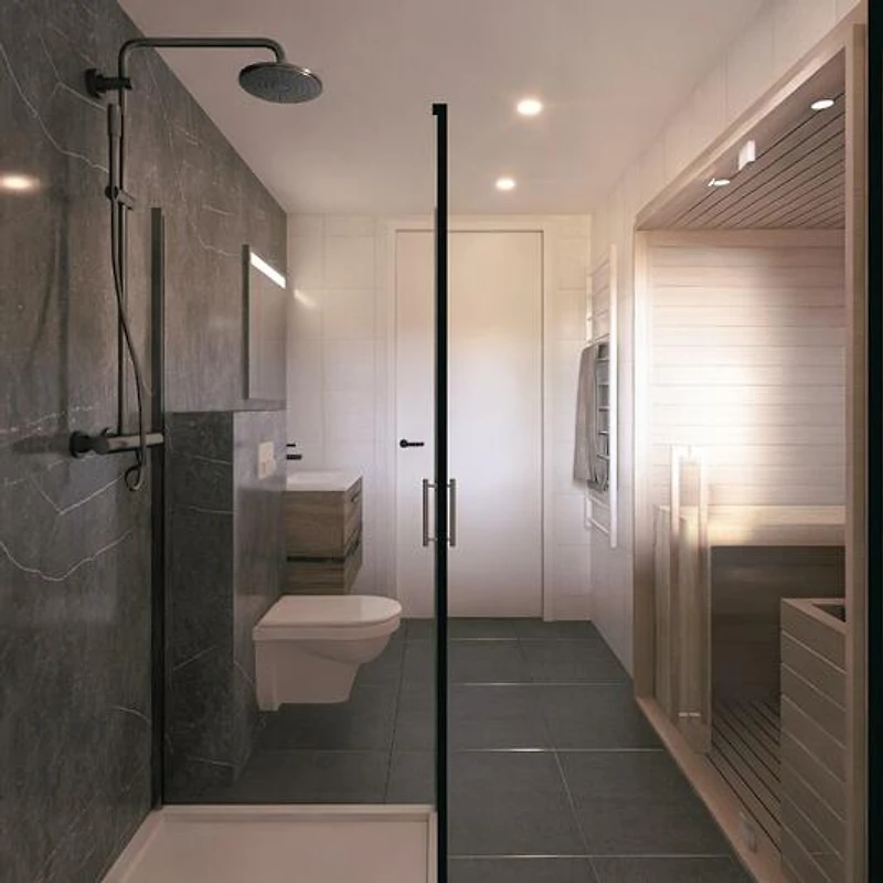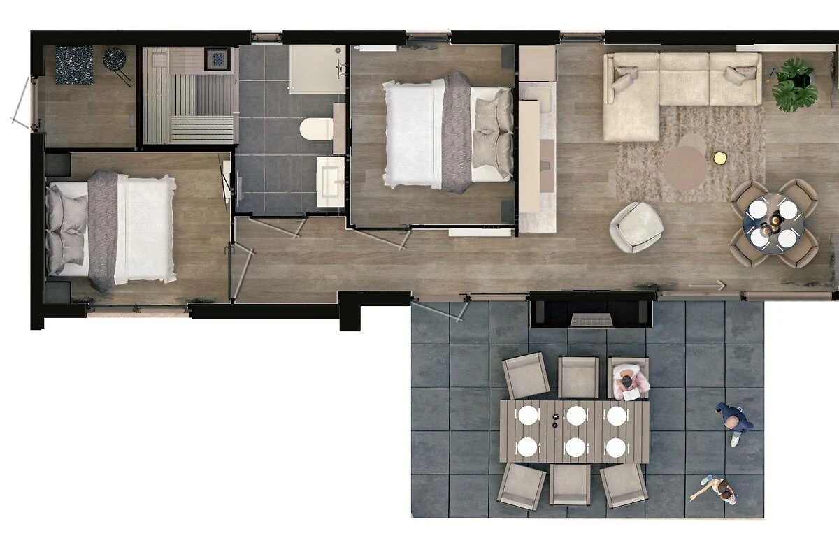 Die Villa bietet ein geräumiges Wohnzimmer mit luxuriöser Einrichtung inklusive Fernseher, ein Esszimmer und eine Küche. Die luxuriöse Küche verfügt über einen Induktionsherd mit eingebautem Dunstabzug, einen Kombidämpfer und eine Spülmaschine. Dieser Villentyp ist mit zwei Schlafzimmern, jeweils mit zwei Einzelboxspringbetten, einem Fernseher und jeder Menge Lagerfläche ausgestattet. Bei Ihrer Ankunft sind die Betten bereits für Sie gemacht. Das grosse Badezimmer verfügt über eine S-Line-Duosauna, hochwertige Materialien, eine Regendusche, ein Waschbecken und eine Toilette.