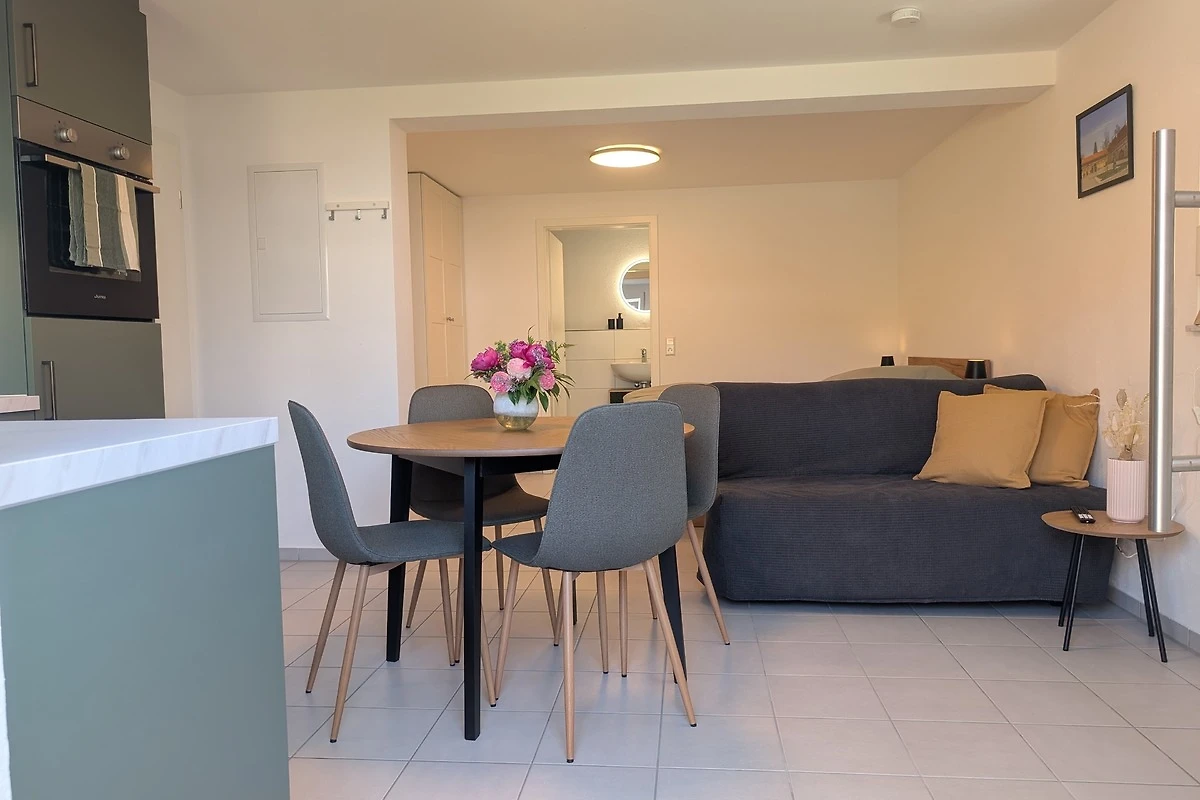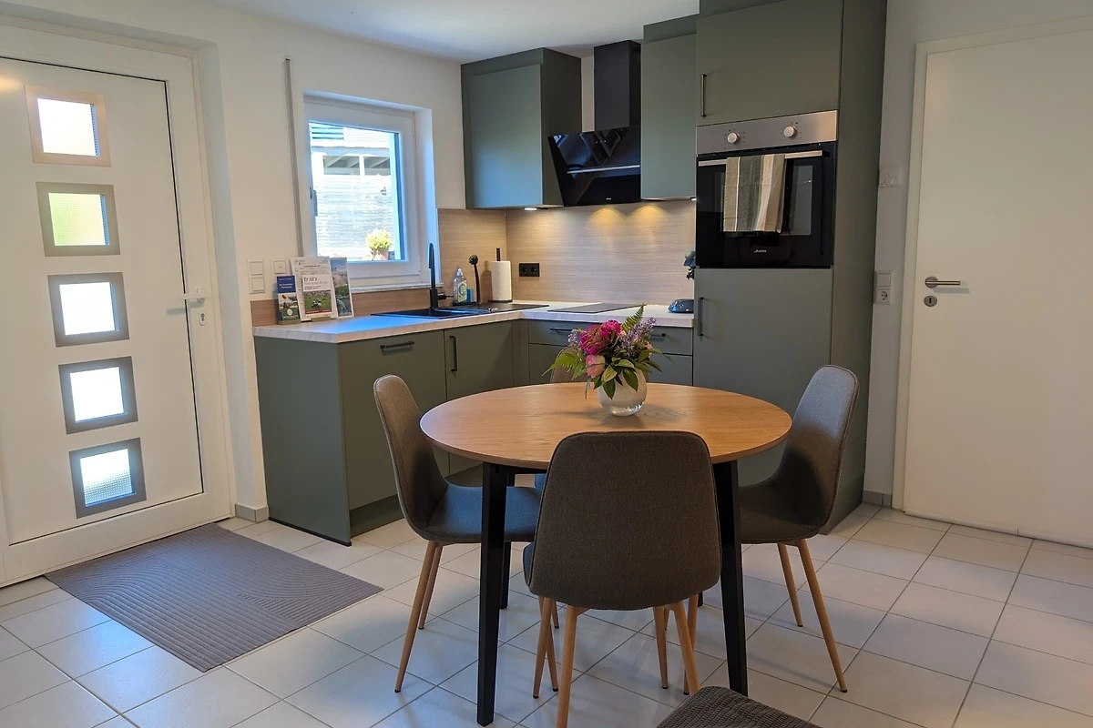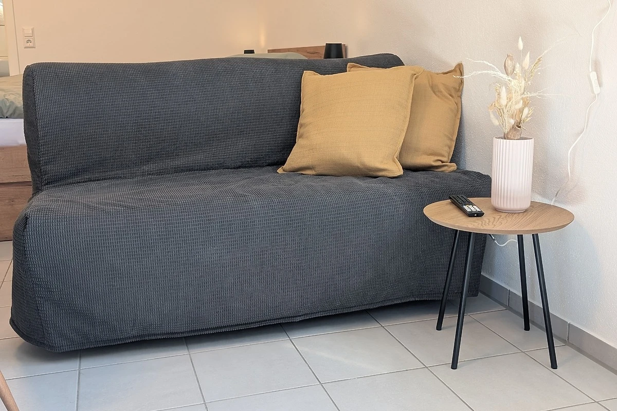Das Apartment bietet Platz für bis zu vier Personen dank eines komfortablen Doppelbetts (160x200) und eines Schlafsofas (140x190). Die voll ausgestattete Küche mit Induktionskochfeld, Backofen, Spülmaschine, Wasserkocher, Kühlschrank mit Gefrierfach und Kaffeemaschine lädt zum Kochen ein. Für entspannte Abende stehen eine Sofadecke und gemütliche Sitzkissen für die Gartenmöbel bereit.