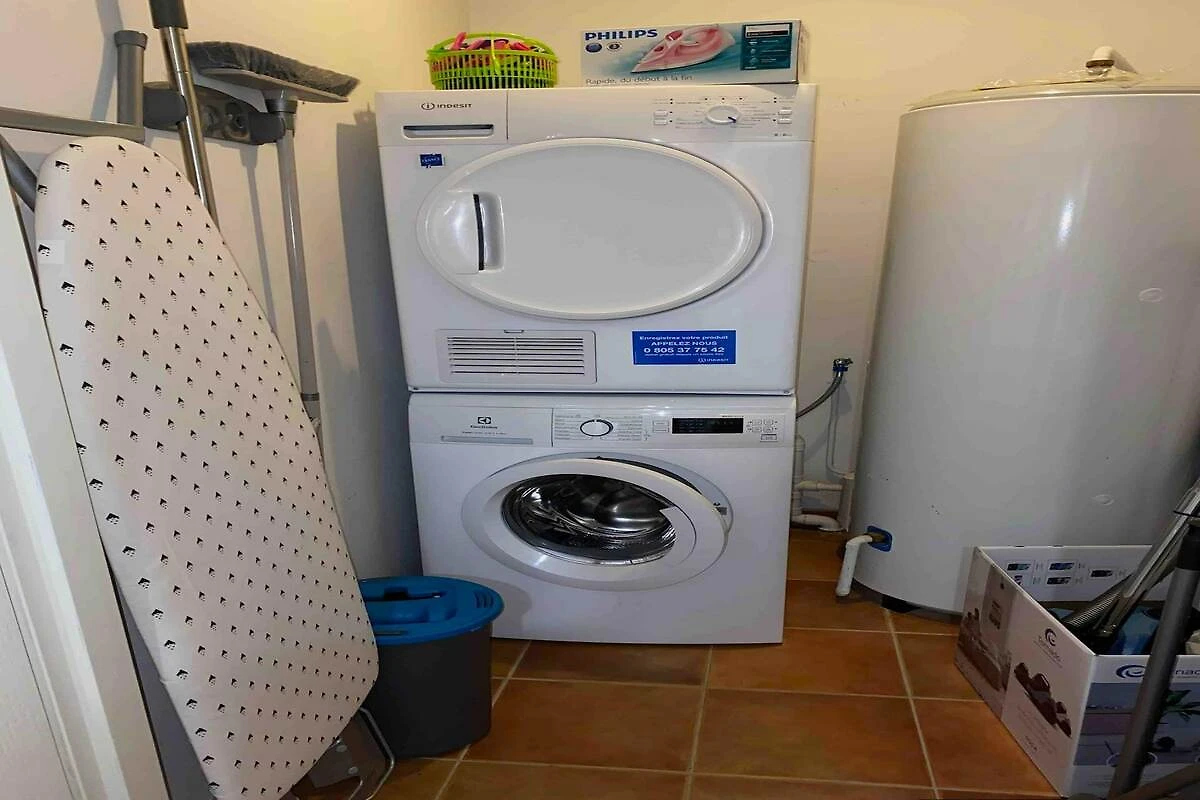 Parterre: (offene Küche(Kochherd(4 Kochplatten, elektrisch), Kaffeemaschine, Backofen, Grill, Mikrowelle, Spülmaschine, Kühlschrank(+ Gefrierfach), Mixer), Wohn/Esszimmer(TV(Satellit), Esstisch(8 Personen), Kaminofen, DVD-Spieler), Schlafzimmer(2x Einzelbett), Schlafzimmer(2x Einzelbett), Schlafzimmer(Doppelbett, Badewanne oder Dusche), Schlafzimmer(Doppelbett, Badewanne oder Dusche), Schlafzimmer(Doppelbett, Badewanne oder Dusche), Badezimmer(Badewanne oder Dusche), Toilette, Toilette, Wirtschaftsraum(Trockner, Waschmaschine), Heizung(elektrisch), Klimaanlage)