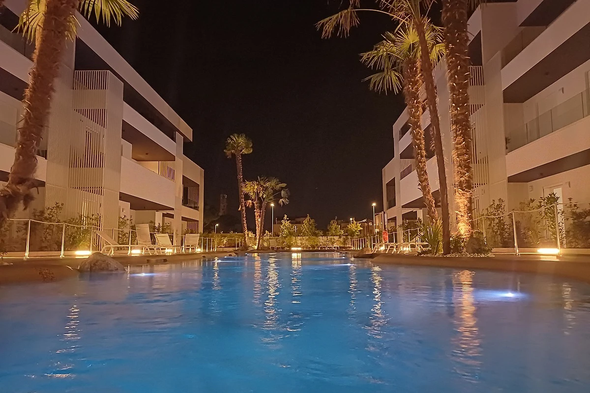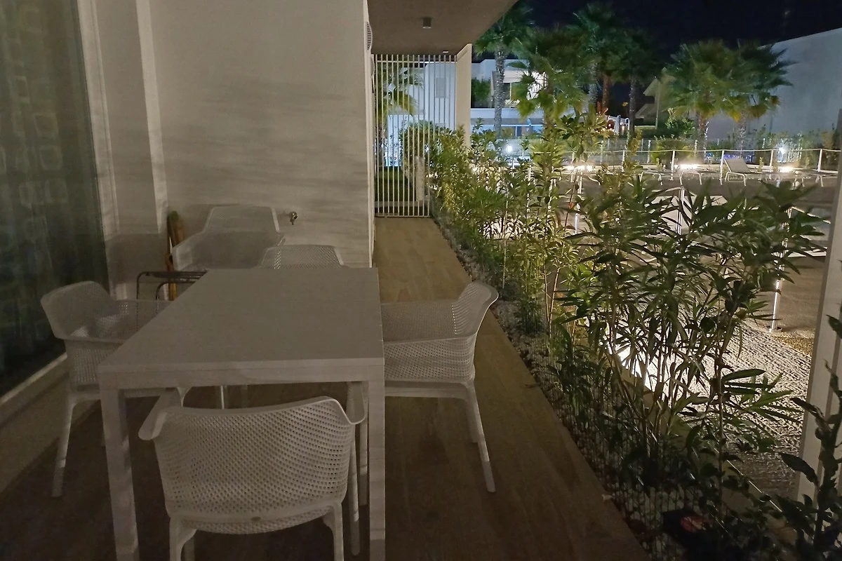 Verweilen Sie auf der geräumigen Terrasse, umgeben von Palmen und dem sanften Meeresrauschen, oder erfrischen Sie sich im glitzernden Swimmingpool der Anlage, der auch nachts eine magische Atmosphäre bietet. Ein privater Garagenparkplatz steht Ihnen zur Verfügung, und für die Sicherheit Ihrer Wertsachen ist ein Safe vorhanden.