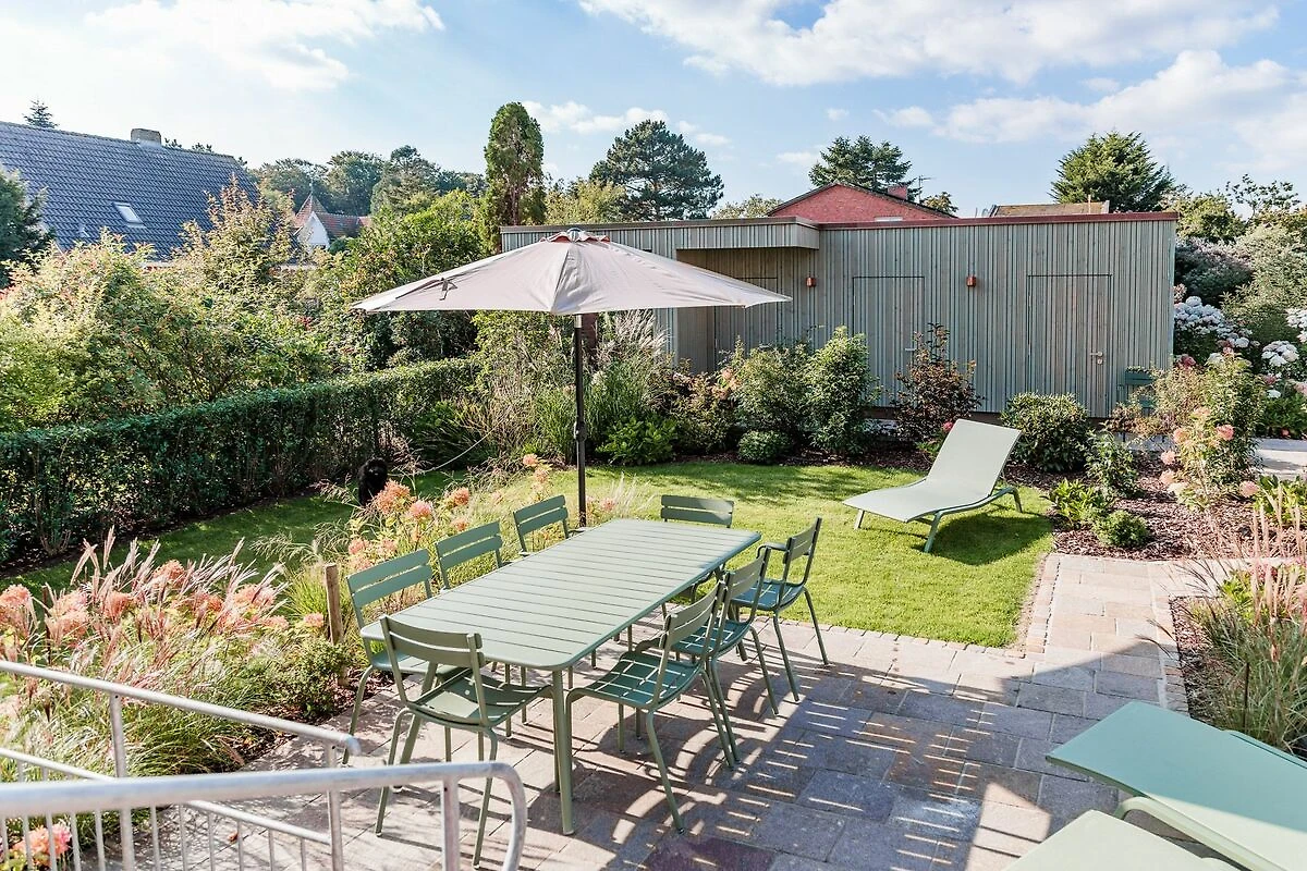 Im Erdgeschoss erwartet Sie ein großzügiger Wohn- und Essbereich mit offener, voll ausgestatteter Küche – das Herzstück der Wohnung. Hier werden Urlaubsmomente geschaffen, die in Erinnerung bleiben. Große Fensterflächen eröffnen den Blick in den eigenen, liebevoll angelegten Garten und sorgen für eine helle, einladende Atmosphäre.