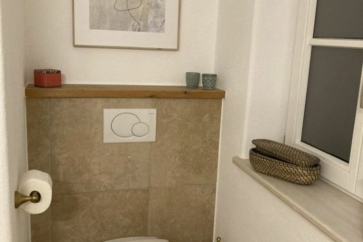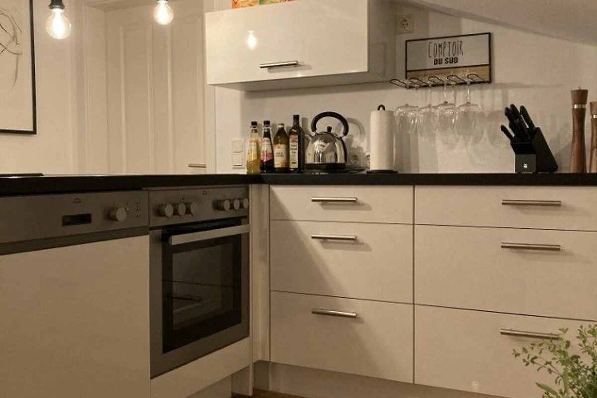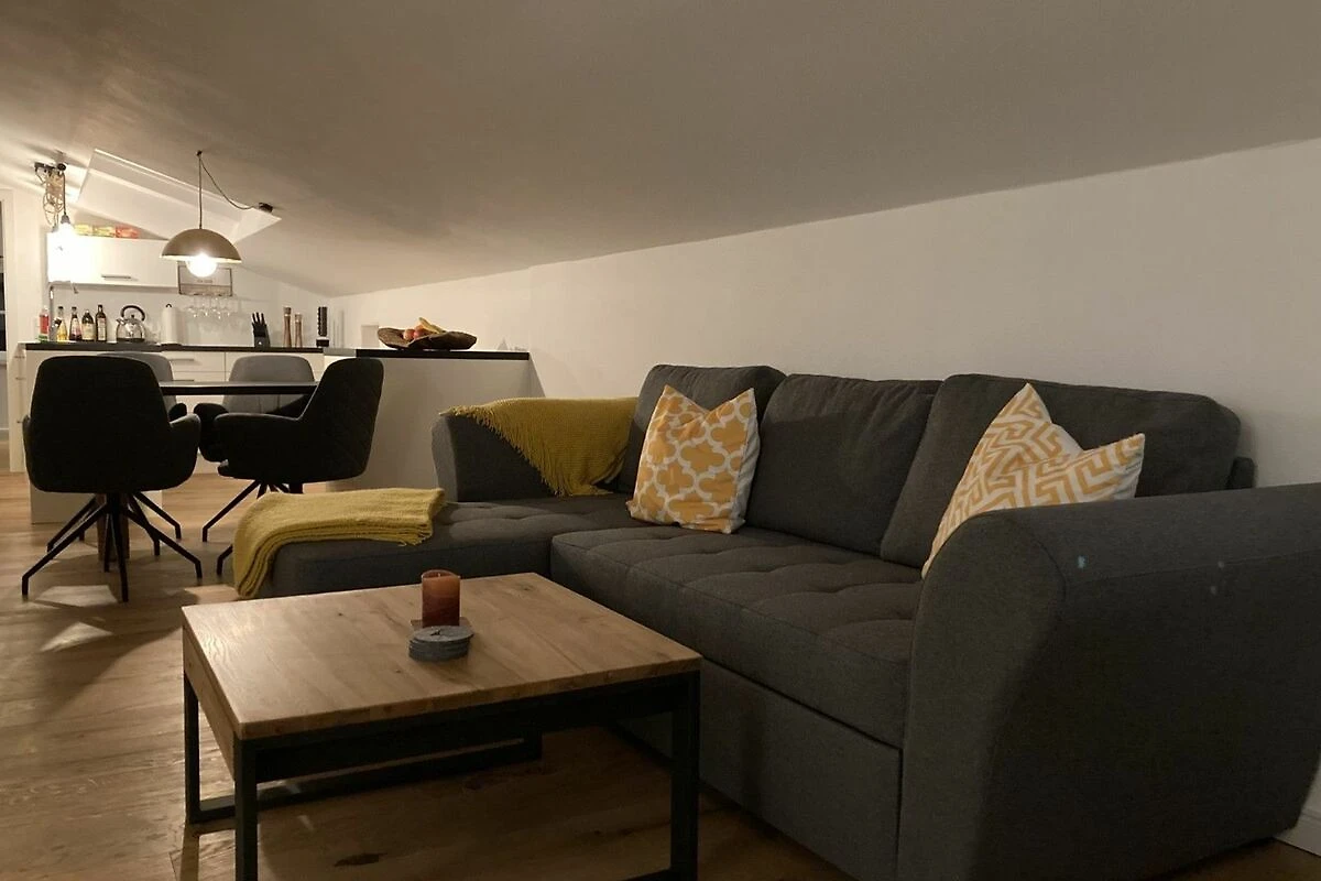 Der Eichen-Parkettboden zieht sich durch die komplette Wohnung. Den Namen Nest verdankt die Ferienwohnung den Dachschrägen, die eine kuschelige und gemütliche Atmosphäre schaffen.