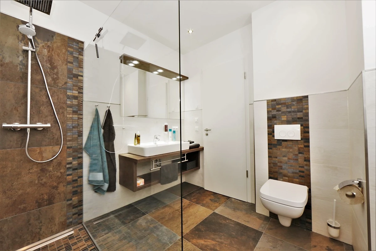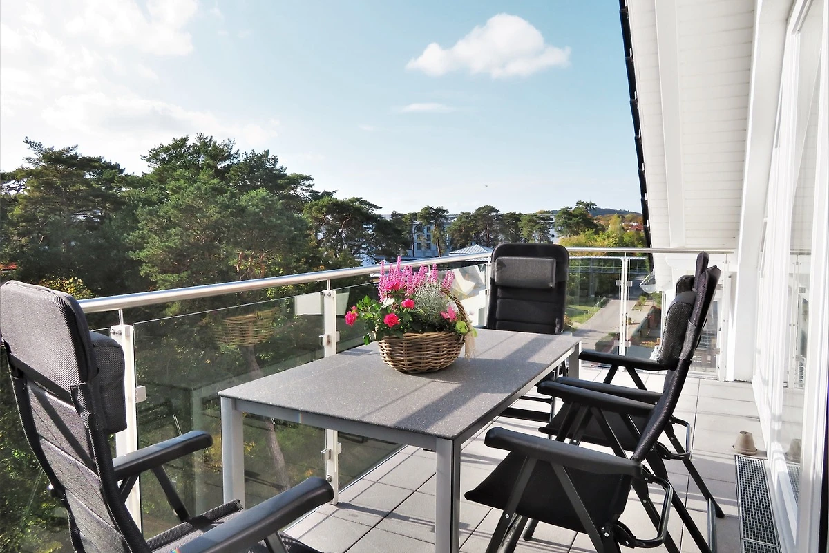 Dieses mit 100 qm sehr grosszügige 3-Zimmer Appartement befindet sich im Dachgeschoss der 2018 neu erbauten Strandresidenz und bietet 4-5 Personen reichlich Komfort. Geniessen Sie Ihren Urlaub direkt am Meer in dieser hochwertig und sehr geschmackvoll eingerichteten Wohnung. Im Wohnbereich mit grosser Fensterfront erwartet Sie eine bequeme Polstergarnitur bestehend aus Sofa und Sessel, ein Couchtisch und Flat TV sowie ein Esstisch für gemeinsame Mahlzeiten. Ein Gaskamin sorgt für Gemütlichkeit und zusätzliche Wärme bei Bedarf. Die moderne separate Küche ist mit Cerankochfeld, Backofen mit integrierter Mikrowelle, Geschirrspüler, Kühlschrank etc. ausgestattet. Beide Schlafzimmer verfügen jeweils über ein komfortables Doppelbett mit getrennten Matratzen (90 x 200), reichlich Schrankraum sowie einen eigenen TV. Von einem der beiden Schlafzimmer können Sie einen Blick auf die Ostsee erhaschen. Den grossen mit einer Essgruppe möblierten Balkon in Süd-West-Ausrichtung betreten Sie vom Wohnraum. Auf der Dachterrasse (ebenfalls zum Süd-Westen) können Sie den Tag mit einem Glas Wein ausklingen lassen. Beide Badezimmer sind mit einer bodengleichen Dusche mit Echtglasabtrennung und Waschtisch/WC ausgestattet.