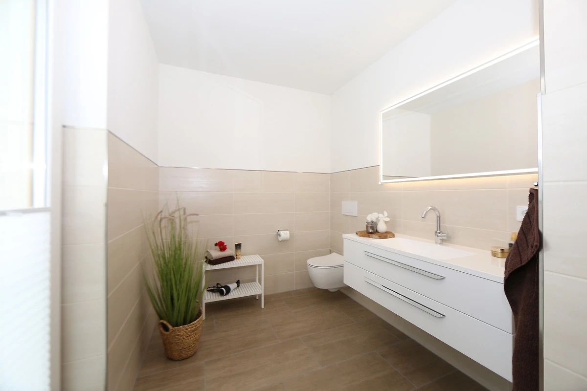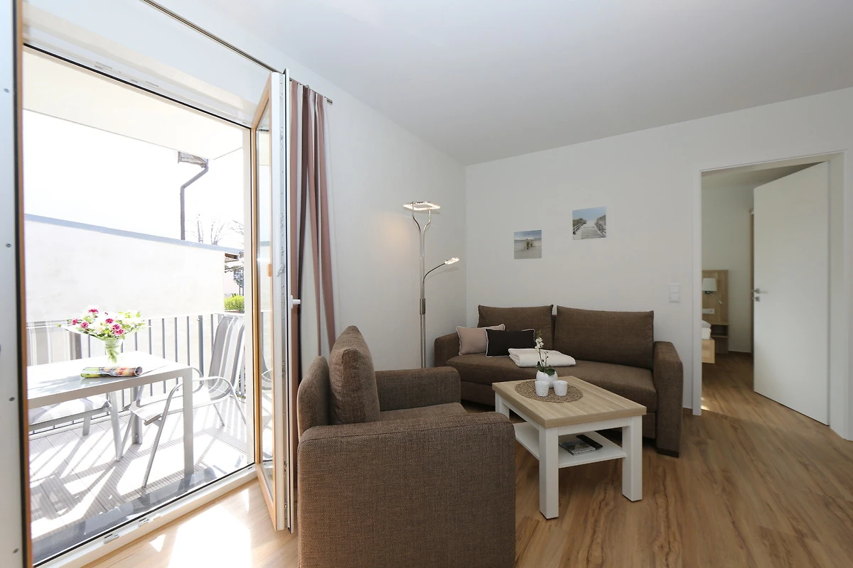 Dieses Appartement befindet sich in der 1. Etage der im Jahr 2016 erbauten Ahlbeck Suiten und ist für 2 bis 3 Personen geeignet. Das modern und hell eingerichtete 2-Zimmer Appartement ist 53 qm gross und verfügt über einen Balkon, wo Sie bereits morgens die Sonne geniessen können. Im lichtdurchfluteten Wohnraum befinden sich eine gemütliche Sitzecke mit Sessel und einer zum Relaxen einladenden Couch mit Schlaffunktion sowie ein Couchtisch. Ausserdem vorhanden ist ein Esstisch, der Platz für 4 Personen bietet. Fernseher und Stereoanlage sind selbstverständlich vorhanden. Ebenso im Wohnraum integriert ist eine moderne Küchenzeile, die mit Induktionskochfeld, Kombi-Mikrowelle, Kühlschrank und Geschirrspülmaschine ausgestattet ist. Das Schlafzimmer ist mit einem komfortablen Doppelbett und einem Kleiderschrank mit ausreichend Stauraum eingerichtet. Im Badezimmer finden Sie eine ebenerdige Dusche, einen schönen Waschtisch mit ausreichend Aufbewahrungsmöglichkeiten und grossem Spiegel sowie ein WC vor. Für angenehme Wärme sorgt eine Fussbodenheizung in der kompletten Wohnung.
