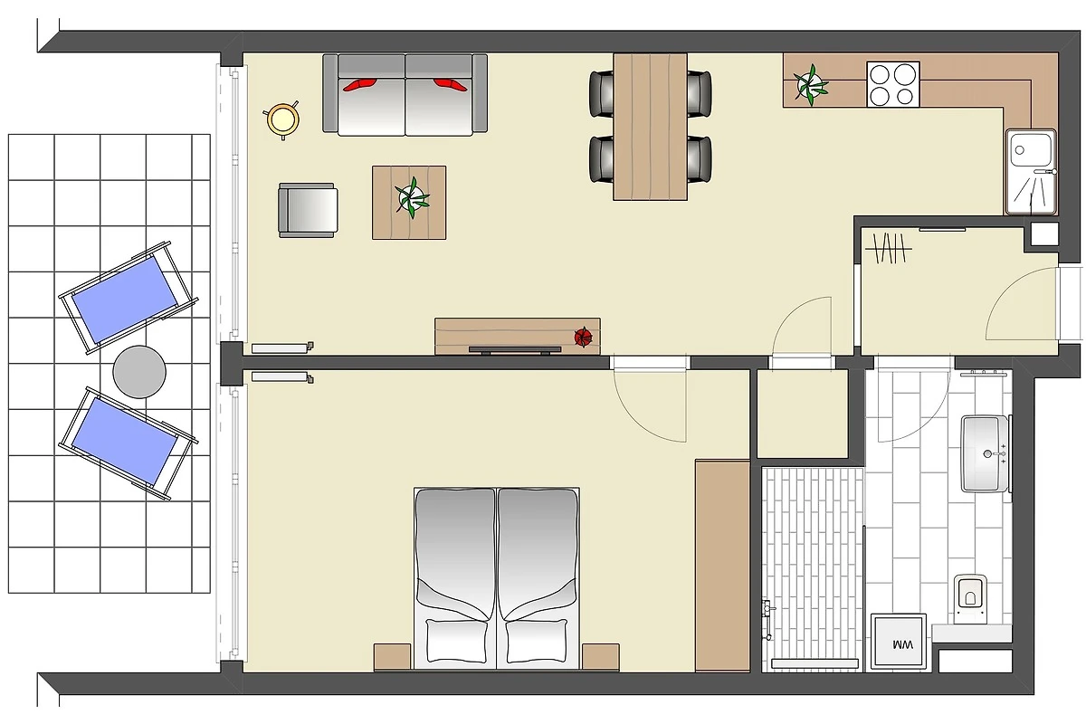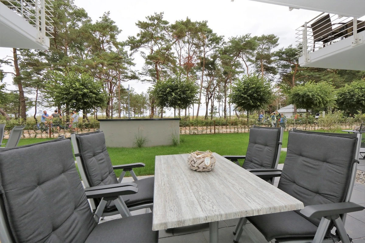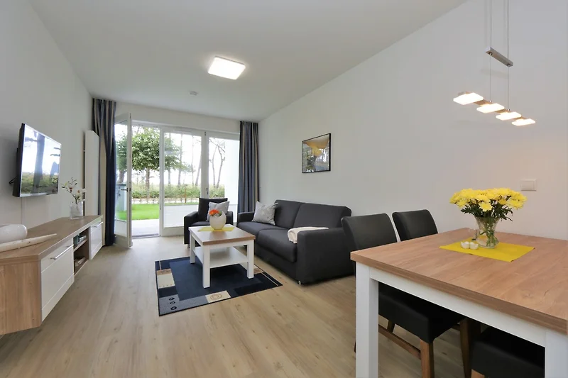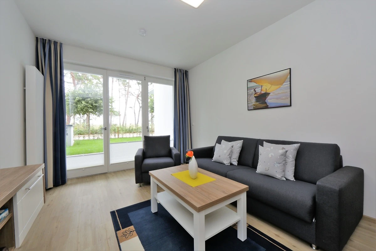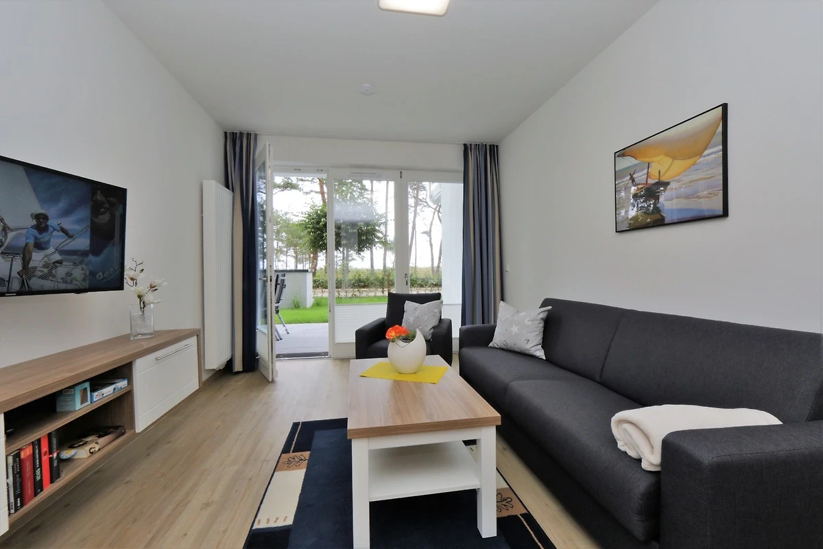 Diese hochwertige 2-Zimmer Wohnung ist 59 qm gross und liegt im Erdgeschoss. Sie bietet maximal 4 Personen Platz für einen erholsamen Ostseeaufenthalt direkt am Meer. Der liebevoll eingerichtete Wohnraum verfügt über ein gemütliches Sofa mit Schlaffunktion (Liegefläche 160 x 200), Couchtisch und Flat TV. Der Essplatz und die Küchenzeile incl. Geschirrspüler, Ceranfeld, Backofen, Mikrowelle, Kühlschrank etc. sind ebenfalls offen im Wohnraum integriert. Auf der überdachten Terrasse zur Seeseite geniessen Sie ihr Frühstück schon im Freien und haben die Promenade im Blick. Die Düne versperrt Ihnen den Blick auf die Ostsee jedoch nicht das Rauschen. Das Schlafzimmer ist mit einem komfortablen Doppelbett mit getrennten Matratzen (90 x 200) und ausreichend Schrankraum eingerichtet. Das grosszügige, moderne Bad ist mit einer ebenerdigen Dusche und Waschtisch/WC ausgestattet.
