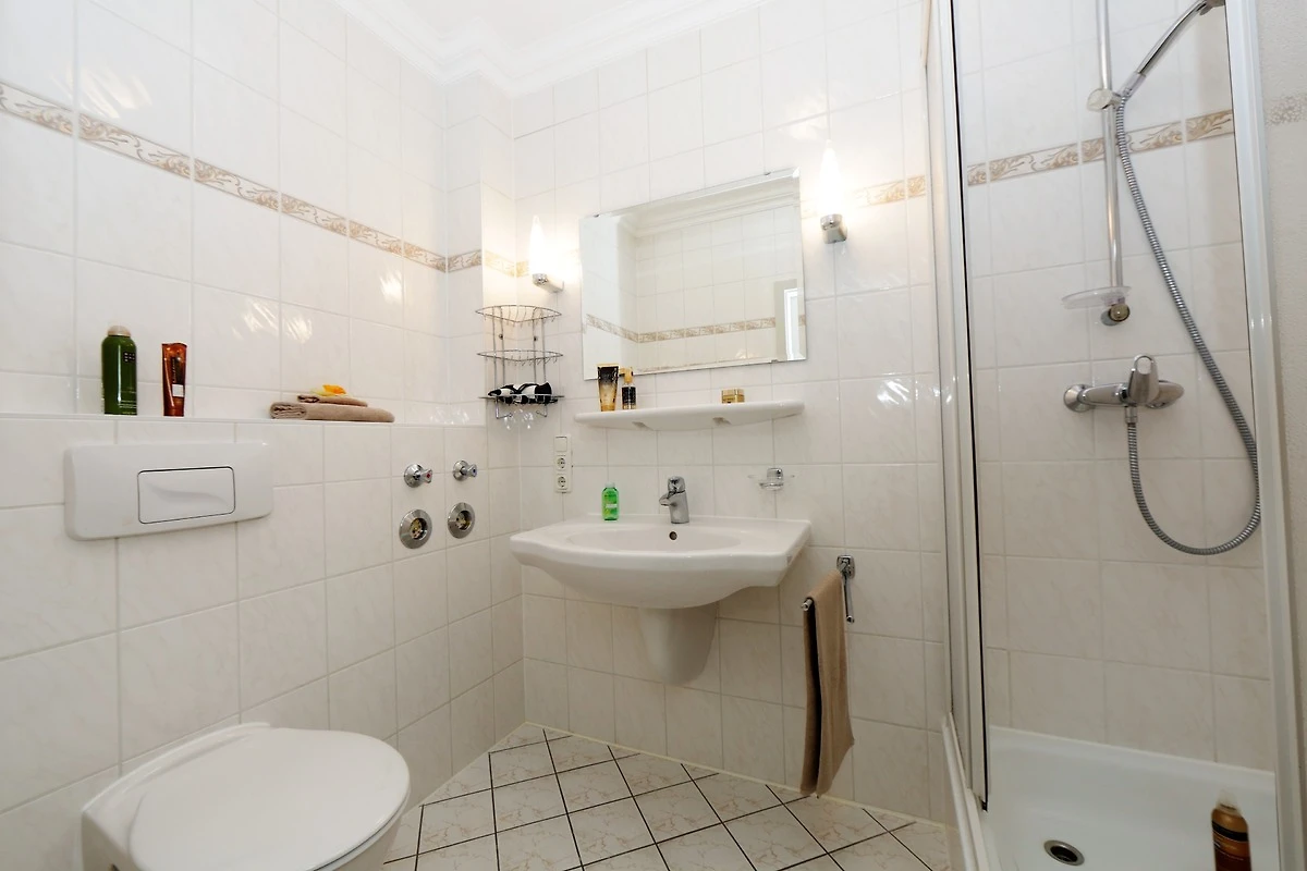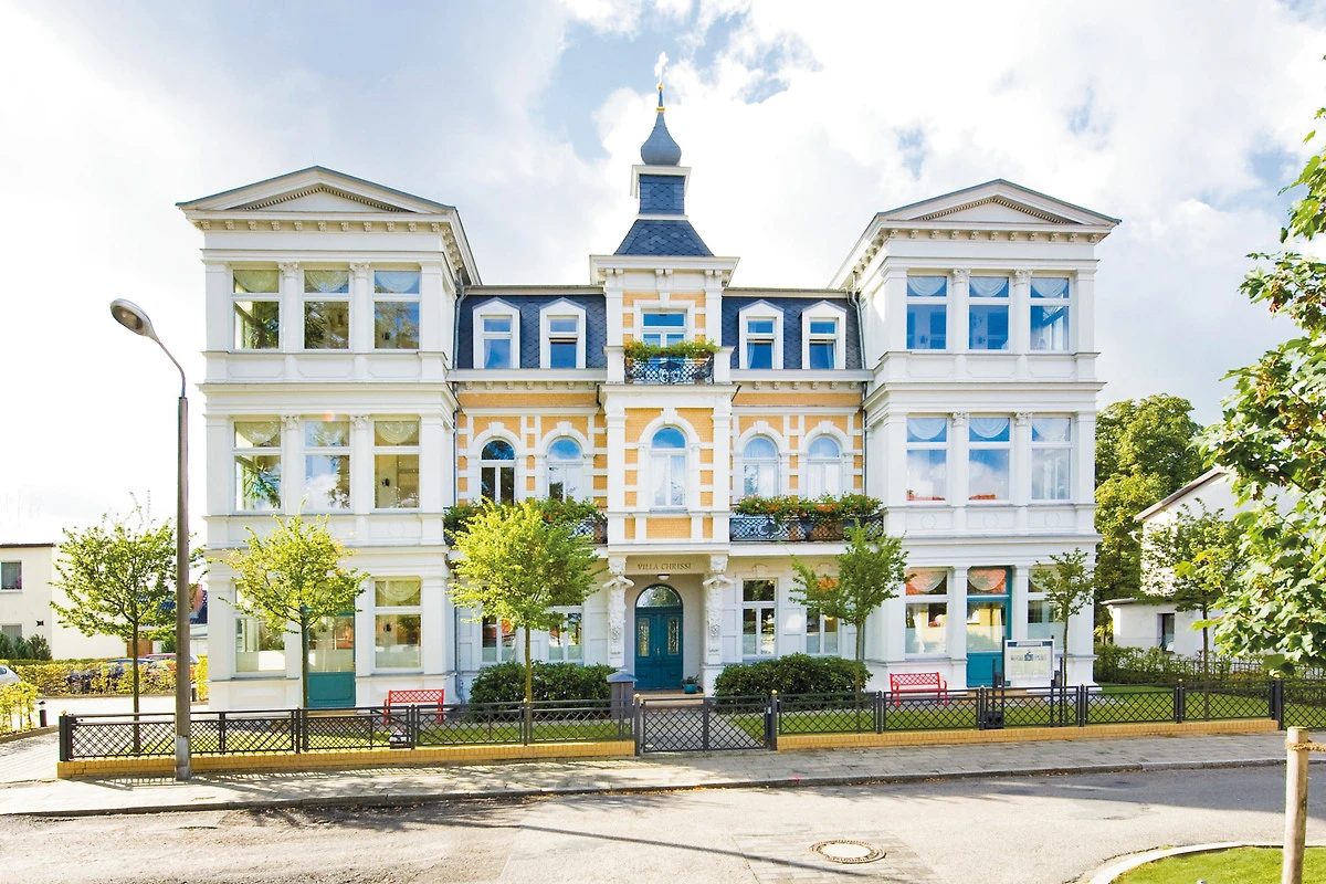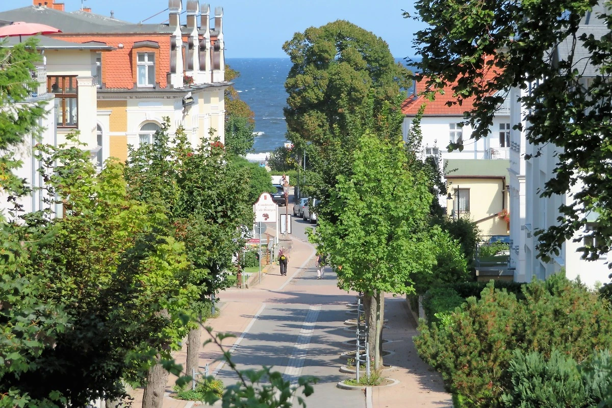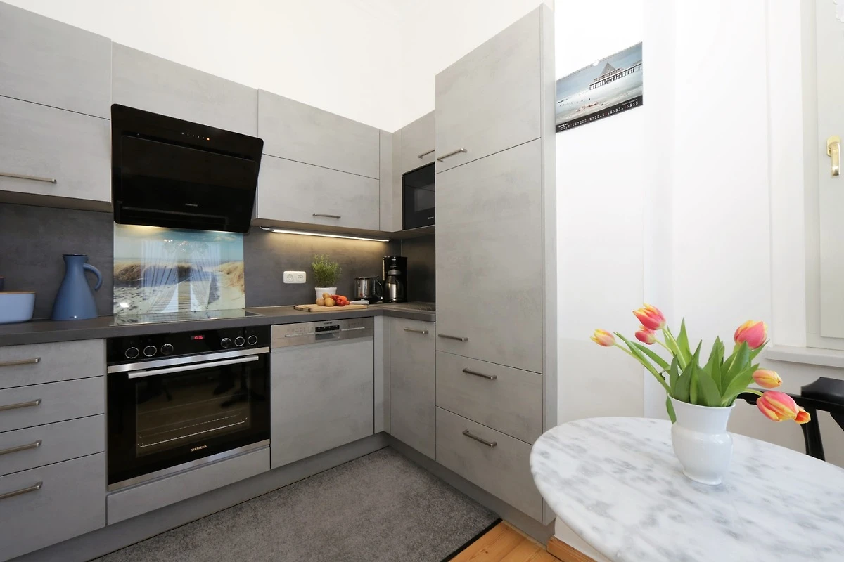 Diese moderne und gemütlich eingerichtete 55 qm grosse Zwei-Zimmer Wohnung liegt im 1. Obergeschoss und bietet 4 Personen viel Platz für einen entspannten Urlaub. Das helle Wohnzimmer bietet den Gästen ein Ledersofa mit Schlaffunktion (Matratze 140 x 200) und einen Essplatz sowie einen grossen Flat TV. Vom Wohnraum begehbar ist der Balkon in Richtung Meer. Hier schweift der Blick die verkehrsruhige Bismarckstrasse hinunter bis zur Promenade und die Ostsee. Die halboffene Küche mit Ceranfeld, Spülmaschine, Kühlschrank und Mikrowelle bietet einen kleinen Essplatz im Erker mit dem gleichen schönem Blick in Richtung Ostsee. Das Schlafzimmer mit einem Boxspringbett mit getrennten Matratzen (180 x 200) und reichlich Schrankraum kann mit einem zweiten Balkon ebenfalls mit Meerblick aufwarten. Darüber hinaus steht den Gästen ein Duschbad mit Waschbecken/WC zur Verfügung.