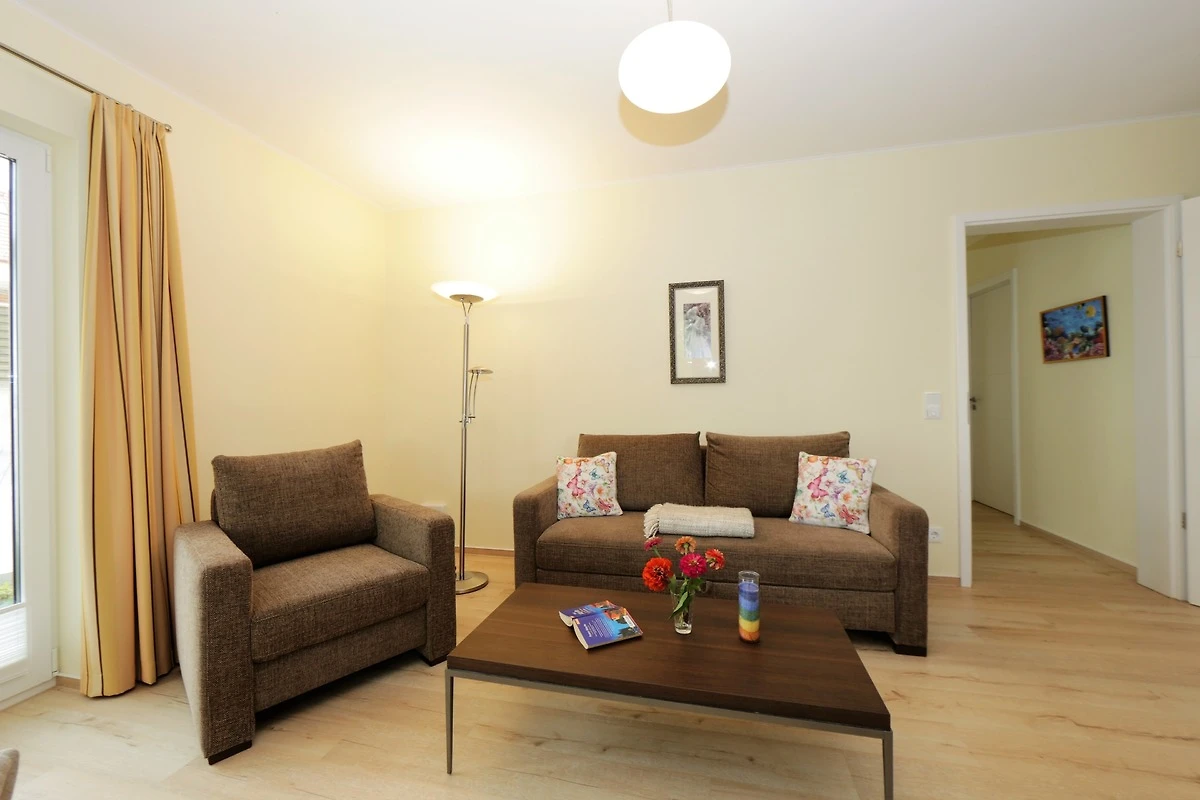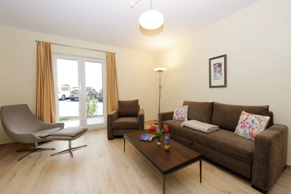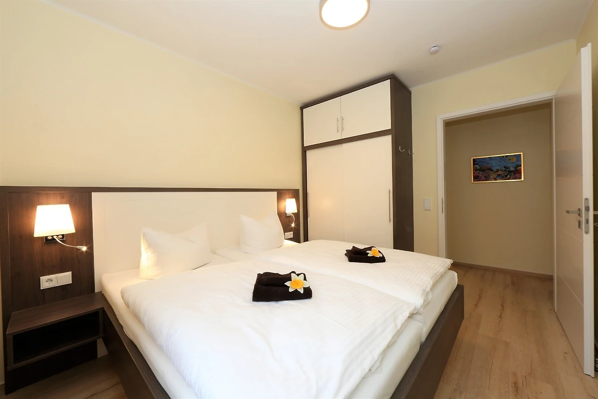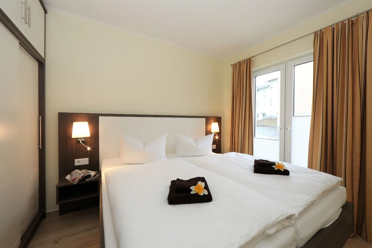 Dieses hochwertige und moderne 3-Zimmer Appartement ist 76 qm gross und befindet sich im Erdgeschoss der 2016 neu erbauten Ahlbeck Suiten. Die Wohnung ist für 4-6 Personen geeignet. Im hell eingerichteten Wohnbereich erwartet Sie eine behagliche Polstergarnitur mit Schlaffunktion (Liegefläche 160 x 200) zum Relaxen, ein moderner Couchtisch sowie ein Esstisch und ein Flat- TV mit integriertem Radio. Die im Wohnraum integrierte Küchenzeile ist mit Cerankochfeld, Backofen, Geschirrspülmaschine und Kühlschrank ausgestattet. Die hellen Schlafzimmer verfügen jeweils über ein komfortables Doppelbett mit getrennten Matratzen (90 x 200) und einen grosszügigen Kleiderschrank. Das moderne Badezimmer ist mit einer ebenerdigen Dusche, einem grossen Waschtisch, WC sowie einer Waschmaschine ausgestattet. Für eine behagliche Wärme an kälteren Tagen sorgt in der kompletten Wohnung die Fussbodenheizung. Über den Wohnbereich erreichen Sie die nach Westen ausgerichtete überdachte Terrasse.