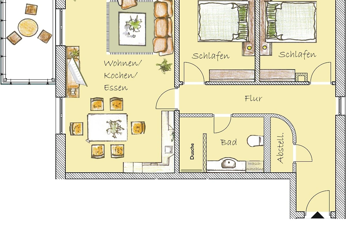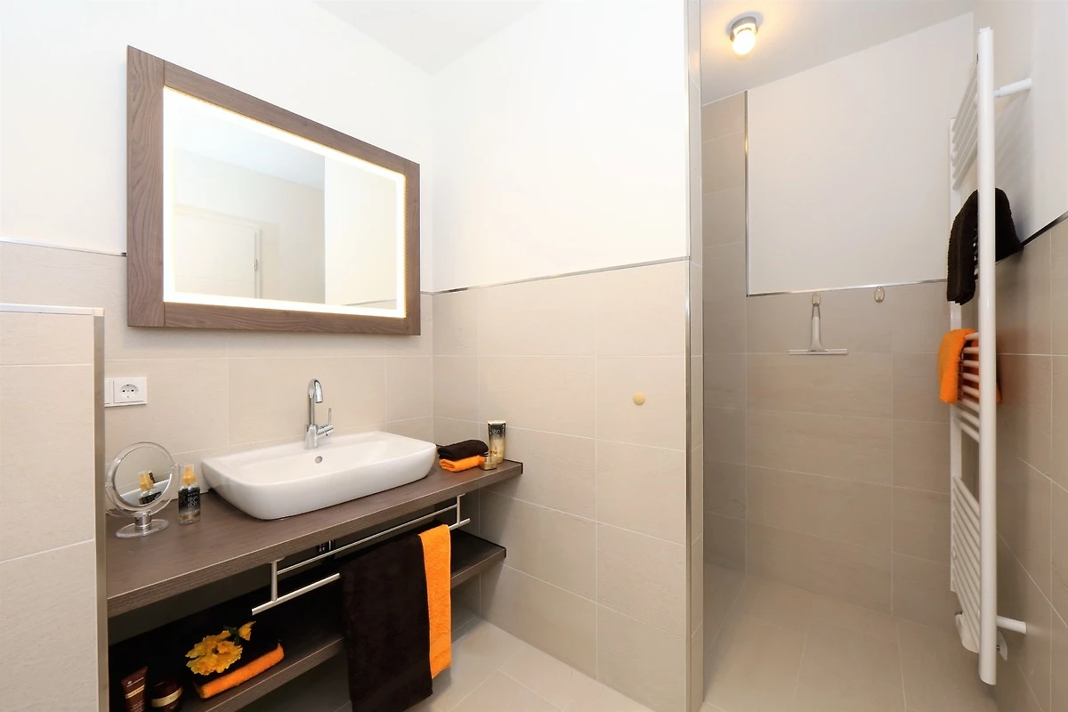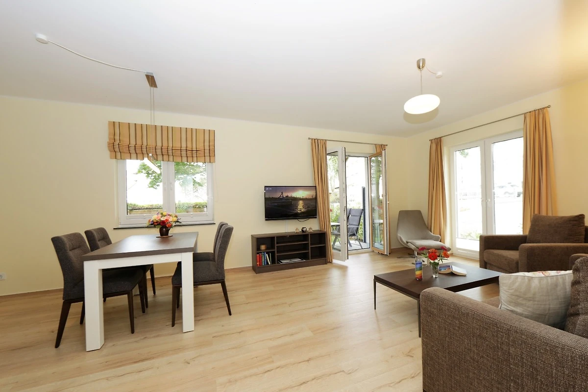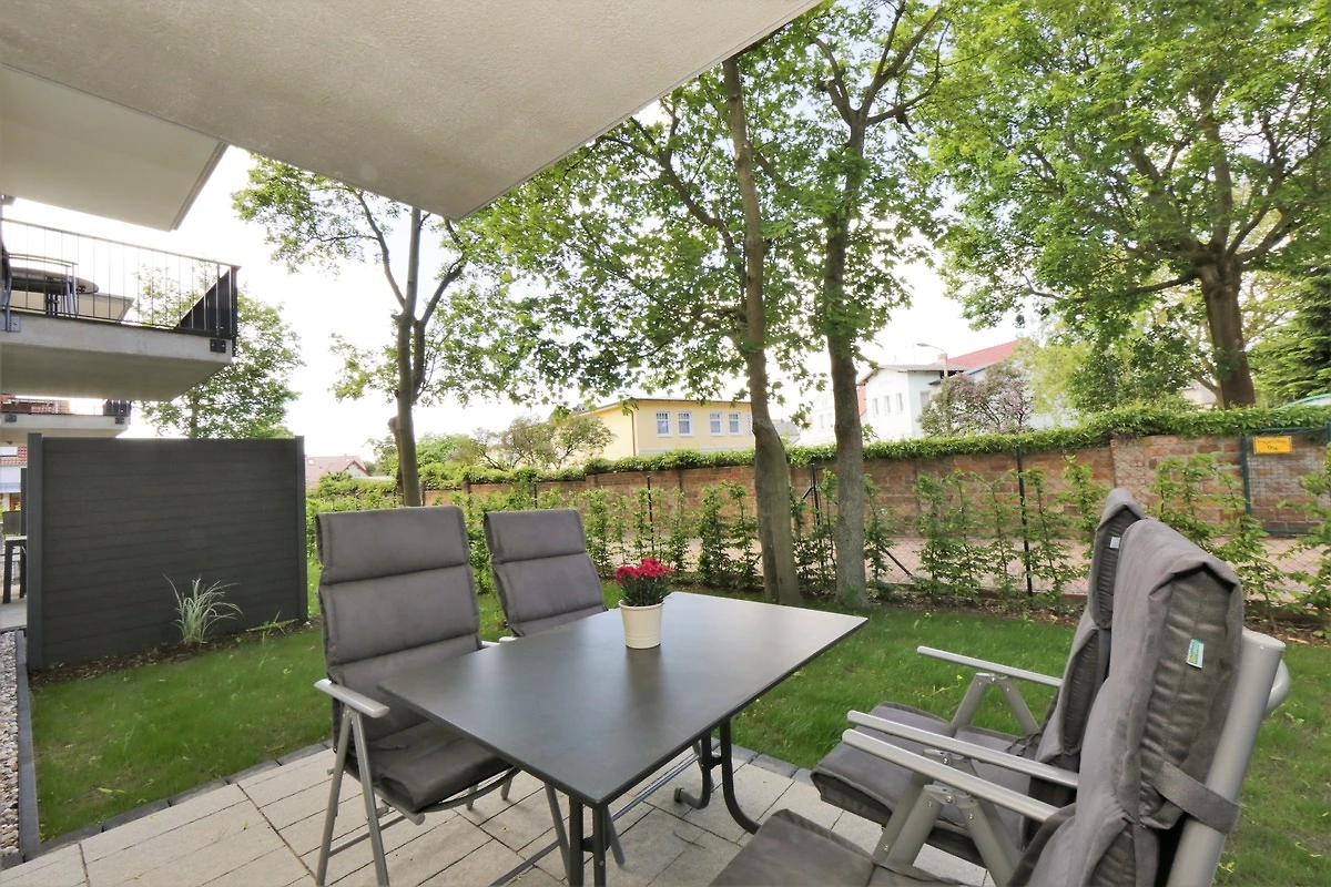 Dieses hochwertige und moderne 3-Zimmer Appartement ist 76 qm gross und befindet sich im Erdgeschoss der 2016 neu erbauten Ahlbeck Suiten. Die Wohnung ist für 4-6 Personen geeignet. Im hell eingerichteten Wohnbereich erwartet Sie eine behagliche Polstergarnitur mit Schlaffunktion (Liegefläche 160 x 200) zum Relaxen, ein moderner Couchtisch sowie ein Esstisch und ein Flat- TV mit integriertem Radio. Die im Wohnraum integrierte Küchenzeile ist mit Cerankochfeld, Backofen, Geschirrspülmaschine und Kühlschrank ausgestattet. Die hellen Schlafzimmer verfügen jeweils über ein komfortables Doppelbett mit getrennten Matratzen (90 x 200) und einen grosszügigen Kleiderschrank. Das moderne Badezimmer ist mit einer ebenerdigen Dusche, einem grossen Waschtisch, WC sowie einer Waschmaschine ausgestattet. Für eine behagliche Wärme an kälteren Tagen sorgt in der kompletten Wohnung die Fussbodenheizung. Über den Wohnbereich erreichen Sie die nach Westen ausgerichtete überdachte Terrasse.