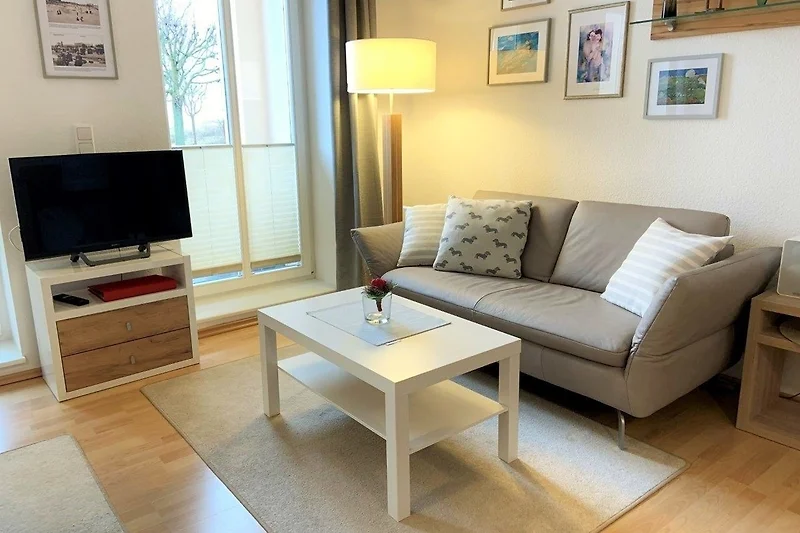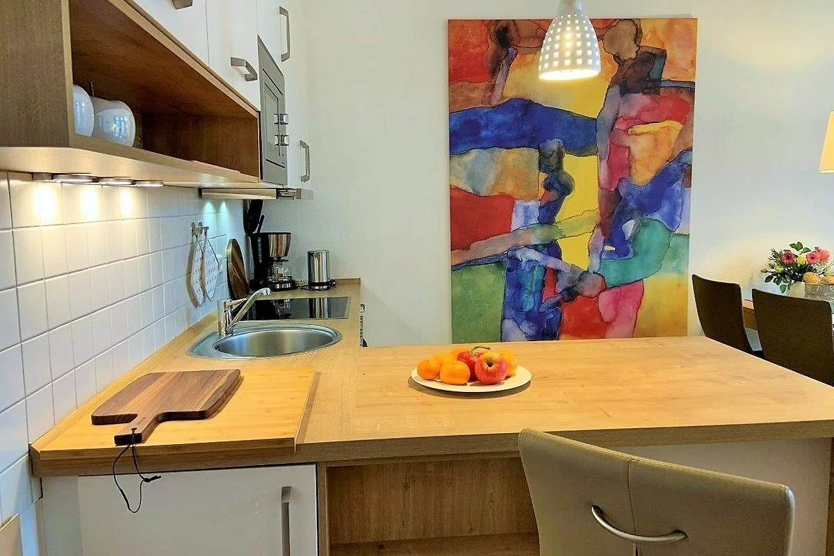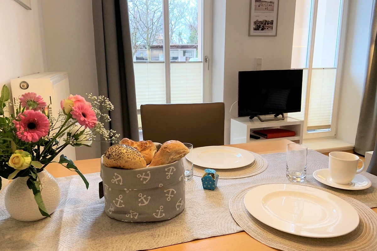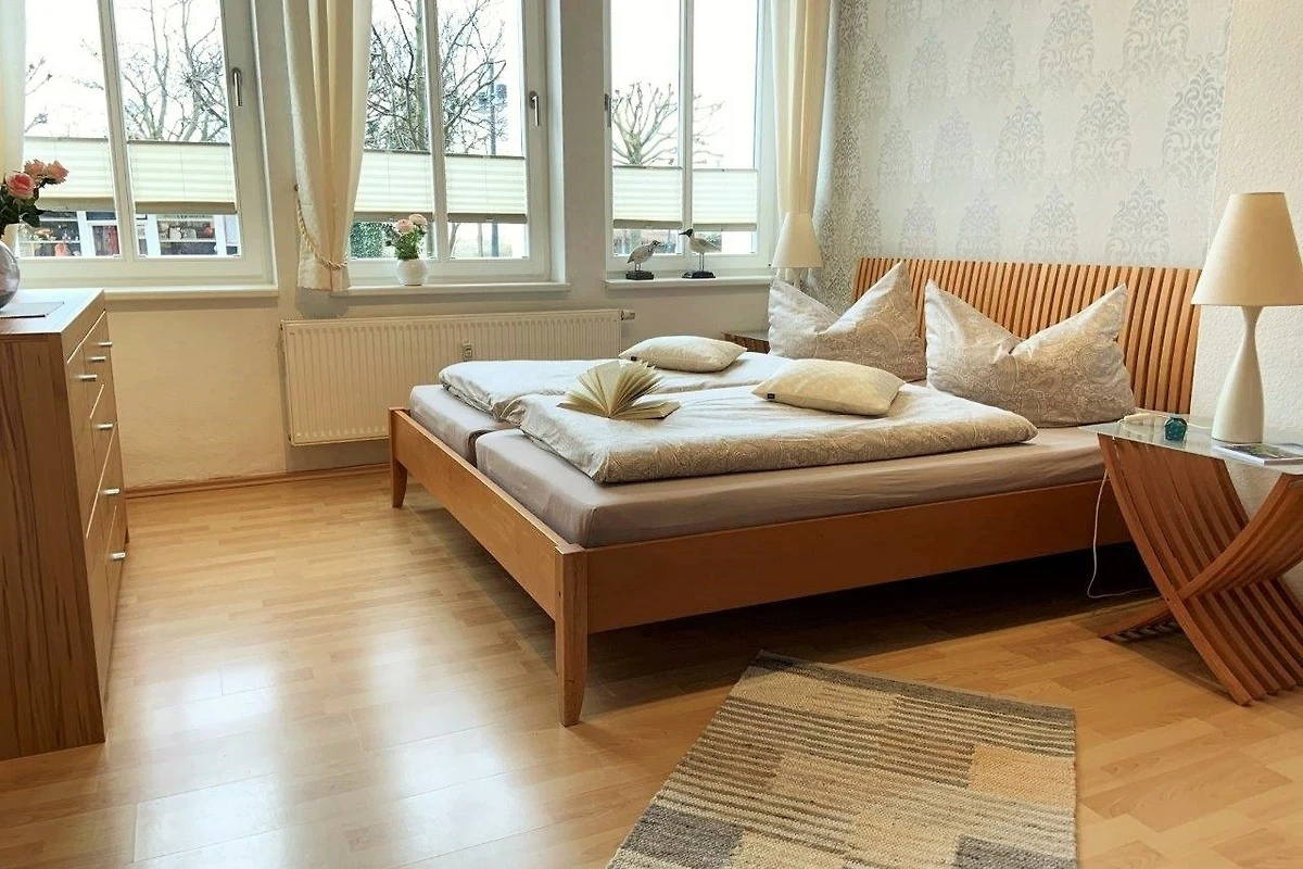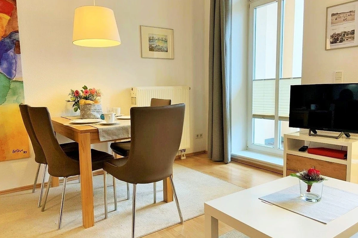 Die geschmackvoll eingerichtete, neu ausgestattete Komfortwohnung befindet sich in direkter Strandlage an der Promenade. Mit wenigen Schritten erreichen Sie das Meer. Die historische Seebrücke ist nur ca. 300 m entfernt. Die im Erdgeschoss gelegene Wohnung ist hochwertig und modern ausgestattet. Sie bietet auf 48 m² mit 2-Zimmern reichlich Platz für 2-4 Personen. Grosse Fenster und hohe Decken geben ein lichtes Raumgefühl. Ein kostenfreier W-LAN-Zugang, handsignierte Bilder und viele originelle Details runden den Urlaubskomfort ab. Im Wohnbereich befindet sich die gemütliche Sitzecke mit Ledersofa, Flachbildfernseher sowie Radio/CD-Player. Der Essbereich bietet Platz für 4 Personen. Vom Balkon, der vom Wohnraum betreten wird und zur Promenade ausgerichtet ist, gibt es den ganzen Tag Interessantes zu beobachten. Die moderne Vollküche mit Geschirrspüler, Backofen mit Ceranfeld, Kühlschrank, Mikrowelle pp. ist offen im Wohnraum integriert. Sie bietet mit ihrer grossen Arbeitsplatte einen zusätzlichen Sitzplatz. Das geräumige helle Schlafzimmer verfügt über ein Doppelbett mit getrennten Matratzen (90 x 200) und einen zusätzlichen Flachbildfernseher. Es befindet sich dort ein Garderobenschrank mit Spiegel sowie eine grosse Kommode. Für Kleinkinder ist ein Kinderbett vorhanden. Das Badezimmer ist mit Dusche, WC und einem Haartrockner ausgestattet. Alle Zimmer gehen von einem kleinen Flur ab. Ein Pkw-Stellplatz in der Doppelparkergarage (max. Höhe 1,50 m, Länge 5,00m) befindet sich auf dem Grundstück und ist dem Appartement zugeordnet. Für Fahrräder gibt es ebenfalls Stellplätze.