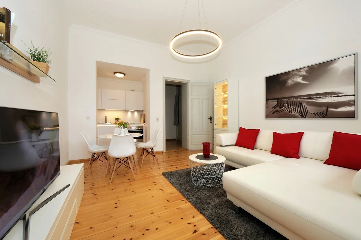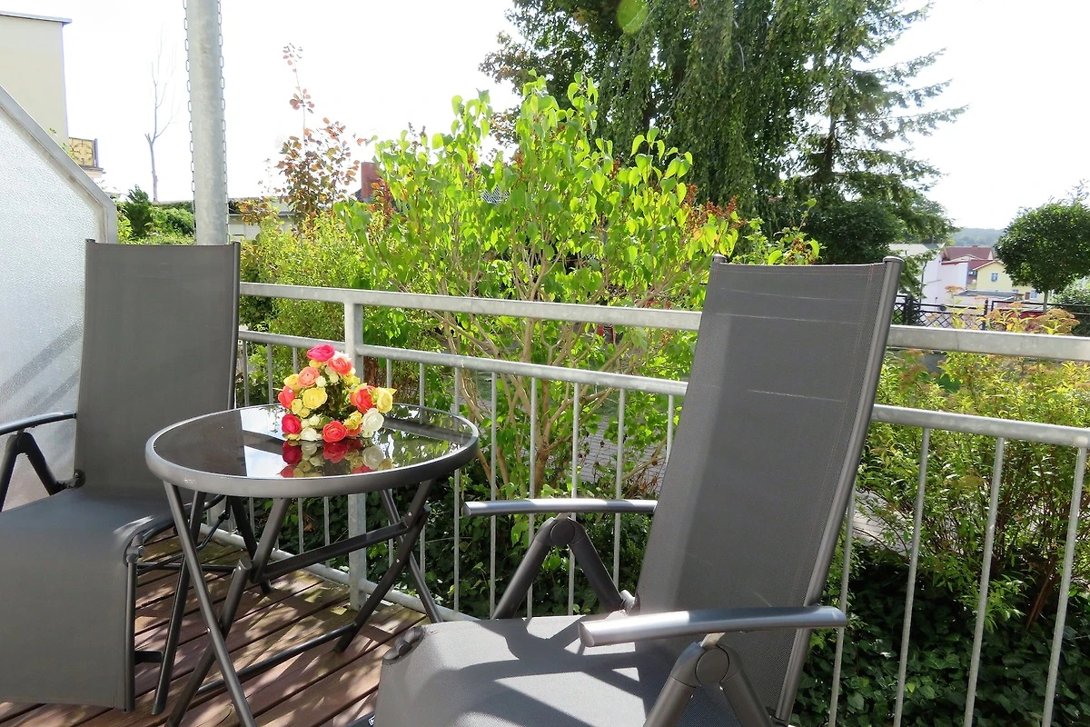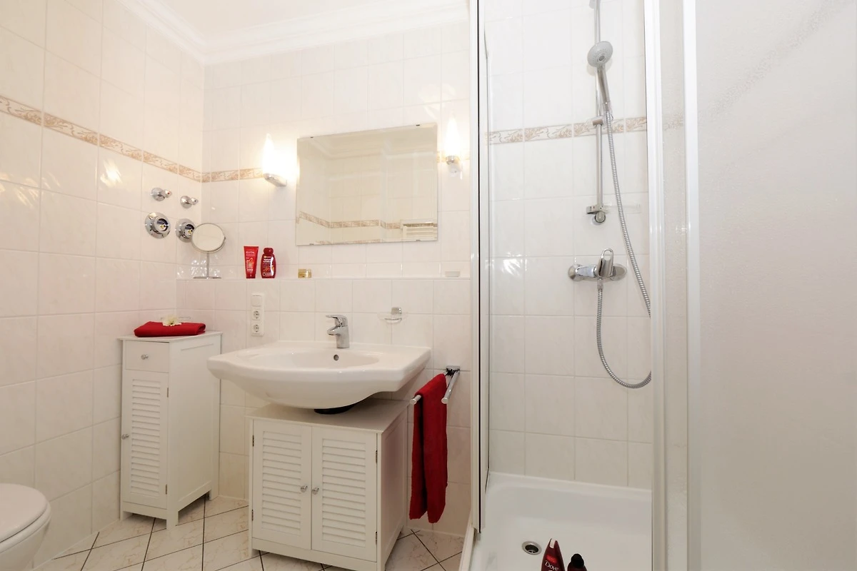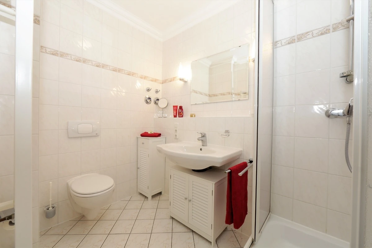 Diese hochwertig und modern eingerichtete 47 qm grosse Zwei-Zimmer Wohnung liegt im Erdgeschoss und bietet 2 Personen viel Platz für einen entspannten Urlaub. Das Wohnzimmer ist mit einer grosszügigen Ledersitzecke, Couchtisch und TV eingerichtet. Hier schweift der Blick in die verkehrsruhige, aber zentral gelegene Bismarckstrasse bis zum Meer hinunter. Ein separater Essplatz im Wohnraum grenzt an die offene Küche mit Ceranfeld, Spülmaschine, Kühlschrank mit Gefrierfach und Backofen. Das Schlafzimmer ist mit einem Boxspringbett mit getrennten Matratzen (durchgängiger Topper 180 x 200) und reichlich Schrankraum ausgestattet. Vom Schlafzimmer begehbar ist der Balkon in Richtung Süden, der die Gäste bereits zum Frühstück ins Freie lockt. Darüber hinaus steht den Gästen ein Duschbad mit Waschbecken/WC zur Verfügung.
