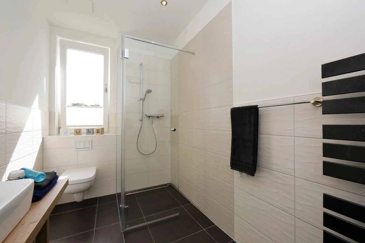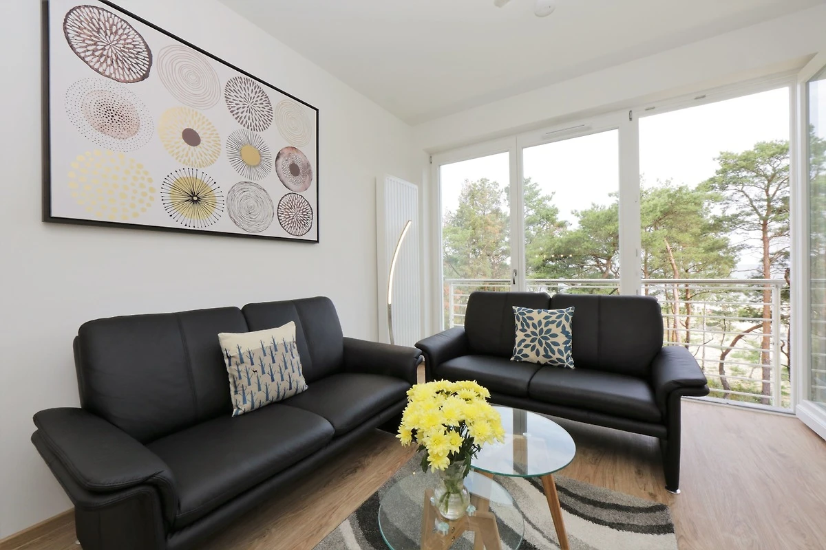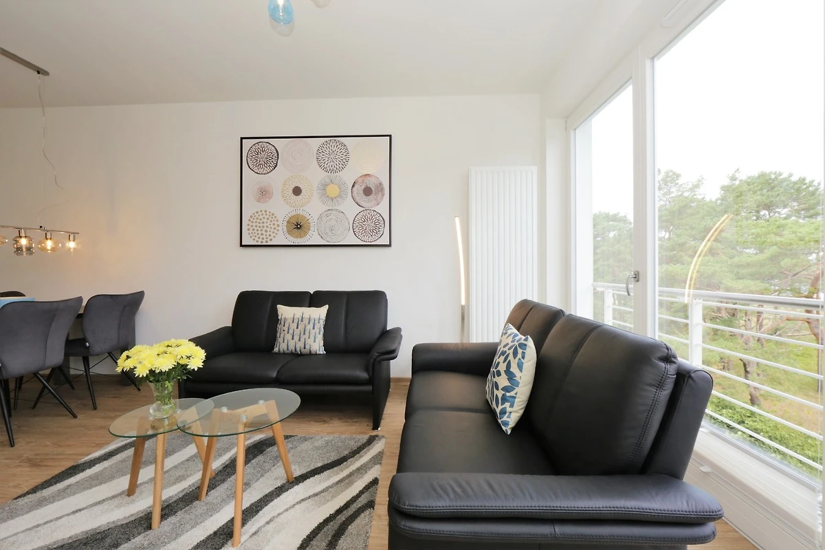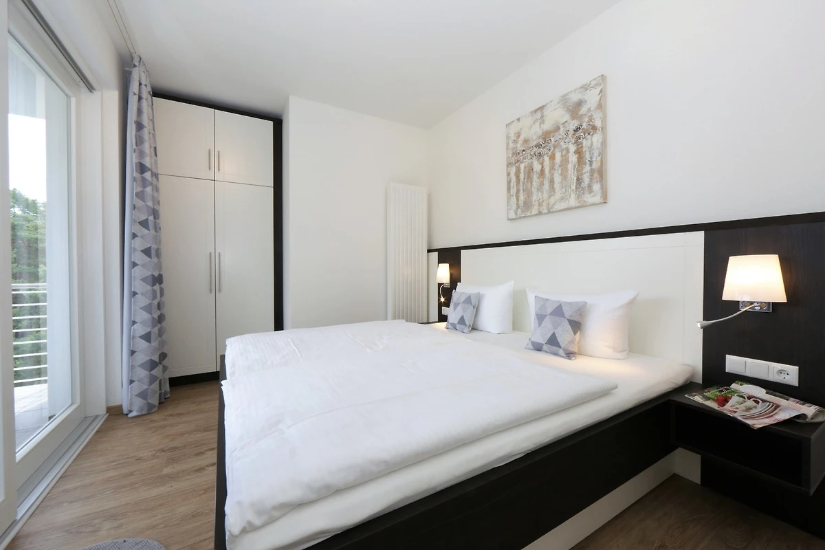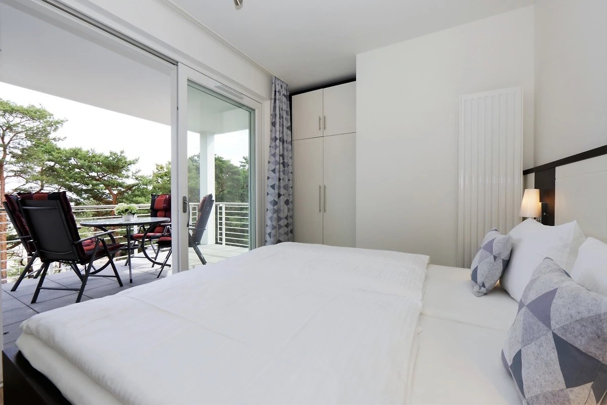 Dieses hochwertige, moderne 3-Zimmer Appartement ist 64 qm gross und befindet sich im 3. Obergeschoss der 2018 neu erbauten Strandresidenz. Die Wohnung mit 2 Schlafzimmern bietet 4 Personen reichlich Komfort im Urlaub. Im Wohnbereich erwarten Sie eine bequeme Polstergarnitur und Flat TV sowie ein Esstisch für gemeinsame Mahlzeiten. Die Küche mit Cerankochfeld, Backofen, Geschirrspülmaschine, Kühlschrank etc. ist ebenfalls offen im Wohnraum integriert. Über den Wohnbereich sowie eines der Schlafzimmer erreichen Sie den zur Promenade ausgerichteten Balkon mit herrlichem Blick auf die Ostsee und den vor dem Haus befindlichen Strandzugang. Hier haben Sie bereits zum Frühstück alles im Blick. Die Schlafzimmer verfügen jeweils über ein komfortables Doppelbett mit getrennten Matratzen (90 x 200) und einen Kleiderschrank. Eines der Schlafzimmer ist mit einem zusätzlichen TV ausgestattet. Das grosszügige moderne Badezimmer mit Fenster ist mit einer bodengleichen Dusche mit Echtglasabtrennung und Waschtisch/WC ausgestattet. Ausserdem steht Ihnen ein Gäste-WC zur Verfügung.