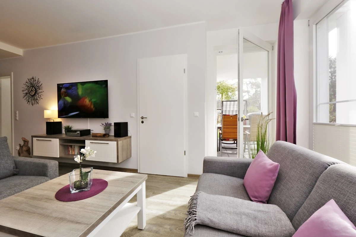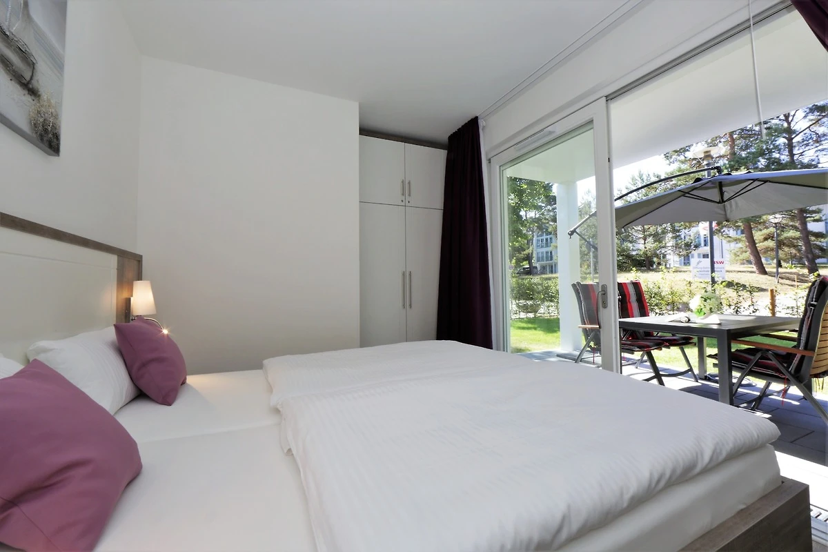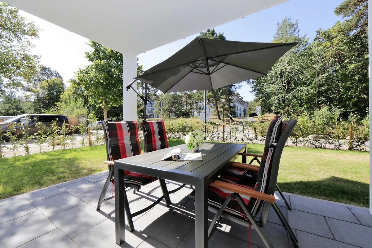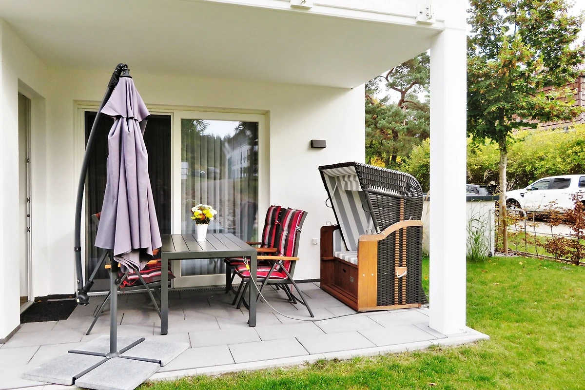 Dieses hochwertig und geschmackvoll eingerichtete 3-Zimmer Appartement ist 60 qm gross und befindet sich im Erdgeschoss der 2018 neu erbauten Strandresidenz. Die Wohnung mit 2 Schlafzimmern bietet 4 Personen reichlich Komfort im Urlaub. Im Wohnbereich mit grosser Fensterfront erwartet Sie eine bequeme Polstergarnitur mit zwei Sofas und einem Sessel, ein Couchtisch und Flat TV sowie ein Esstisch für gemeinsame Mahlzeiten. Die moderne Küche mit Cerankochfeld, Backofen, Mikrowelle, Geschirrspüler, Kühlschrank etc. ist ebenfalls offen im Wohnraum integriert. Beide Schlafzimmer verfügen jeweils über ein komfortables Doppelbett mit getrennten Matratzen (90 x 200) und reichlich Schrankraum. Eines der Schlafzimmer bietet Ihnen einen zusätzlichen TV. Über den Wohnbereich sowie eines der Schlafzimmer erreichen Sie die grosse zum Süden ausgerichtete überdachte möblierte Terrasse, die viele erholsame Sonnenstunden und Mahlzeiten im Freien verspricht. Der Strandkorb beschert Ihnen ein wenig Abgeschiedenheit. Das Badezimmer mit Fenster ist mit einer bodengleichen Dusche mit Echtglasabtrennung und Waschtisch/WC ausgestattet.