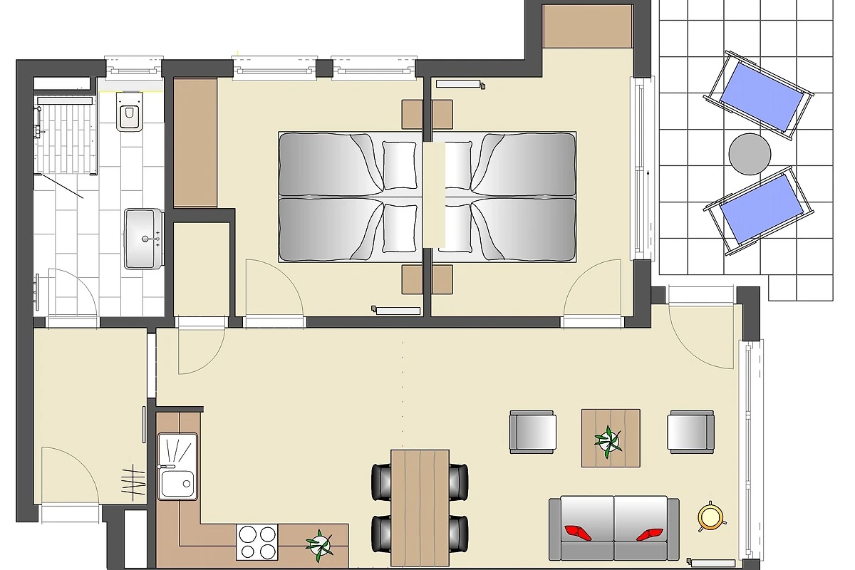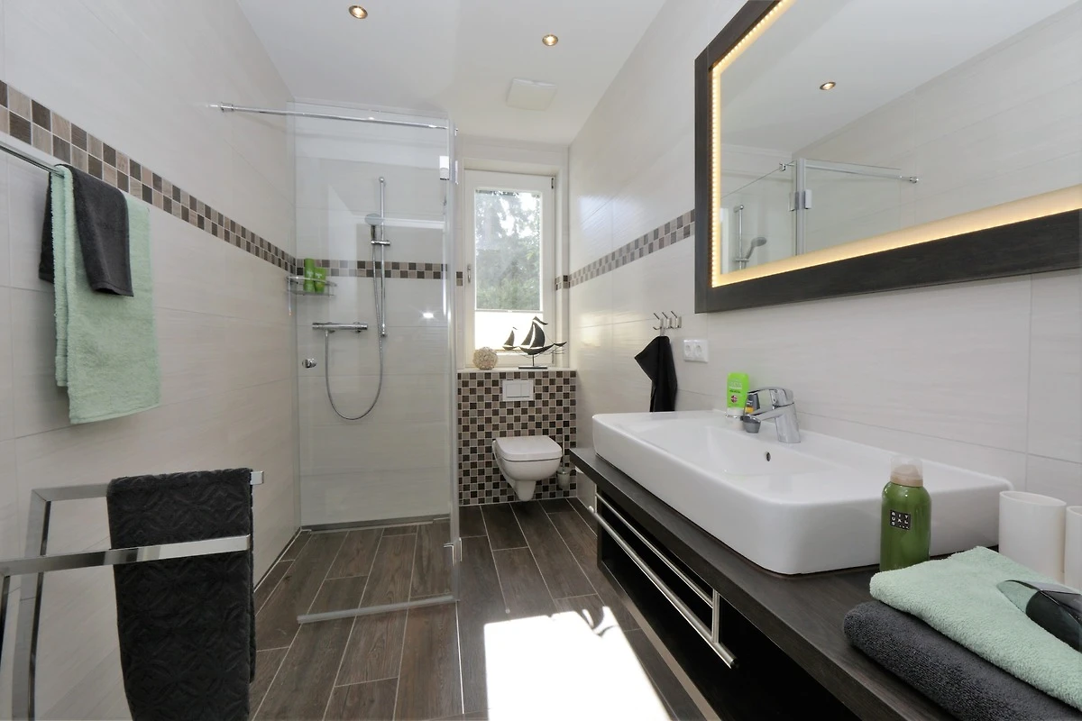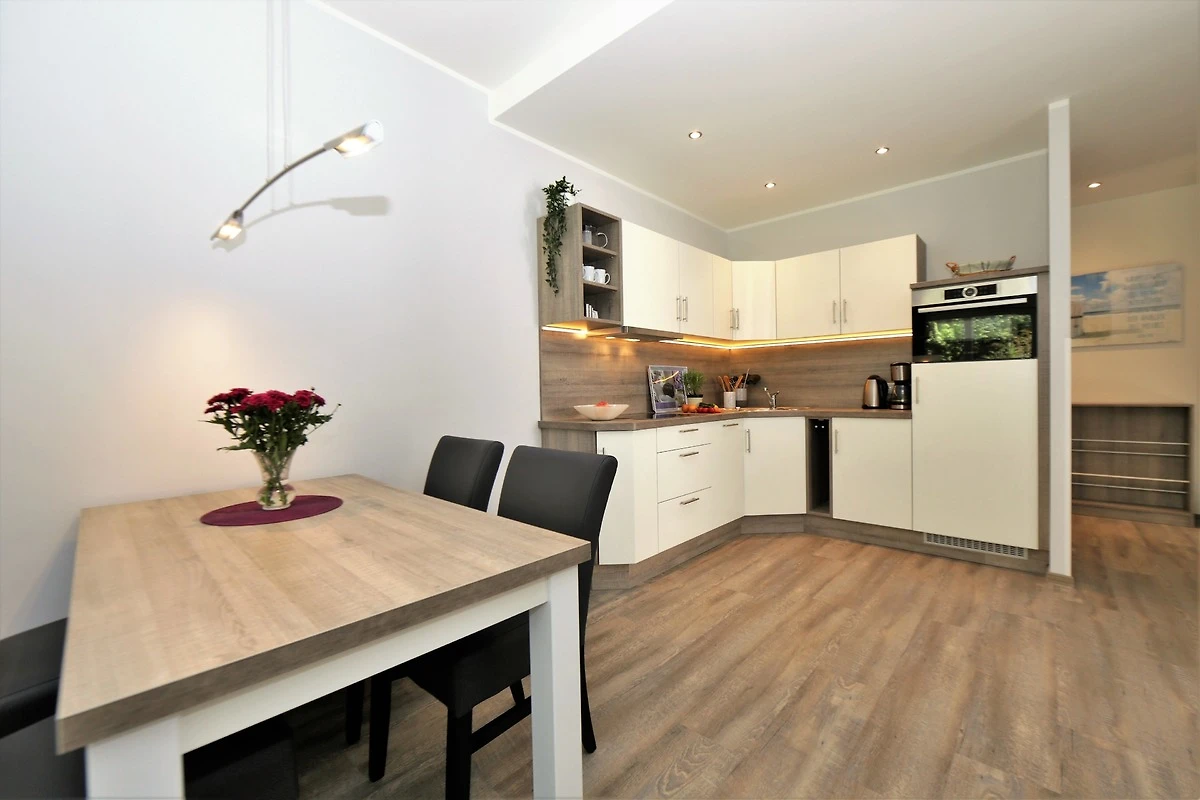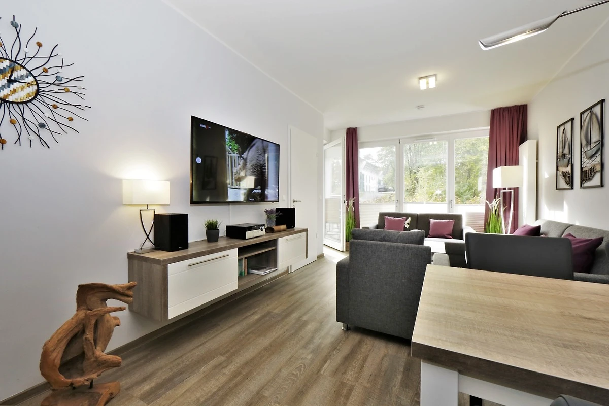 Dieses hochwertig und geschmackvoll eingerichtete 3-Zimmer Appartement ist 60 qm gross und befindet sich im Erdgeschoss der 2018 neu erbauten Strandresidenz. Die Wohnung mit 2 Schlafzimmern bietet 4 Personen reichlich Komfort im Urlaub. Im Wohnbereich mit grosser Fensterfront erwartet Sie eine bequeme Polstergarnitur mit zwei Sofas und einem Sessel, ein Couchtisch und Flat TV sowie ein Esstisch für gemeinsame Mahlzeiten. Die moderne Küche mit Cerankochfeld, Backofen, Mikrowelle, Geschirrspüler, Kühlschrank etc. ist ebenfalls offen im Wohnraum integriert. Beide Schlafzimmer verfügen jeweils über ein komfortables Doppelbett mit getrennten Matratzen (90 x 200) und reichlich Schrankraum. Eines der Schlafzimmer bietet Ihnen einen zusätzlichen TV. Über den Wohnbereich sowie eines der Schlafzimmer erreichen Sie die grosse zum Süden ausgerichtete überdachte möblierte Terrasse, die viele erholsame Sonnenstunden und Mahlzeiten im Freien verspricht. Der Strandkorb beschert Ihnen ein wenig Abgeschiedenheit. Das Badezimmer mit Fenster ist mit einer bodengleichen Dusche mit Echtglasabtrennung und Waschtisch/WC ausgestattet.