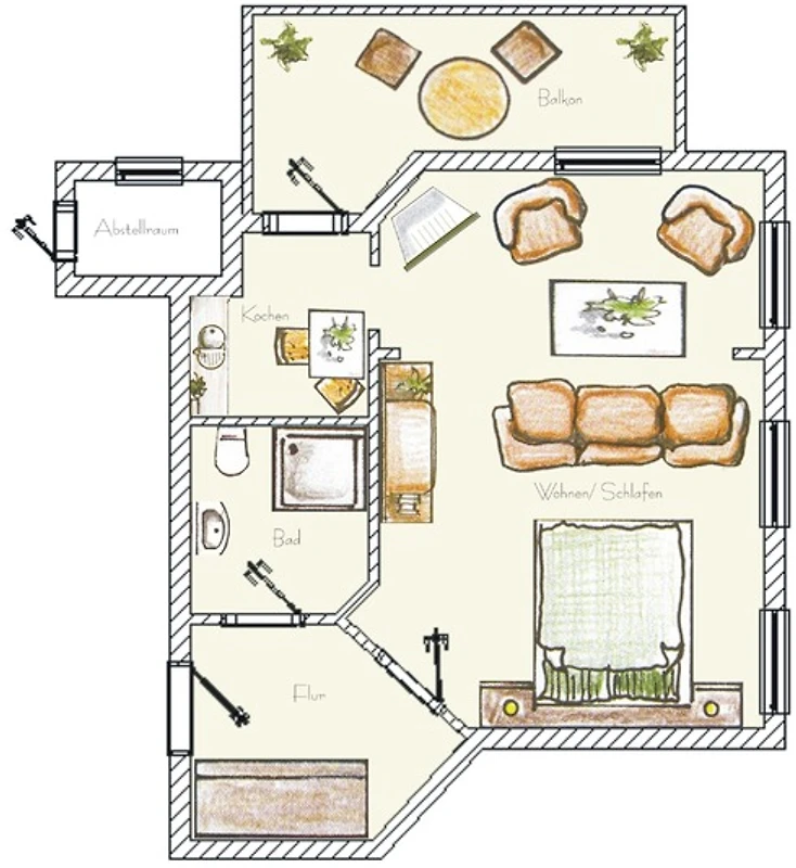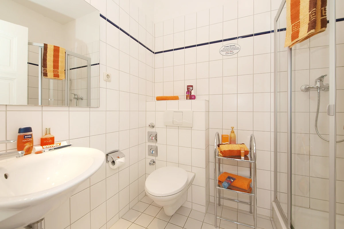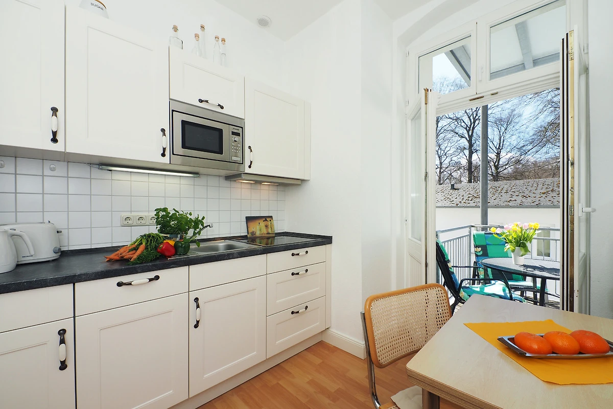 Dieses 41 qm grosse sonnige 1-Zimmer-Appartement befindet sich im 1. Obergeschoss der Villa. Aufgrund der südlichen Ausrichtung ist diese Wohnung besonders hell und freundlich. Im Wohnraum stehen für Sie eine gemütliche Polsterecke, Flat-TV und Radio zur Nutzung bereit. Das Doppelbett mit getrennten Matratzen (90 x 200) befindet sich ebenfalls im Wohnraum. Reichlich Schrankraum steht den Gästen im Flur zur Verfügung. Das Appartement verfügt ausserdem über eine separate Küche incl. Ceranfeld, Kühlschrank, Spülmaschine, Mikrowelle pp. Von hier aus gelangen Sie auf den grosszügigen südlich ausgerichteten Balkon mit Blick in den Buchenpark, der viele Sonnenstunden verspricht. Das Bad ist mit Dusche sowie Waschbecken/WC ausgestattet.