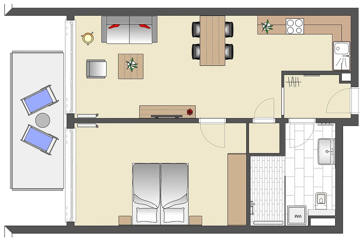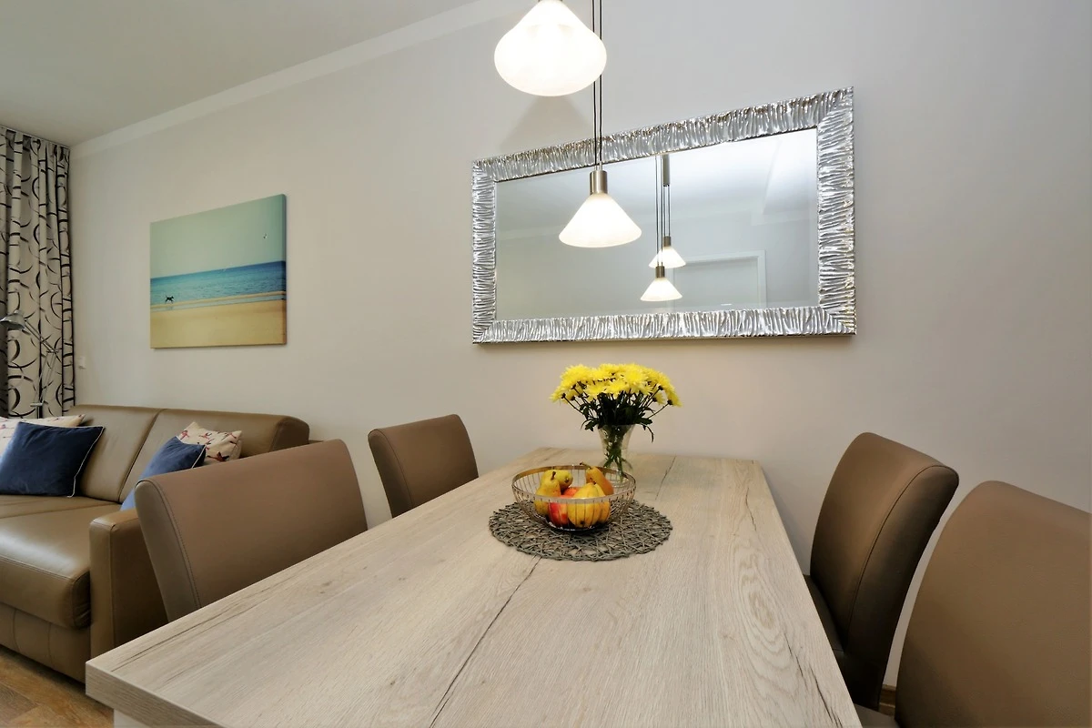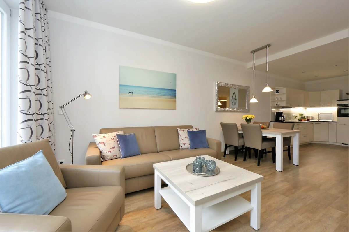 Die moderne hochwertige 2-Zimmer Ferienwohnung mit 58 m² Wohnfläche befindet sich im 1. Obergeschoss der Strandresidenz. Der überdachte Balkon zur Promenade mit traumhaftem Seeblick lockt die Gäste schon zum Frühstück ins Freie. Die Wohnung ist individuell, komfortabel und mit viel Liebe zum Detail eingerichtet. Sie bietet 2-4 Personen Platz für einen erholsamen Urlaub am Meer. Der offene Wohnraum bietet Ihnen eine gemütliche Sitzecke mit einem bequemen Ledersofa mit Schlaffunktion (Matratze 160 x 200), einen Sessel und Flat TV. Die Küchenzeile incl. Backofen, Induktionsfeld, Kühlschrank, Geschirrspüler, Mikrowelle etc. sowie der Essplatz sind offen im Wohnraum integriert. Das geräumige Schlafzimmer ist mit einem Doppelbett mit getrennten Matratzen (90 x 200), einem grossen Kleiderschrank und zusätzlichem Flat TV eingerichtet. Um den Sonnenaufgang zu beobachten, müssen Sie nicht unbedingt das kuschelige Bett verlassen. Aus beiden Zimmern geniessen Sie den Seeblick aus erster Hand. Der Balkon lässt sich sowohl vom Wohn- als auch vom Schlafzimmer betreten. Das grosszügige, moderne Bad ist mit einer ebenerdigen Dusche und Waschtisch/WC ausgestattet.