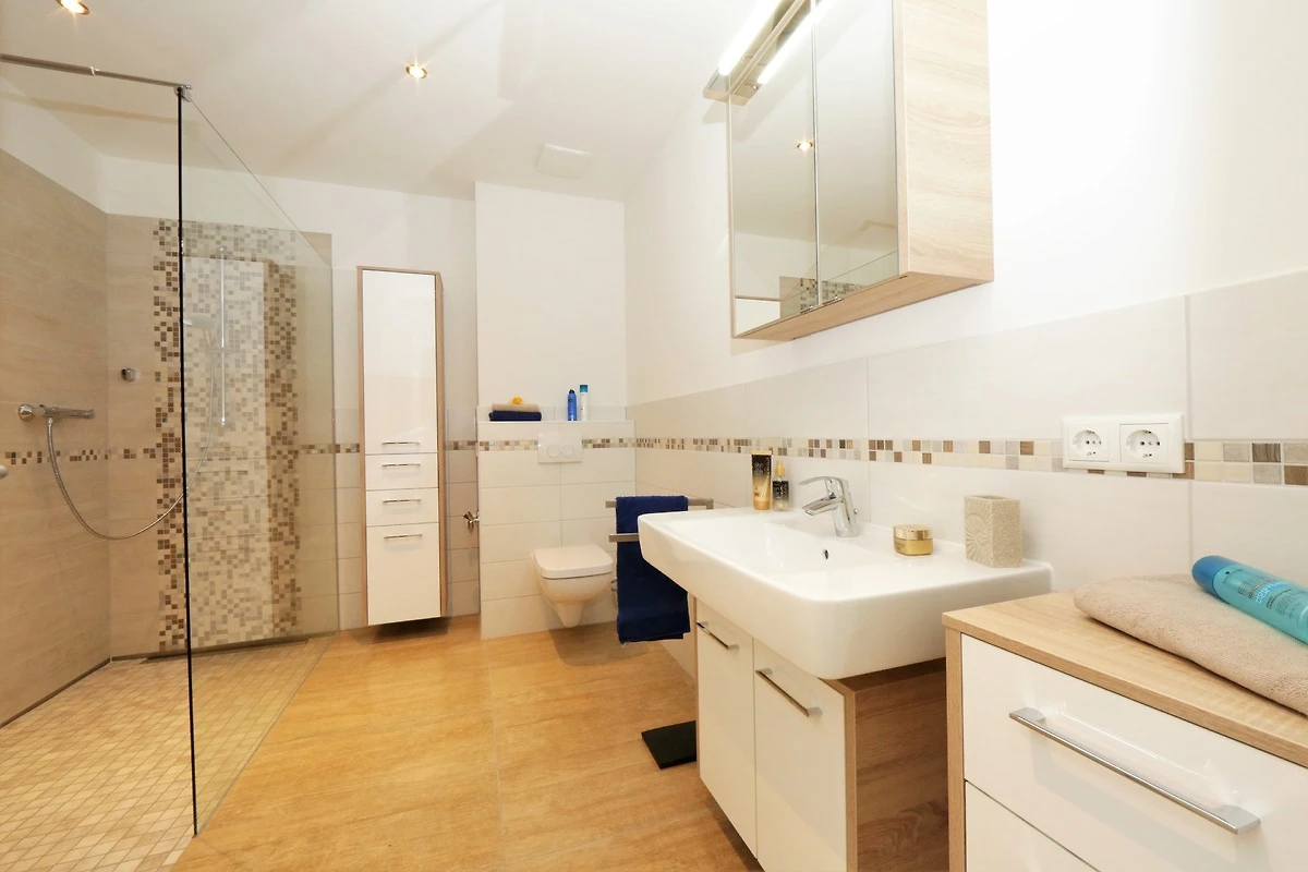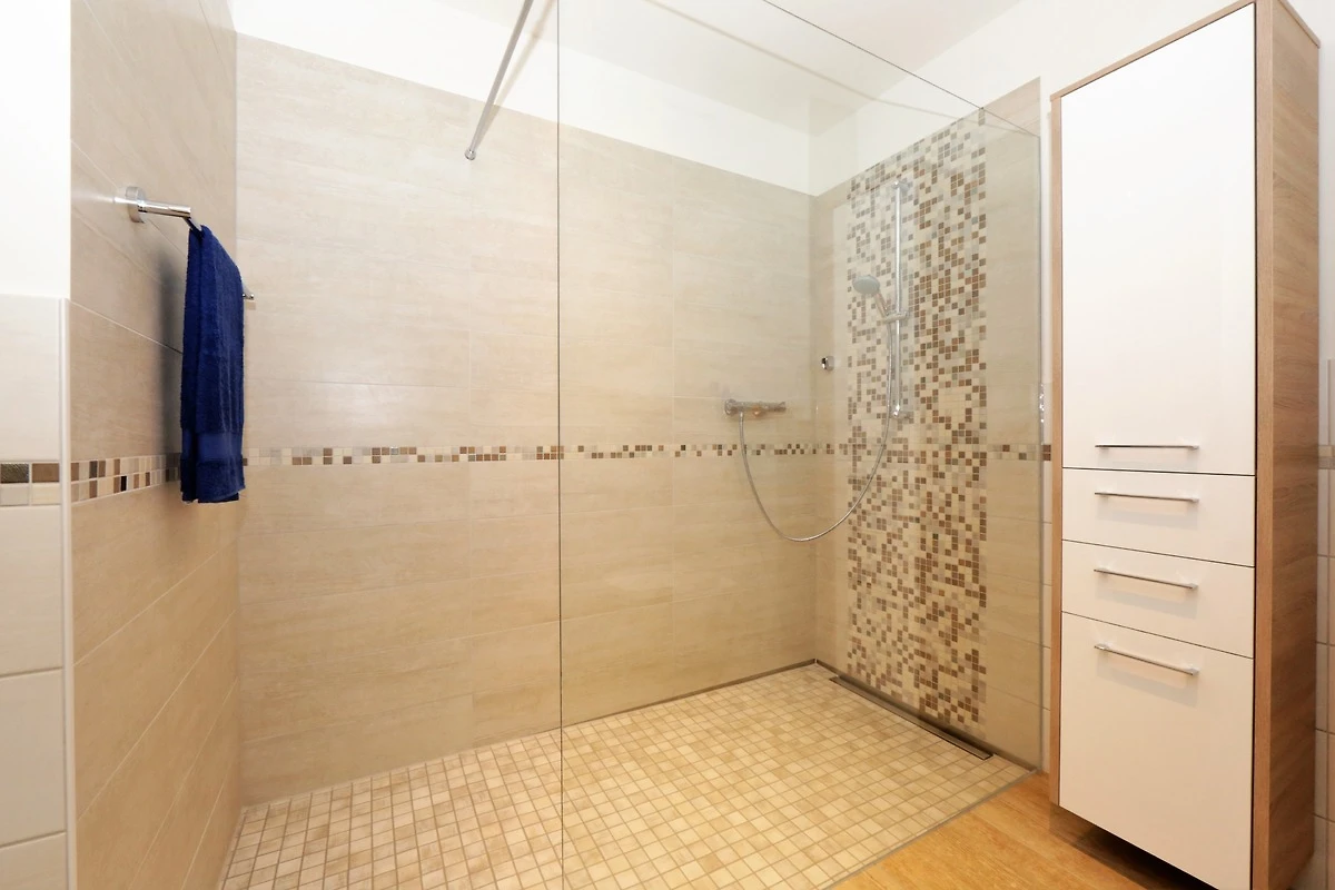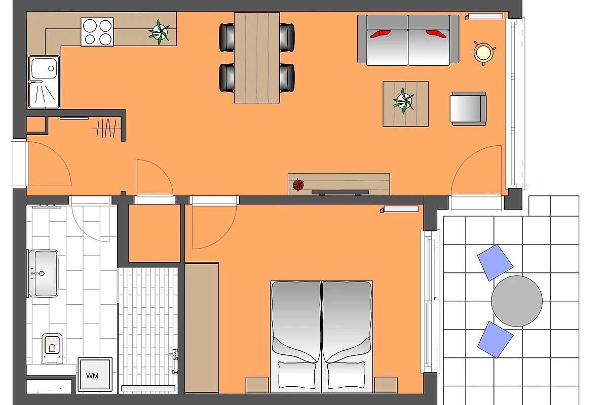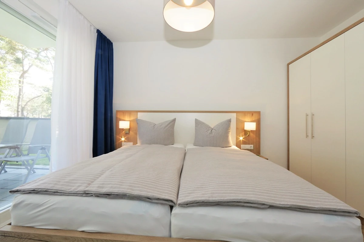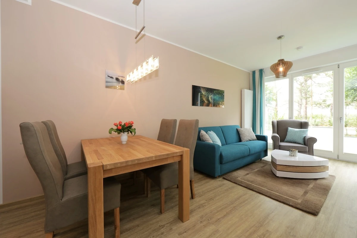 Die moderne, liebevoll eingerichtete Ferienwohnung mit 51 m² Wohnfläche befindet sich im Erdgeschoss der Strandresidenz. Die grosse überdachte Terrasse zur Promenade lockt die Gäste schon zum Frühstück ins Freie. Die Wohnung ist individuell und komfortabel ausgestattet und bietet 2-4 Personen Platz für einen erholsamen Urlaub am Meer. Der offene Wohnraum bietet Ihnen eine gemütliche Sitzecke mit einem bequemen Sofa (Liegefläche 160 x 200), einem Sessel und Flat TV. Die Küchenzeile incl. Backofen, Ceranfeld, Kühlschrank, Geschirrspüler, Mikrowelle etc. sowie der Essplatz sind offen im Wohnraum integriert. Das geräumige Schlafzimmer ist mit einem Doppelbett mit getrennten Matratzen (90 x 200) und einem grossen Kleiderschrank eingerichtet. Die Terrasse lässt sich sowohl vom Wohn- als auch vom Schlafzimmer betreten. Das grosszügige, moderne Bad ist mit einer ebenerdigen Dusche und Waschtisch/WC ausgestattet.