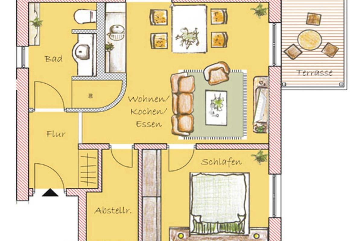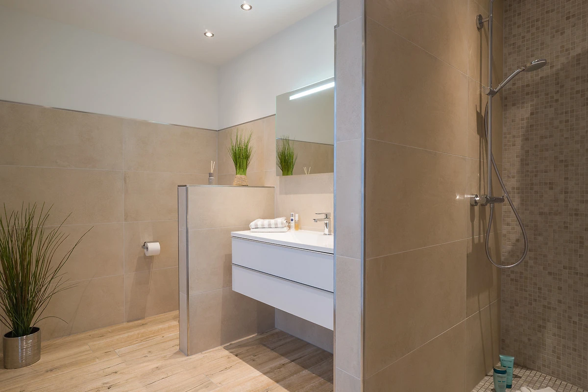 Das modern und freundlich ausgestattete Badezimmer verfügt über eine ebenerdige Dusche, einen schönen Waschtisch mit genügend Aufbewahrungsmöglichkeiten sowie einem WC. Für eine behagliche Wärme an kälteren Tagen sorgt in der kompletten Wohnung die Fussbodenheizung. Über den Wohnbereich erreichen Sie die Terrasse, wo Sie bereits morgens die Sonne geniessen können.