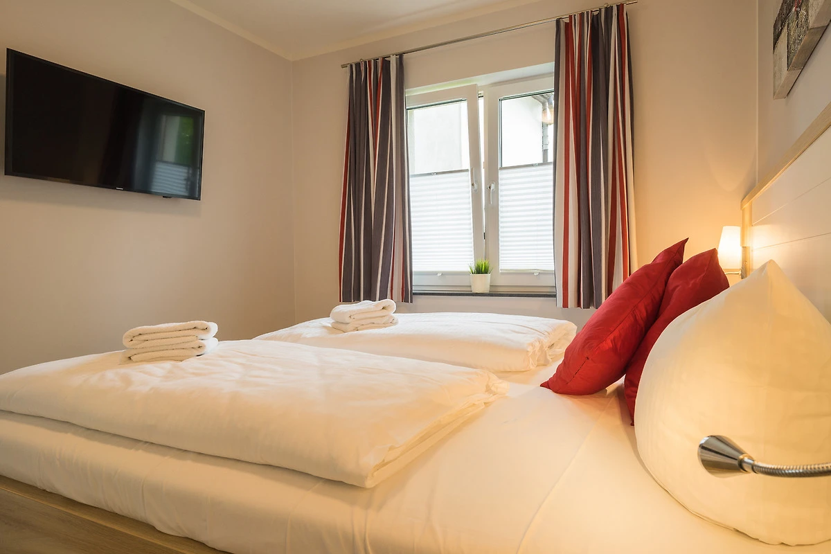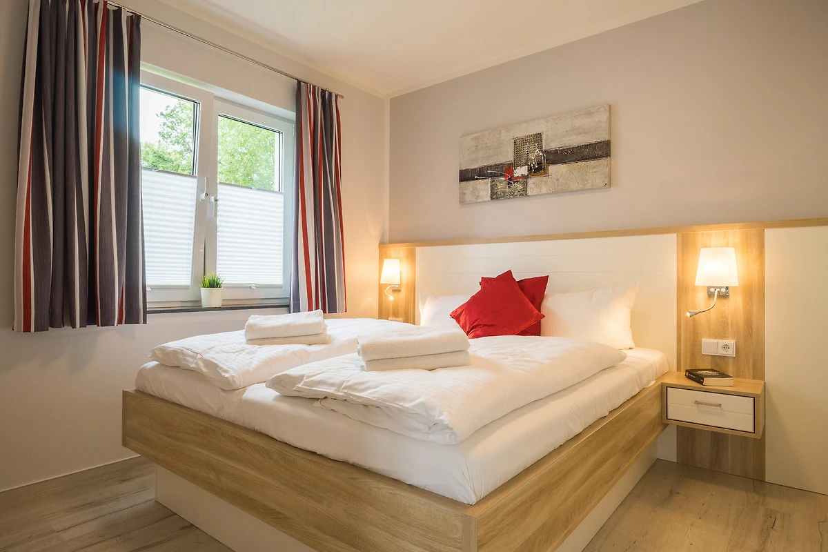 Zum hell eingerichteten Wohnbereich gehört die zum Relaxen einladende Couchecke mit Schlaffunktion (190cm x 150cm), ein moderner Couchtisch sowie ein Esstisch, der Platz für 3 Personen bietet. Flat- TV und Radio/CD Anlage sind selbstverständlich enthalten. Die im Wohnraum integrierte Küchenzeile ist mit Induktionskochfeld, Backofen, Geschirrspülmaschine und Kühlschrank inkl. Gefrierfach ausgestattet. Das helle Schlafzimmer verfügt über ein komfortables Doppelbett mit getrennten Matratzen (90cm x 200cm) sowie einem zweiten Flat-TV. Ausreichend Stauraum ist im grossen Kleiderschrank enthalten.