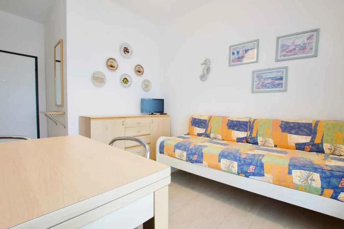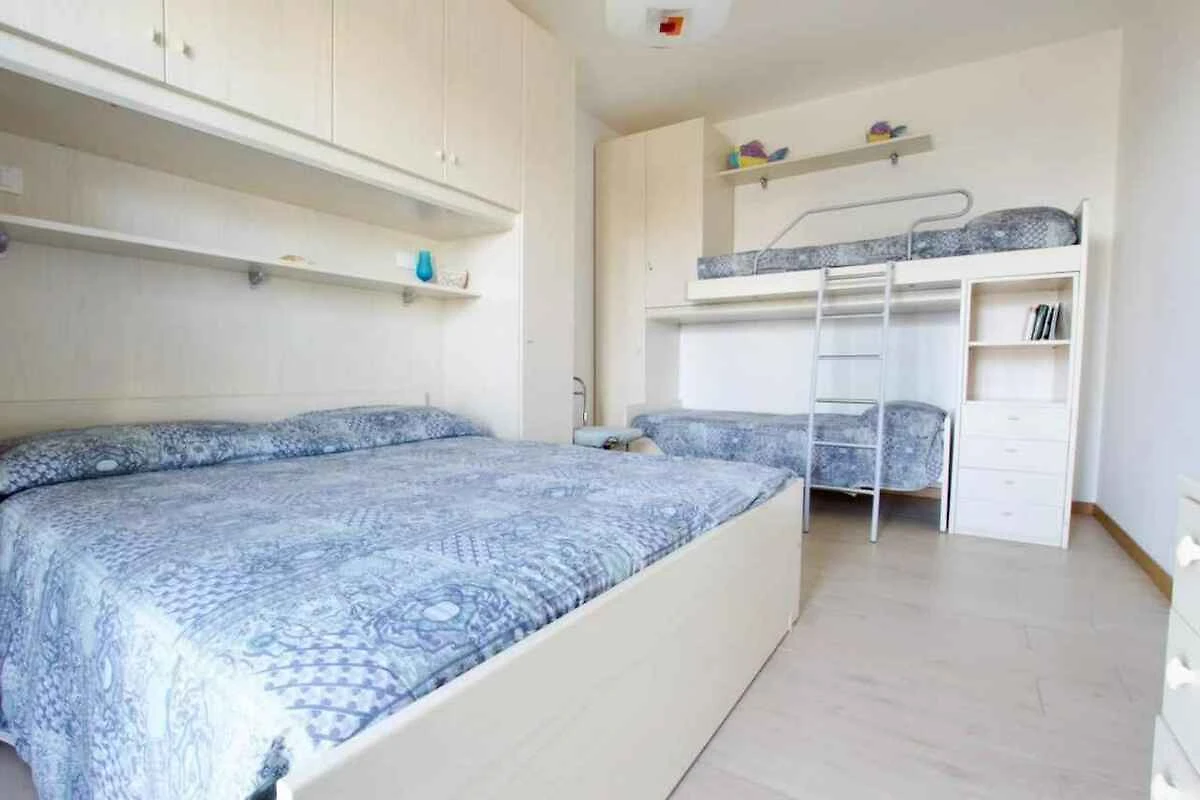 Wohnzimmer mit 1 Zusatzbett auf Couch/Sofa, TV, Essecke und Zugang zum Balkon. Schlafzimmer mit 1 Doppelbett, 1 Etagenbett und Zugang zum Balkon. Küche mit Gasherd und Kühlschrank. Bad mit Waschmaschine, Dusche, 1 Waschbecken, WC und Bidet.
