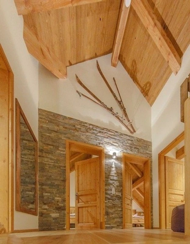 Die verarbeiteten gebürsteten Lärchenbohlen geben dem Chalet seine ganz eigene ursprüngliche Note.
