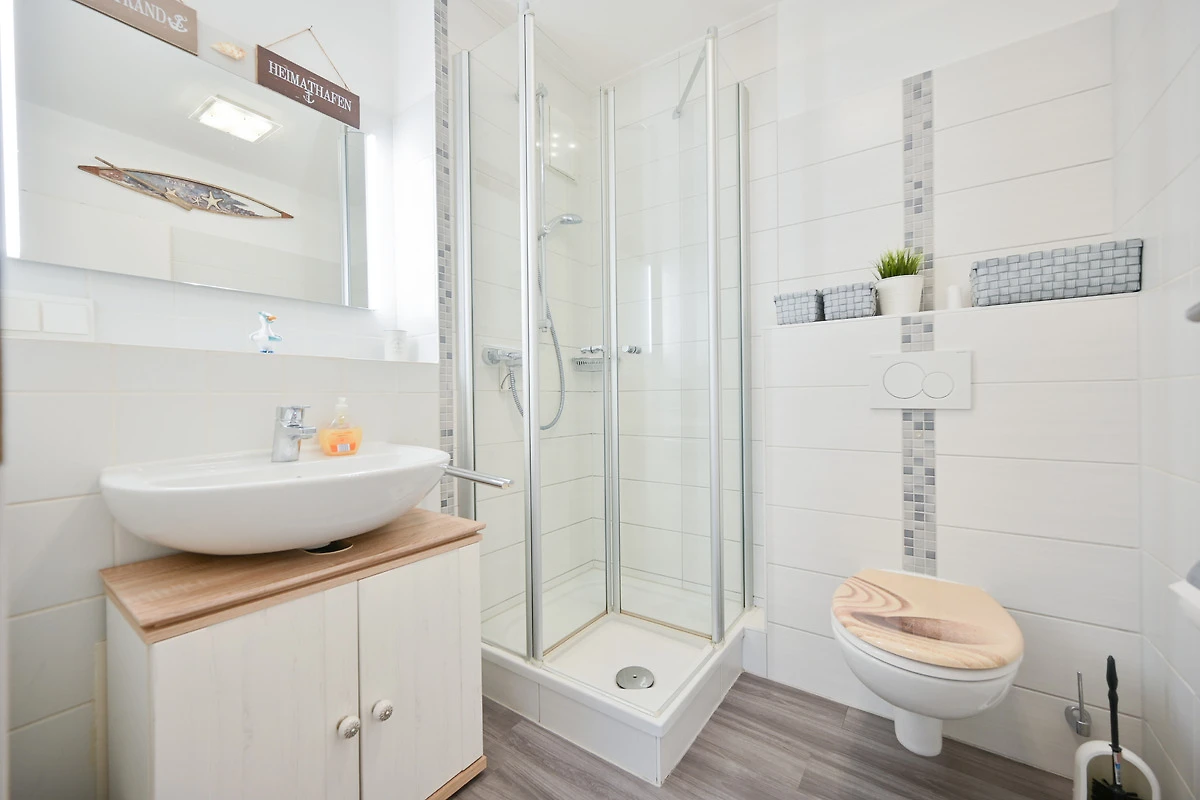 Das modernisierte Bad verfügt über ein WC, eine Dusche mit niedrigem Einstieg, helles Licht, einen grossen beleuchteten Spiegel sowie einen Kosmetikspiegel, genügend Stauraum für eure Badutensilien und einen Fön.