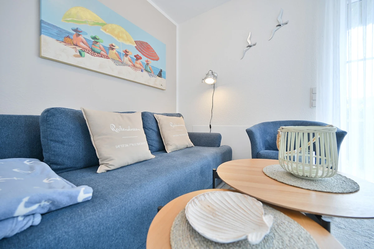 Die Fewo verfügt über einen Wohnschlafraum mit neuem Schlafsofa (150 x 200 cm mit extra Auflage), Relaxsessel und Leselampe, Couchtisch, Internetradio mit CD sowie Satelliten -Smart-TV.