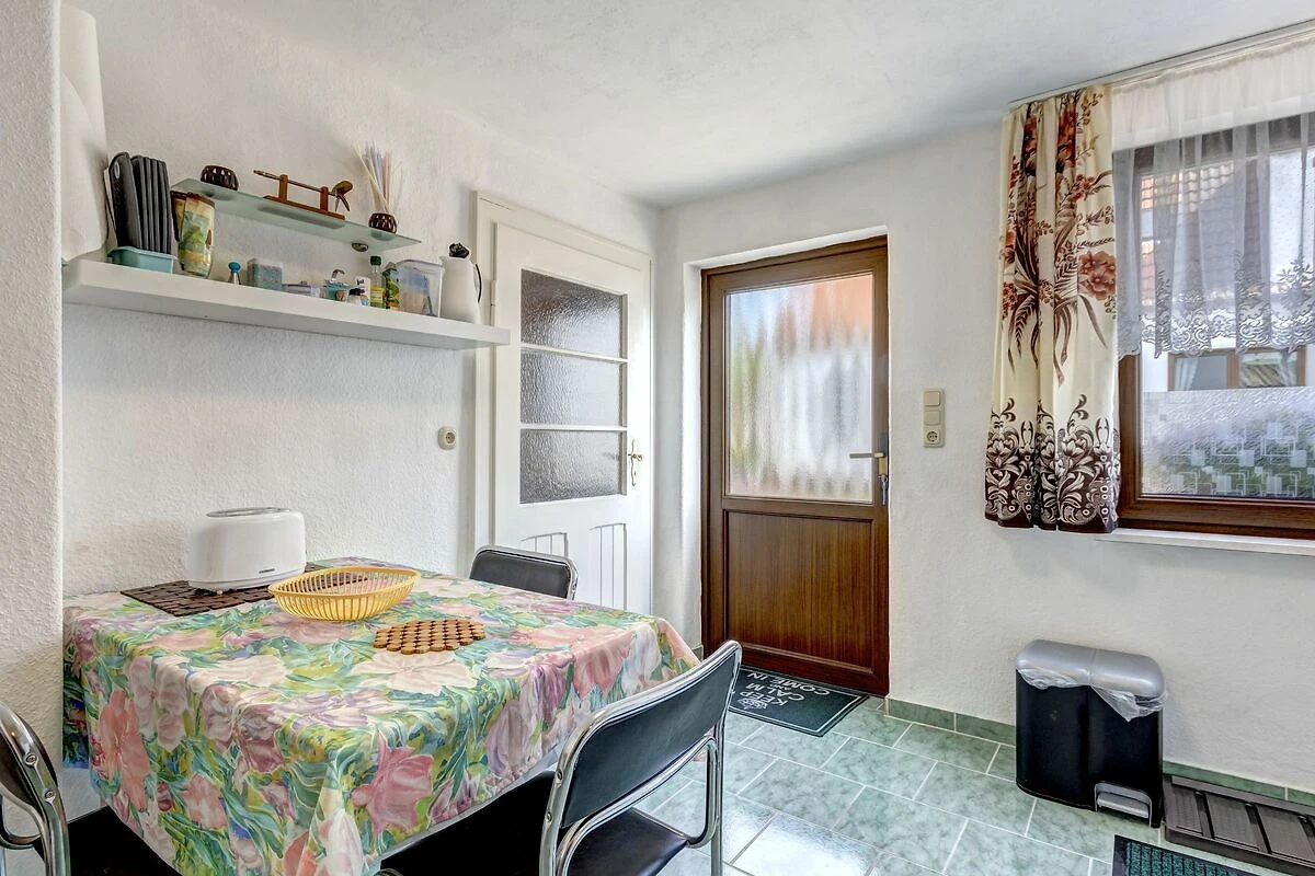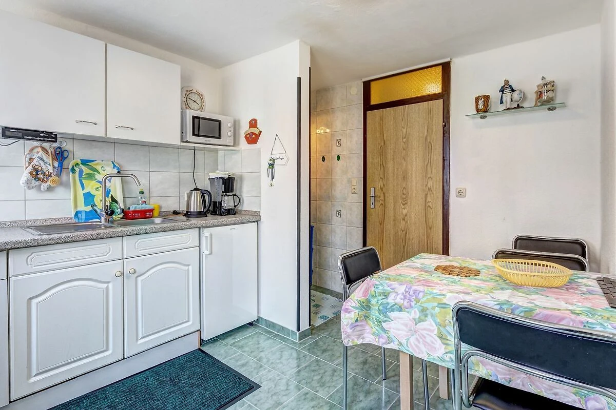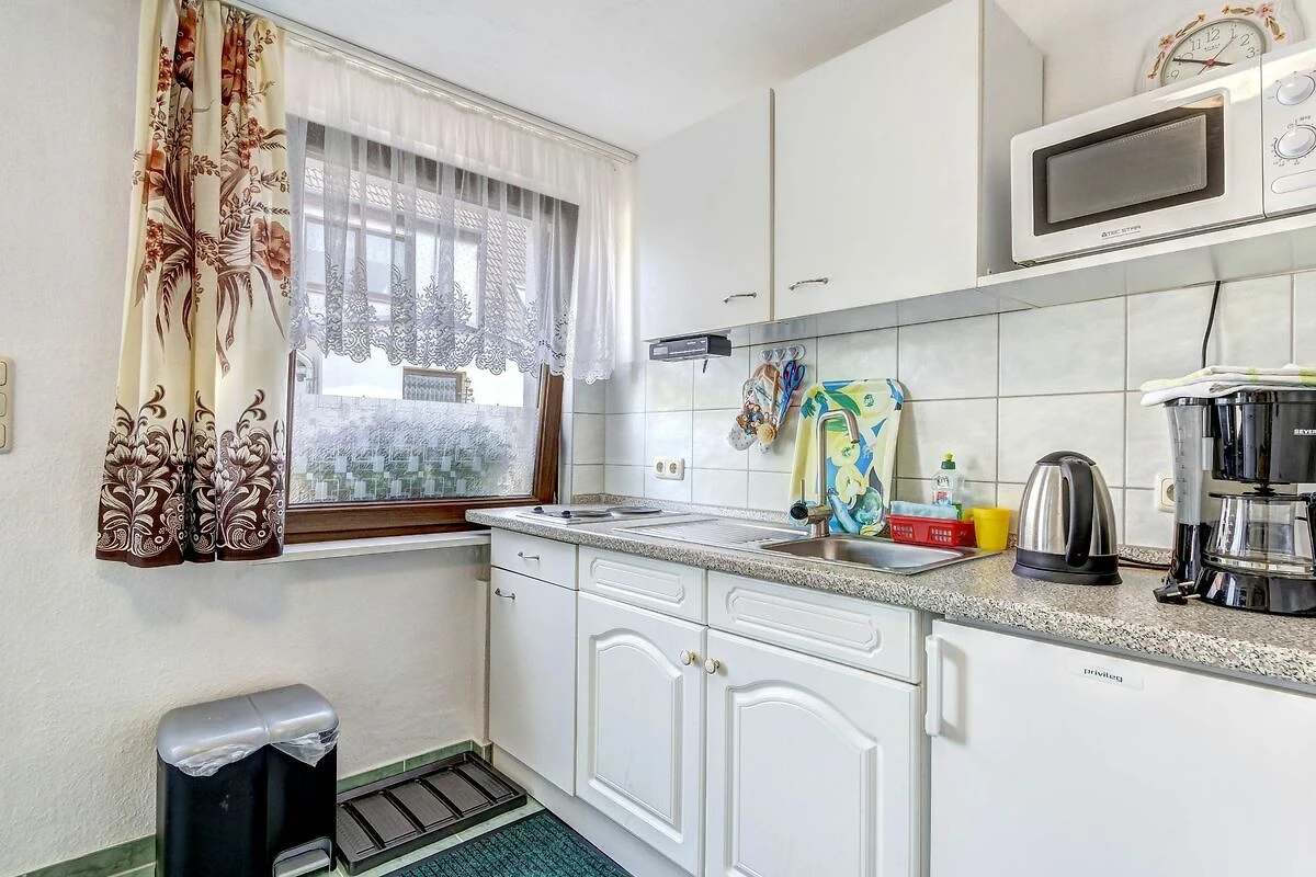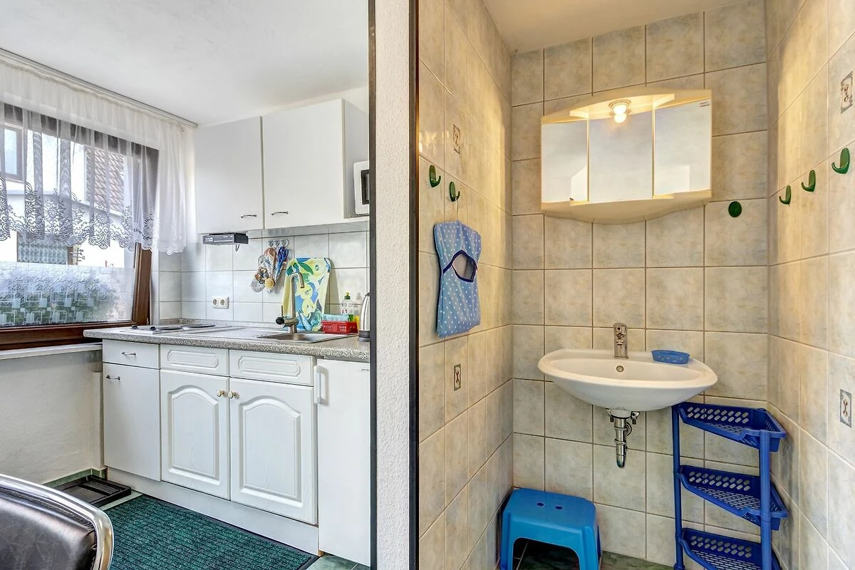 In der separaten Küche erwartet Sie ein Esstisch für 4 Personen sowie eine kleine Küchenzeile, die mit einem Kochfeld, Kühlschrank mit Frostfach, Mikrowelle und Toaster bestens ausgestattet ist. Hier können Sie nach Herzenslust Ihre Lieblingsgerichte zubereiten. Der morgendliche Kaffee oder Tee ist dank Kaffeemaschine und Wasserkocher im Handumdrehen zubereitet - der perfekte Start in den Tag!