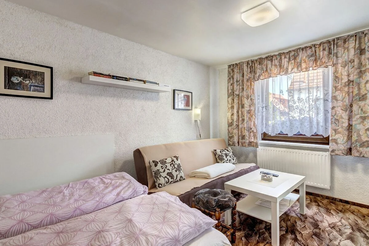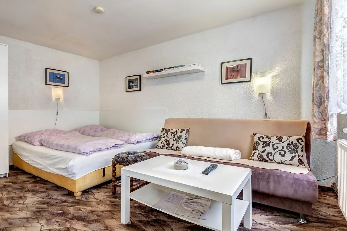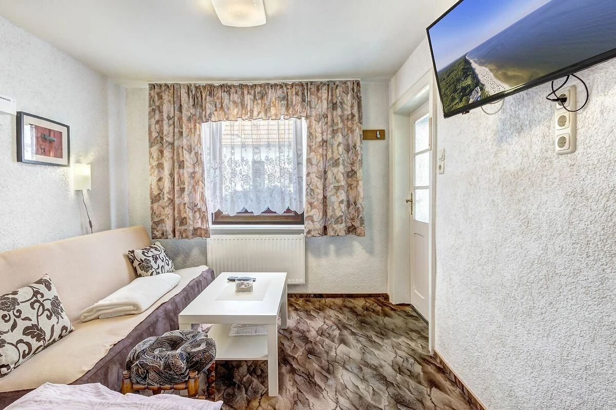 Der Bungalow überzeugt durch eine durchdachte Aufteilung: Das kombinierte Wohn- und Schlafzimmer ist gemütlich eingerichtet und bietet ein bequemes Doppelbett sowie eine zusätzliche Liege für entspannte Momente. Ein Schwingstuhl lädt zum Schmökern oder gemütlichen Verweilen ein, während ein Röhrenfernseher für die nötige Unterhaltung sorgt.
