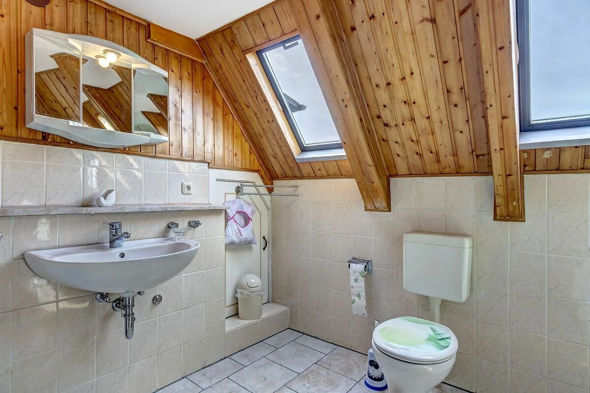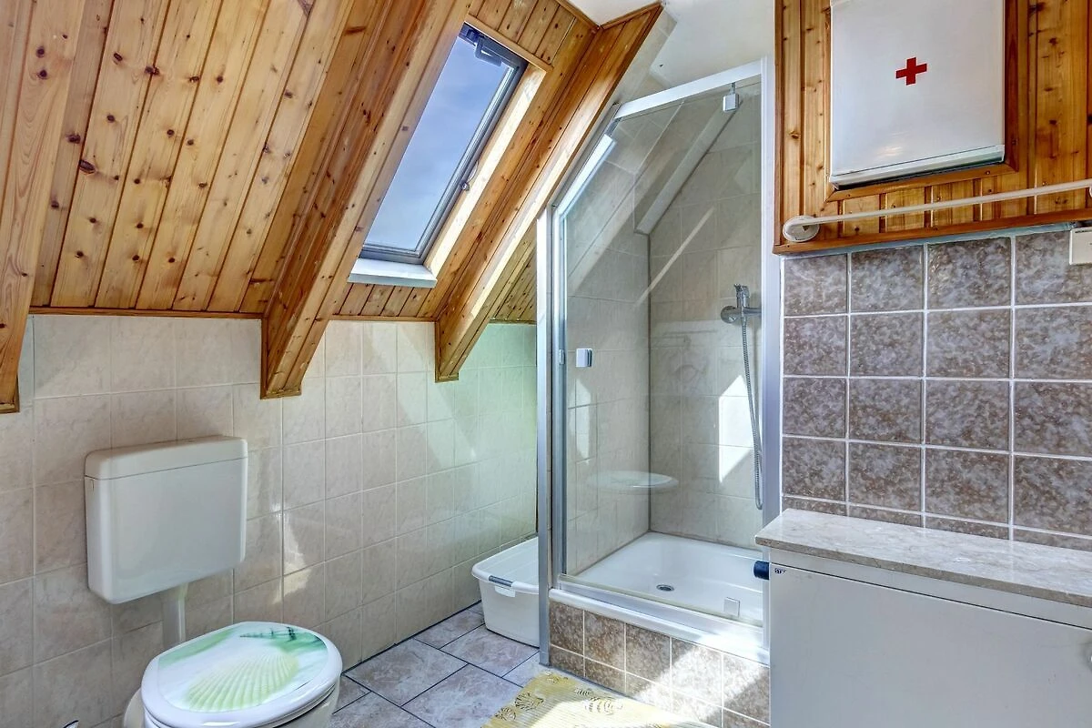 Das Badezimmer mit Dachschräge verfügt über eine erfrischende Dusche und WC. Für Ihre Bequemlichkeit stehen Ihnen nützliche Verbrauchsmittel wie Seife und Spülmittel zur Verfügung.