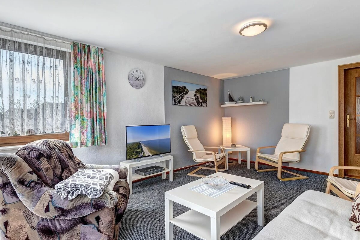 Die Wohnung bietet zwei einladende Schlafzimmer, jeweils mit einem komfortablen Doppelbett, sowie ein helles und grosszügiges Wohnzimmer mit einer gemütlichen Sitzecke, die zum Verweilen und geselligen Beisammensein einlädt. Dezente Dekoelemente erinnern an die Nähe zum Strand und der frischen Ostseeluft, die durch die grossen Fenster ins Innere strömt. Ein Flachbildfernseher und zwei Schwingstühle sorgen für zusätzlichen Komfort.