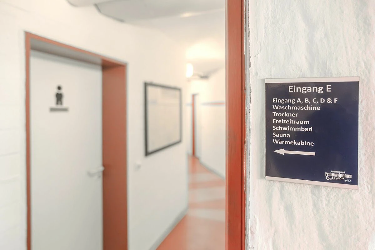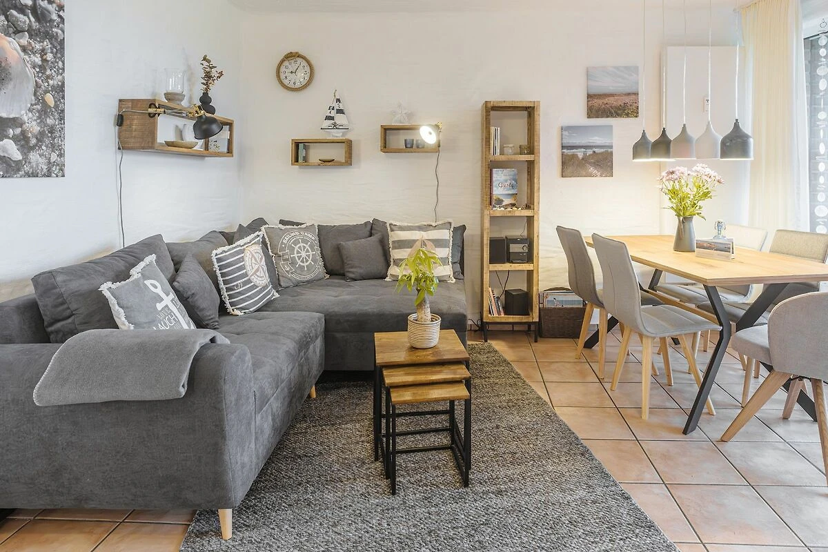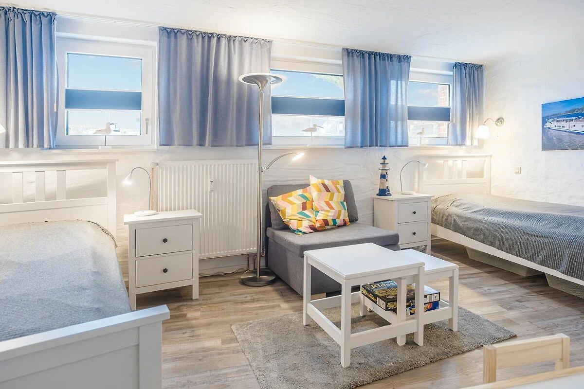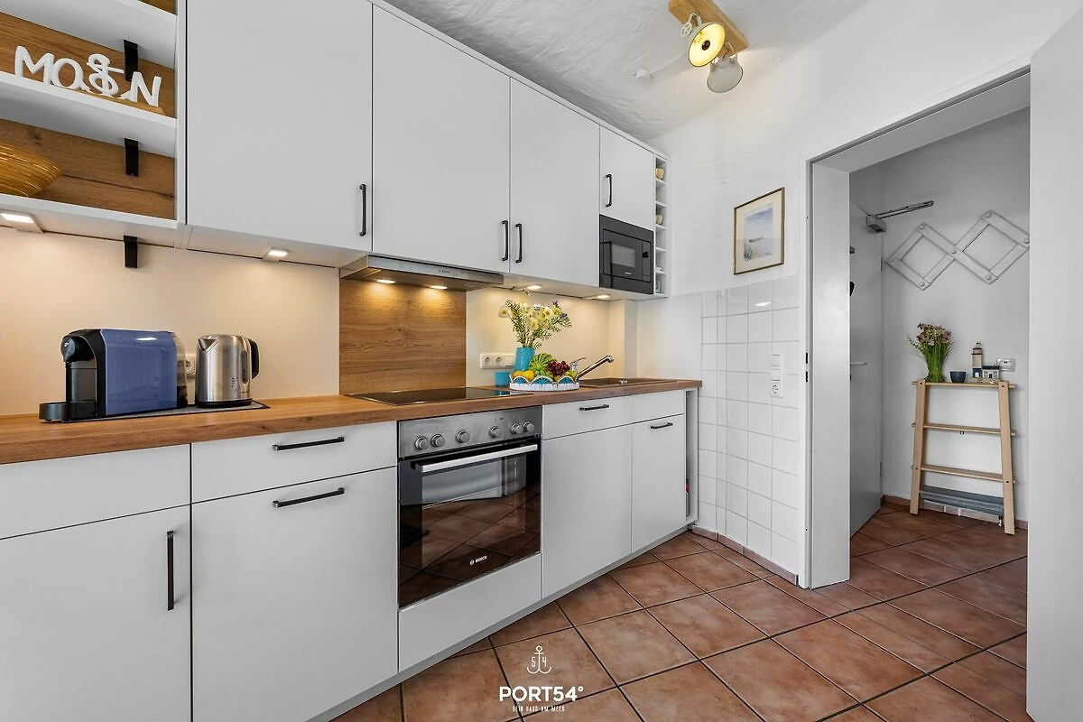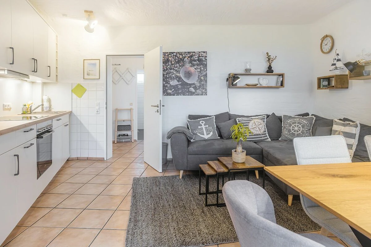 Nur 50m vom schönen Sandstrand entfernt, umgeben von unberührter Natur nahe dem Landschaftsschutzgebiet „Geltinger Birk“ und den Orten Gelting, Maasholm und Kappeln in unmittelbarer Nähe wohnen Sie in der hochwertig eingerichteten Ferienwohnung "Meerblick", die auf 51m² Platz für 5 Personen bietet, ebenerdig mit Terrasse und Blick auf die Ostsee. Das Interieur der Unterkunft ist modern und skandinavisch gemütlich aufeinander abgestimmt. Ein komfortables Ecksofa für bis zu 5 Personen mit angenehmer Beleuchtung und Teppich lädt zum gemütlichen Lesen, zu einem Glas Wein oder Fernsehen ein. Der an der Wand befestigte und schwenkbare 40‘ Fernseher ist von jedem Sitzplatz im Wohn- und Essbereich einsehbar. Am langen, hochwertigen Holz-Esstisch genießen Sie das Wohlfühlambiente, nicht nur beim zubereiteten Essen, sondern gerne auch bei Brett- und Kartenspielen, begleitet von Musik der Stereoanlage. Zum Essbereich gehört die modern ausgestattete Einbauküche, die keinen Wunsch an Küchenutensilien und „kleinen Helfern“ offen lässt; Cerankochfeld, Backofen, Geschirrspüler, Kaffee- und Kaffee-Kapselmaschine (Tassimo), Wasserkocher, Toaster, Handmixer, Eierkocher und ganz viel Platz für „dütt un datt“ inbegriffen. Auch eine hochwertige Einbau-Mikrowelle istr vorhanden. Damit Sie für jede Situation die richtige Stimmung erzeugen können, stehen Ihnen zahlreiche Beleuchtungsmöglichkeiten zur Verfügung. Das Schlafzimmer besteht aus einem Doppelbett (180 x 200 cm), 2 Nachttischen, einer offenen Kleider-, Regal- und Schubladenkombination mit ausreichend Platz für Ihre Urlaubsgarderobe, einer Ambiente-Leuchte, 2 Wand- und 2 Leselampen, Verdunkelungs-Plissées und Vorhängen sowie einem eingebauten Fliegengitter. Das ebenerdige Tageslichtbad besteht aus einer Dusche mit Glasabtrennung und Duschregal, Handtuchwärmer, Föhn, Kosmetikspiegel und Waschtisch mit geräumigen Unterbauschrank. Das zweite Schlafzimmer im Souterrain besteht aus 2 Einzelbetten (90 x 200 cm), mit je einer Wandleuchte, einer Leselampe, einer geräumigen Kommode, ein auf 90 x 200 cm ausziehbarer Schlafsessel mit Matratzenauflage im Abstellraum sowie Couchtisch, Teppich, Deckenfluter mit integrierter Leselampe, Dartscheibe und - falls Sie mit kleinen Kindern anreisen: ein Spielteppich mit kleinen Autos, Maltisch und 2 Stühlchen vervollständigen das Interieur. Ferner ist das Zimmer ebenfalls mit Verdunkelungs-Plissées, Vorhängen und im Fenster integriertem Fliegengitter ausgestattet. Zusätzlich finden Sie Sonnenschirm, Staubsauger, Wäscheständer, Wäschekorb, Dusch-Sitz-Hocker, 2-Trittleiter, Bügeleisen und -brett, Kinderhochstuhl, Baby-Reisebett, Kinder-Rausfallschutz und 2 Sandschaufeln im Abstellraum. Ein kostenloser Parkplatz ist ebenfalls für Sie vor der Unterkunft reserviert. Auf der Terrasse mit den hochwertigen Alu-, Holz-Terrassenmöbeln können Sie sich mit Blick auf die Ostsee und der gepflegten Gartenanlage wohlfühlen. Die großzügige Wiese, die sowohl zur Aktivität als auch zur Entspannung einlädt, kann von der Terrasse aus der direkte Weg zum Strand sein. Es erwartet Sie in der Zeit von Ostern bis zum letzten Wochenende im September ein kostenloser Strandkorb ohne Strandgebühr oder Kurtaxe. Zudem bietet die Apartmentanlage einen kostenfreien Zugang zum Schwimmbad in der Zeit von Ostern bis Oktober, einen Aktivraum mit Tischkicker und einer Tischtennisplatte (Schläger und Bälle bitte selbst mitnehmen) sowie einen gemeinschaftlich genutzten Wellnessbereich mit einer Infrarot-Sauna, die mit 2€-Münzen betrieben wird, eine Wärmekabine, Waschmaschine und Trockner gegen kleine Gebühr sowie einen abschließbaren, gemeinschaftlichen Fahrradraum.